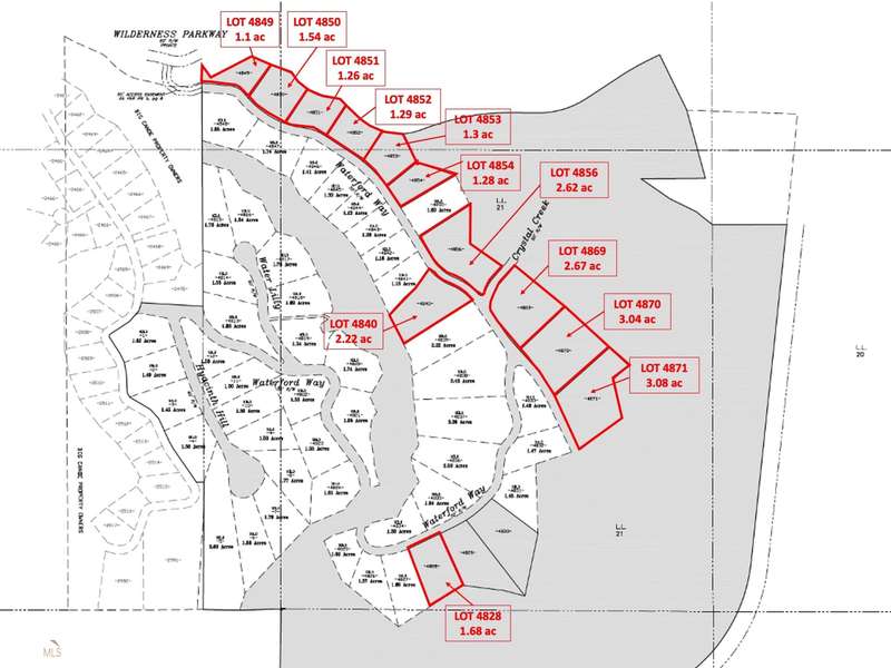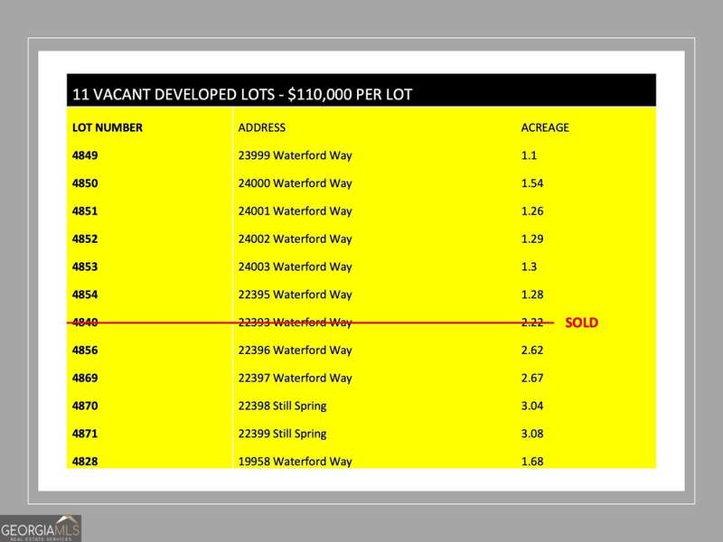PROPERTY OVERVIEW The Norton Commercial Acreage Group is proud to present 11 Fully developed, final platted lots in the Waterford Section of the wildly successful Big Canoe private residential and golf community in eastern Pickens County. The property consists of 11 residential lots ranging from 1.1 to 3.08 acres. With new homes in Big Canoe selling at an average of $680,000 over the past 12 months, most homes in the Waterford are selling well over $1,000,000. The market is solid for a new residential development in Waterford. All utilities are in place and lots will require on site septic systems. Sites are wooded with some of the most gently rolling topography found in the area! Despite the increase in mortgage interest rates since July 2022, there is still a demand for new construction in this area and a developer is likely to have great success in selling a mix of basement, slab and speculative homes in this community. LOCATION OVERVIEW Located close to GA Hwy 53 and convenient to Hwy 575 and the greater Atlanta Metropolitan area, the subject property is roughly 13 miles from Jasper and 15 miles from Dawsonville with many of the commercial necessities in the nearby Big Canoe community. Both Dahlonega and Ball Ground are only a short drive away (15-20 miles) offering easy access to great restaurants, entertainment and attractions. The Dawsonville Premium Outlets are only 30 minutes away. In the Tate ES (11 miles) and Pickens County MS, JHS and HS (15 miles) districts.