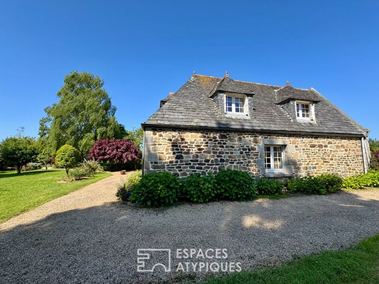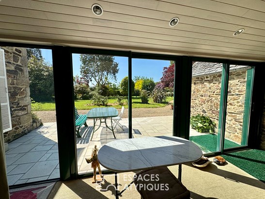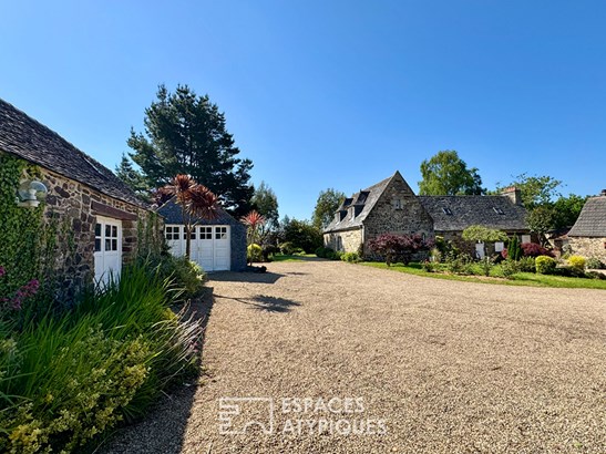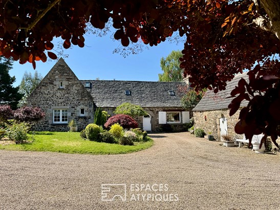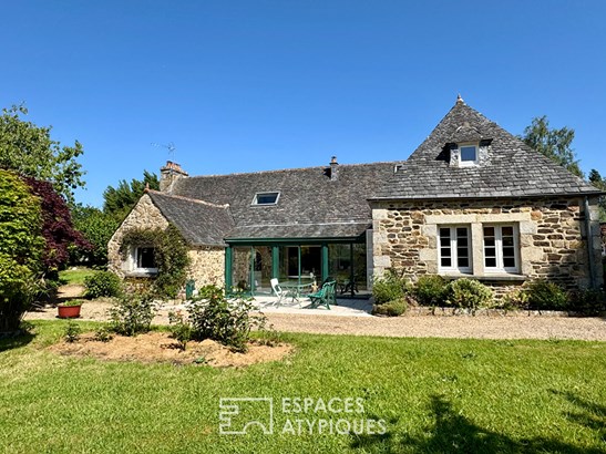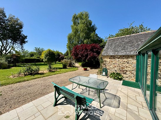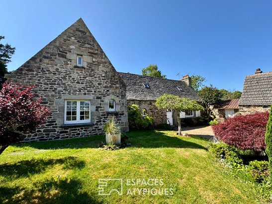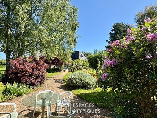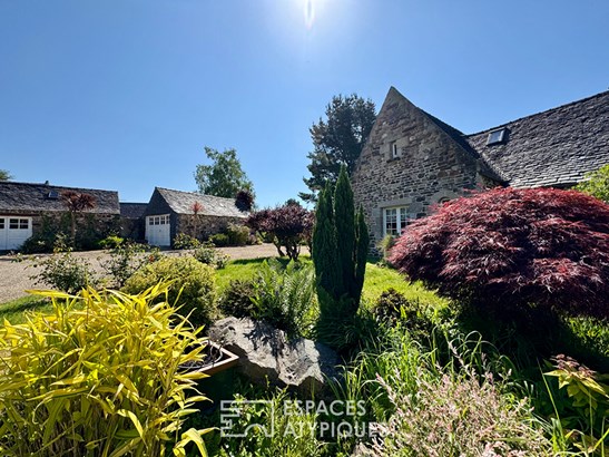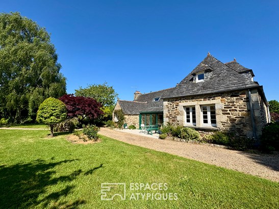 With a living area of approximately 160 sqm, the main house is accompanied by a garage, a boiler room and an annex, forming a coherent, homogeneous and functional whole. Typical of rural Breton architecture, the building is organized harmoniously. Each building is covered with a natural slate roof, in excellent condition, which underlines the architectural unity and testifies to rigorous maintenance. The volumes are clear, the lines readable, and the whole forms a balanced silhouette, suitable for multiple uses: family life, reception project, independent activity : The property extends over a plot of 5,700 sqm, in a building zone, opening up beautiful prospects for expansion or division. A part of more than 2,000 sqm also offers the possibility of building a second home. The garden, carefully landscaped, offers a great botanical richness: maples, hydrangeas, ornamental trees, evergreen hedges and flower beds create a green, soft and changing atmosphere.