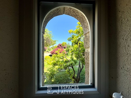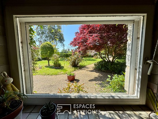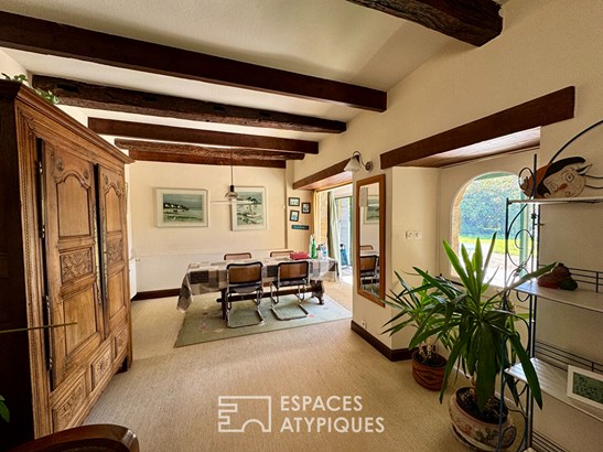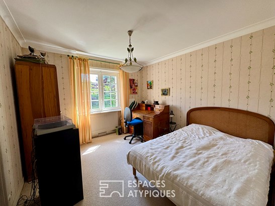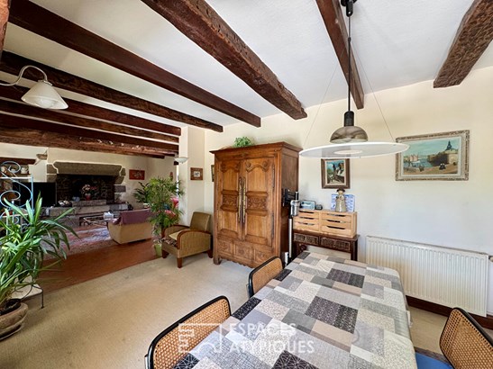 From the entrance, this house reveals an interior to reinterpret, offering a healthy and bright base for a renovation project in your image. The ground floor offers a fluid distribution between the living rooms. The living room is organized around an imposing granite fireplace, which affirms the character of the place, while the ceiling is punctuated by decorative beams. A large frame opens the room onto the courtyard and the flowerbeds, in a bright and soothing atmosphere. The kitchen, in a row, will require a complete renovation. It offers direct access to the living space, suggesting potential for decompartmentalization or functional transformation. On the south side, the veranda constitutes a pleasant extension, flooded with light, opening onto the garden and its varied species. All the openings of the house, including those on the upper floor, offer beautiful views of the landscaped garden, bringing light and tranquility to each room.