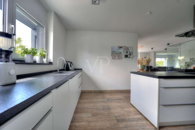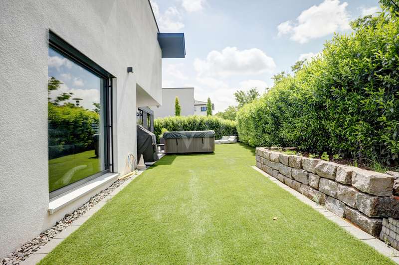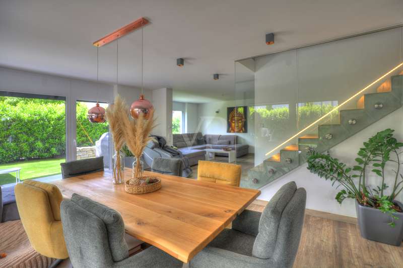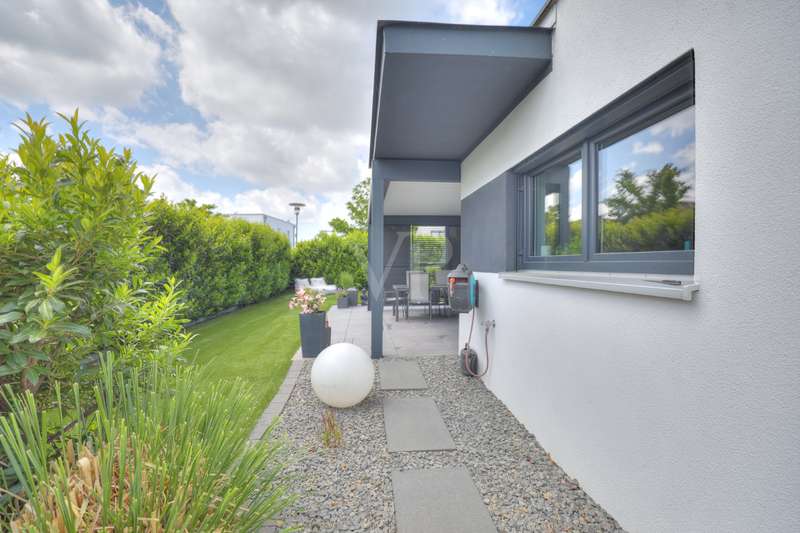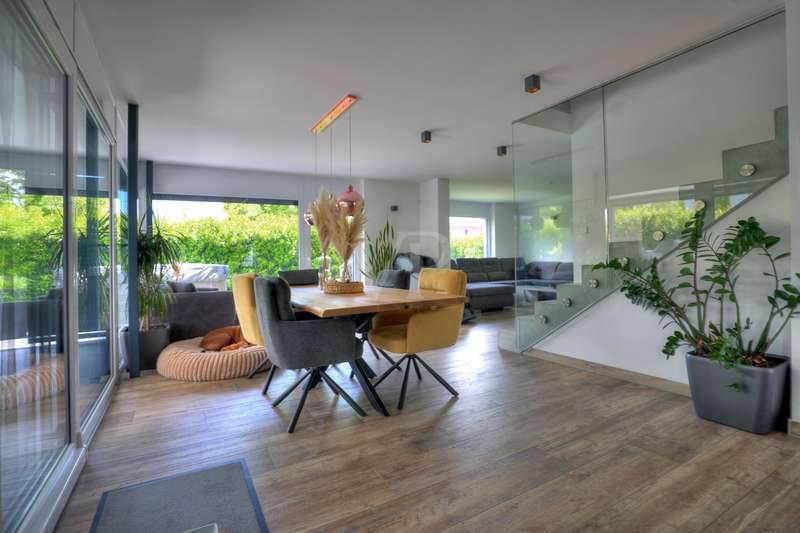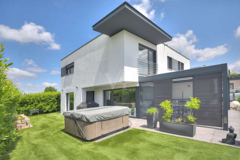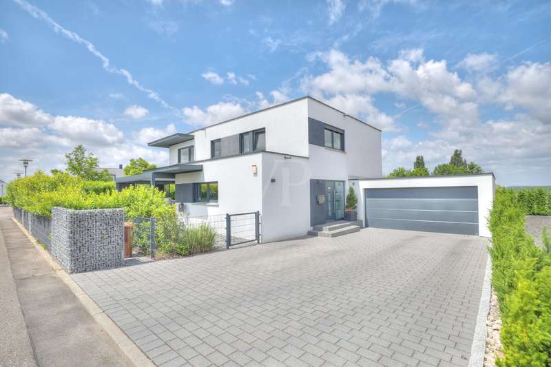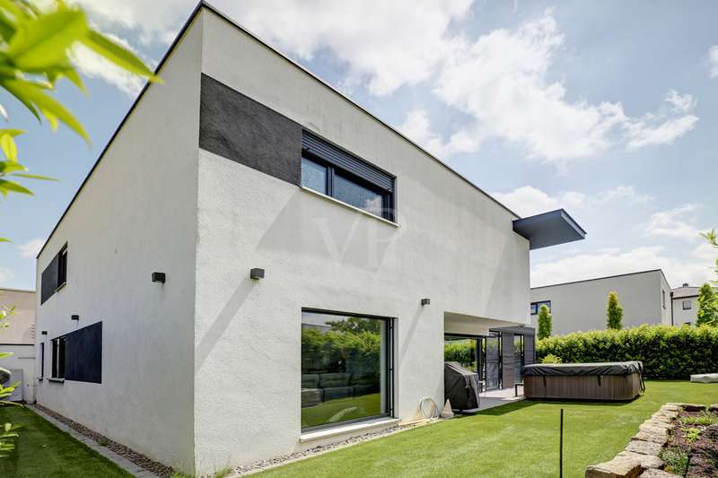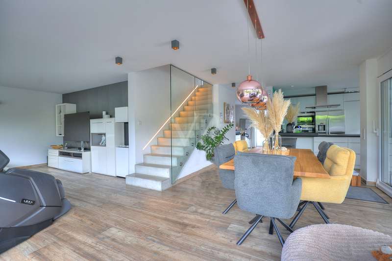 Move in and feel good This stylish detached house in the timelessly elegant Bauhaus style was built at the end of 2016 on a 539 m² plot in the quiet Neckarsulm suburb of Amorbach. The property combines architectural clarity with the highest quality of living and meets the highest standards of design, comfort and technology. With around 219 m² of living space on two generously proportioned levels, you can expect a home that leaves nothing to be desired: As soon as you enter the property, a spacious foyer welcomes you and conveys a sense of arrival. All living spaces are fitted with high-quality Italian wood-effect tiles and pleasant underfloor heating. A practical utility room provides functional storage space and makes everyday life much easier. Directly adjacent is a modern daylight bathroom with a walk-in shower and a bright bedroom, which is currently used as a guest room. An absolute highlight of the first floor is the approx. 60 m² open-plan living and dining area, which flows seamlessly into the high-quality Nolte granite fitted kitchen. Equipped with modern Siemens appliances, it invites you to cook and enjoy in style. A practical pantry is directly adjacent and offers plenty of storage space. Generous window fronts provide plenty of natural light and create a bright, inviting atmosphere - the perfect place to relax, live and be together. The sunny garden faces south-west and invites you to relax with plenty of privacy. The adjoining terrace is equipped with an electric slatted roof from Renson and sliding side elements, thus moving the living space outdoors. A whirlpool in the garden area provides relaxation on warm summer nights. An architecturally striking exposed concrete staircase with glass elements connects the two floors and underlines the modern character of the house. The spacious master bedroom with adjoining dressing area awaits you on the upper floor - a place to retreat to and feel good. An additional daylight bathroom with double washbasin, WC and shower is located directly next to it and completes this area. Two further bright rooms offer a variety of uses as a children's room, guest room or study. Particularly noteworthy is the exclusive wellness area with a high-quality Klafs bio-sauna, atmospheric colored lighting and an additional shower and bathtub - your private oasis of well-being in your own home. A modern air heat pump with integrated cooling function ensures a pleasant living climate. A large photovoltaic system enables an environmentally friendly energy supply, sustainably reduces operating costs and generates additional income through the feed-in. The intelligent smart home system controls the lighting, blinds and heating conveniently and efficiently. The highest security standards are guaranteed by a five-point locked, electric front door with fingerprint access and an alarm system with lever-open protection. A modern water softening system from Aquaperla reliably protects the building services from limescale deposits. The offer is rounded off by a spacious double garage with electric sectional door, as well as a directly adjoining boiler room with additional storage space. This home combines architectural elegance with intelligent technology and sustainable living comfort. We look forward to receiving your inquiry and to presenting this attractive property to you in person.