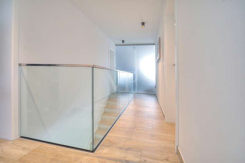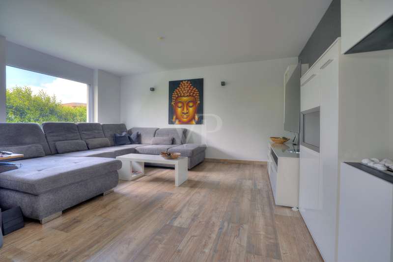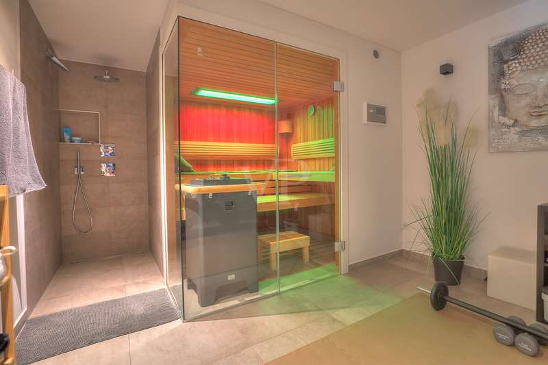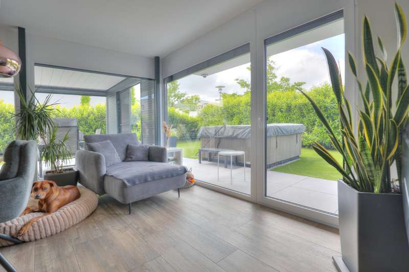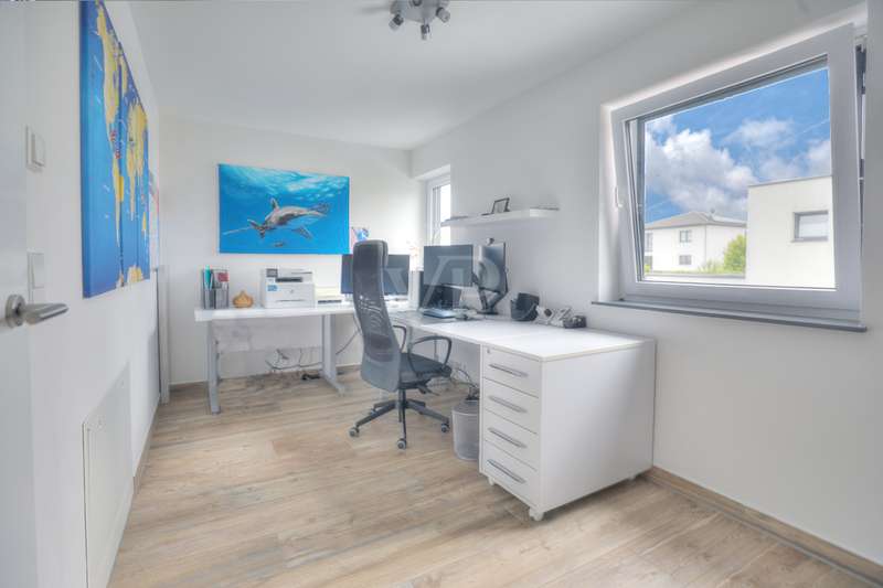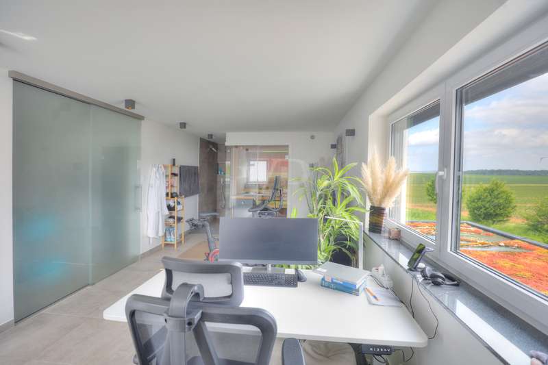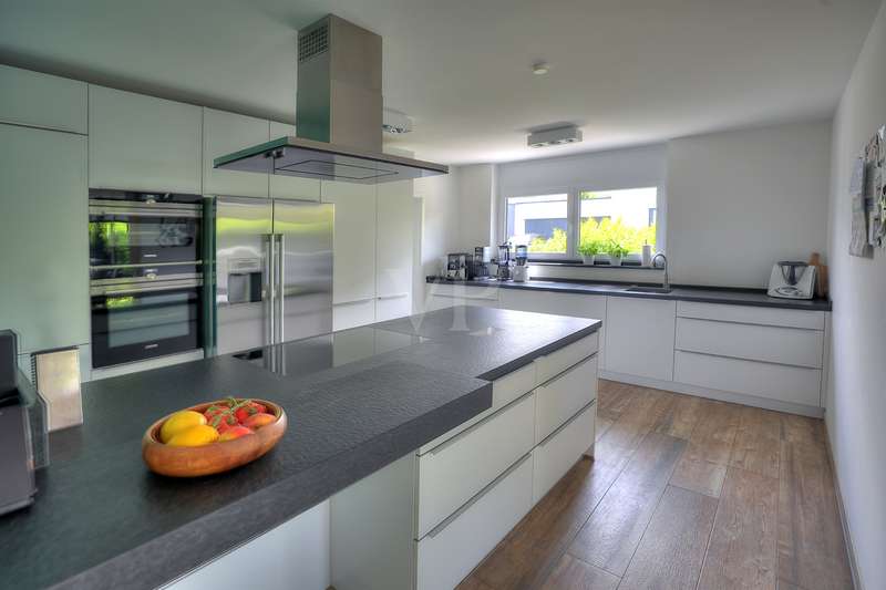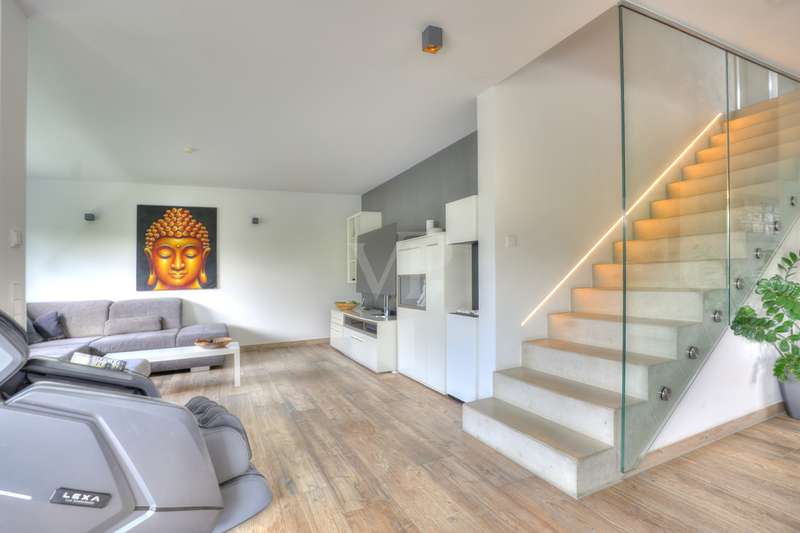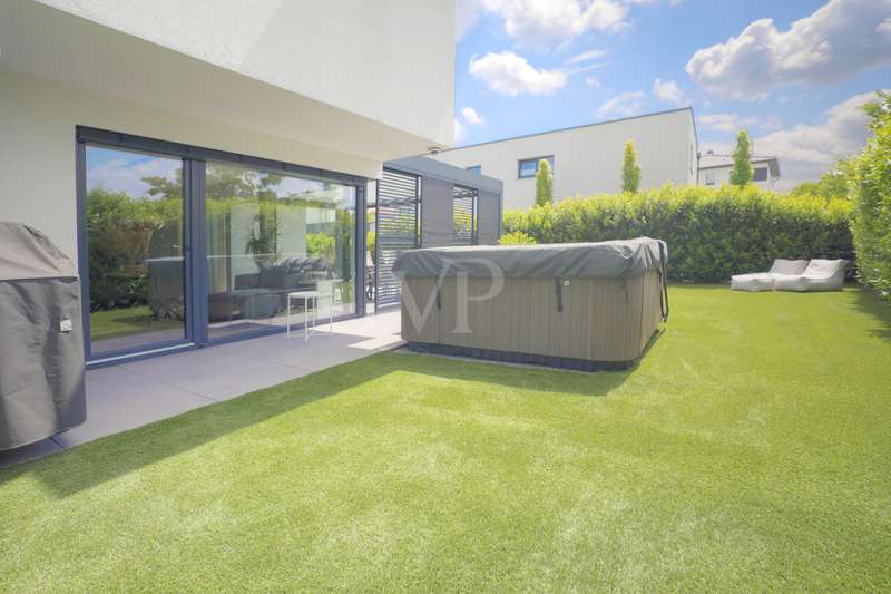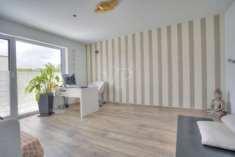 Move in and feel good This stylish detached house in the timelessly elegant Bauhaus style was built at the end of 2016 on a 539 m² plot in the quiet Neckarsulm suburb of Amorbach. The property combines architectural clarity with the highest quality of living and meets the highest standards of design, comfort and technology. With around 219 m² of living space on two generously proportioned levels, you can expect a home that leaves nothing to be desired: As soon as you enter the property, a spacious foyer welcomes you and conveys a sense of arrival. All living spaces are fitted with high-quality Italian wood-effect tiles and pleasant underfloor heating. A practical utility room provides functional storage space and makes everyday life much easier. Directly adjacent is a modern daylight bathroom with a walk-in shower and a bright bedroom, which is currently used as a guest room. An absolute highlight of the first floor is the approx. 60 m² open-plan living and dining area, which flows seamlessly into the high-quality Nolte granite fitted kitchen. Equipped with modern Siemens appliances, it invites you to cook and enjoy in style. A practical pantry is directly adjacent and offers plenty of storage space. Generous window fronts provide plenty of natural light and create a bright, inviting atmosphere - the perfect place to relax, live and be together. The sunny garden faces south-west and invites you to relax with plenty of privacy. The adjoining terrace is equipped with an electric slatted roof from Renson and sliding side elements, thus moving the living space outdoors. A whirlpool in the garden area provides relaxation on warm summer nights. An architecturally striking exposed concrete staircase with glass elements connects the two floors and underlines the modern character of the house. The spacious master bedroom with adjoining dressing area awaits you on the upper floor - a place to retreat to and feel good. An additional daylight bathroom with double washbasin, WC and shower is located directly next to it and completes this area. Two further bright rooms offer a variety of uses as a children's room, guest room or study. Particularly noteworthy is the exclusive wellness area with a high-quality Klafs bio-sauna, atmospheric colored lighting and an additional shower and bathtub - your private oasis of well-being in your own home. A modern air heat pump with integrated cooling function ensures a pleasant living climate. A large photovoltaic system enables an environmentally friendly energy supply, sustainably reduces operating costs and generates additional income through the feed-in. The intelligent smart home system controls the lighting, blinds and heating conveniently and efficiently. The highest security standards are guaranteed by a five-point locked, electric front door with fingerprint access and an alarm system with lever-open protection. A modern water softening system from Aquaperla reliably protects the building services from limescale deposits. The offer is rounded off by a spacious double garage with electric sectional door, as well as a directly adjoining boiler room with additional storage space. This home combines architectural elegance with intelligent technology and sustainable living comfort. We look forward to receiving your inquiry and to presenting this attractive property to you in person.