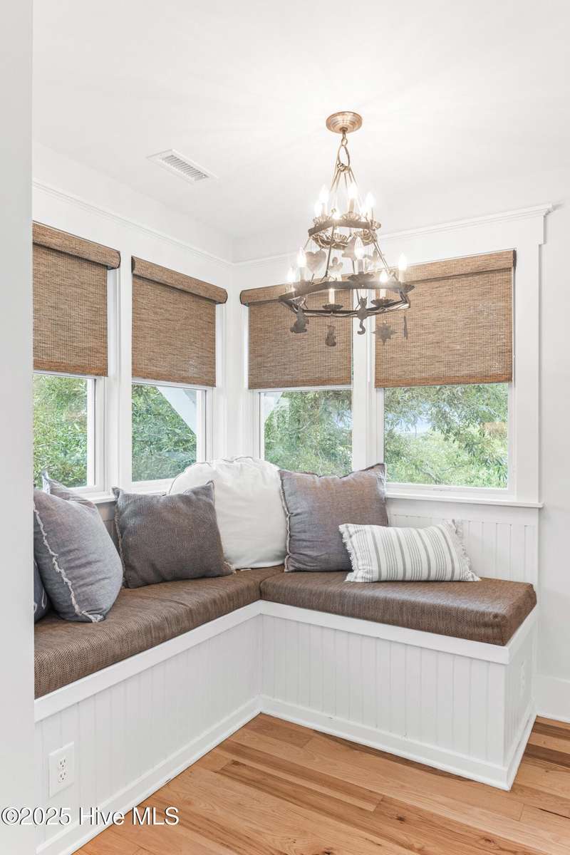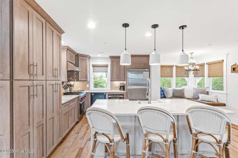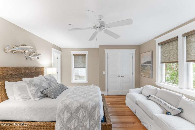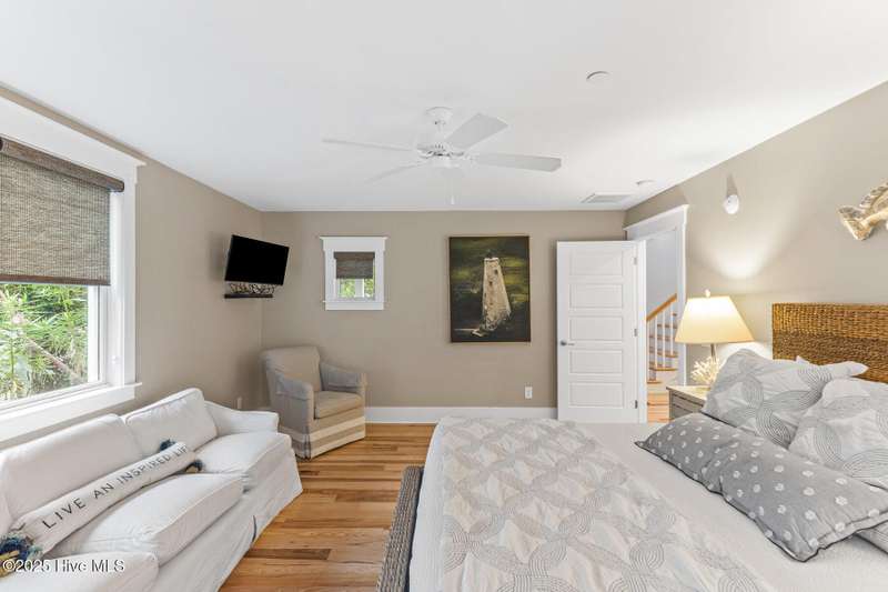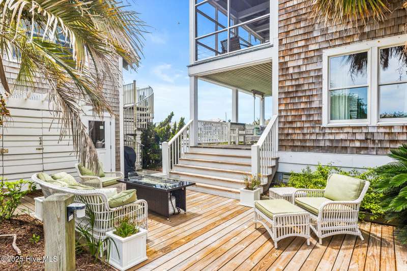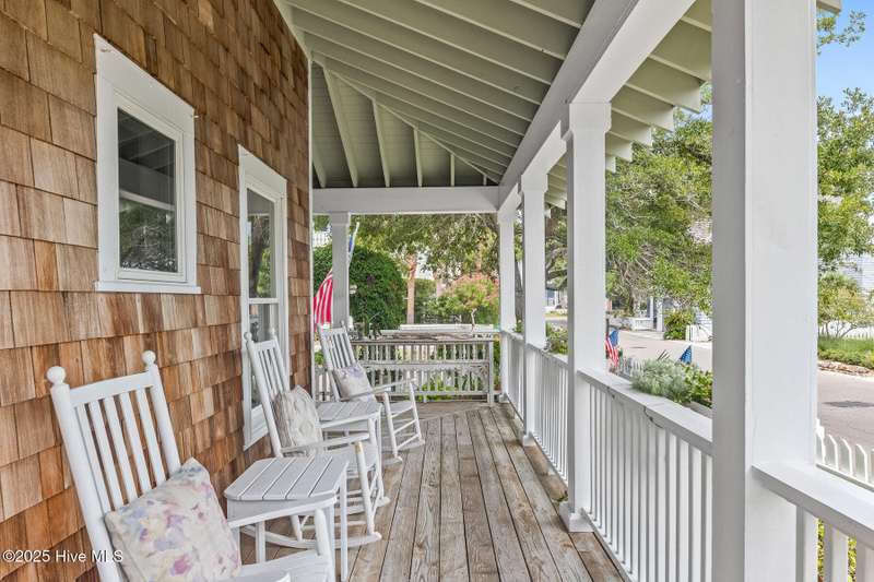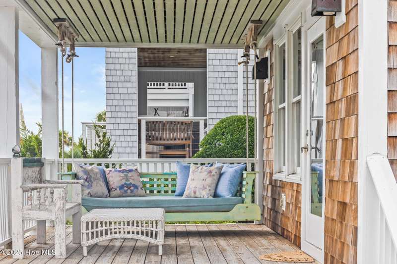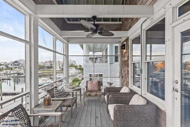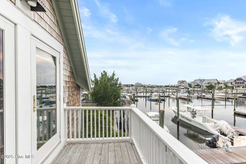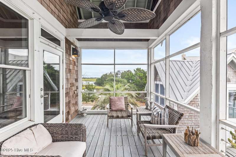 Coastal charm on one of the island's most iconic corners.At the meeting of Keelson Row and Transom Row, this Nantucket-style retreat offers front row views of the marina, sweeping saltwater marshes, and the daily rhythm of Bald Head Island. With 4 bedrooms and 4.5 baths total, the home spans just over 2,300 square feet and is designed for laid-back island living.The reverse floor plan makes the most of its elevated views. Upstairs, the vaulted living room opens to a screened porch where you can watch boats drift by and spot the beacon of Old Baldy. A renovated kitchen blends coastal character with modern function, creating a warm and welcoming flow throughout.On the main level, you will find two guest suites. One of which opens directly to a covered porch with a swinging bed that catches the breeze and invites long, lazy afternoons. Just outside, the wraparound front porch is lined with rocking chairs and offers a perfect perch to watch the island go by. A cozy fire pit patio just off the side adds one more spot to unwind.The top-floor primary suite is a true retreat with sweeping marsh views, a cozy reading nook, and a spacious walk-in shower. The crofter, accessed by a spiral staircase, offers two twin beds and a full bath for guests or flexible living space.Sold furnished and including two 4-passenger golf carts, this home offers a front porch lifestyle made for slow mornings, sunset views, and timeless island memories.