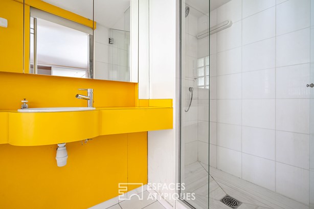 A true centerpiece of 66 m2, the living room boasts 5.20 m of high ceilings, giving the space a rare and theatrical dimension. Adjacent to it, a vast open-plan kitchen creates a welcoming space, designed for entertaining. A powder room completes this level.
