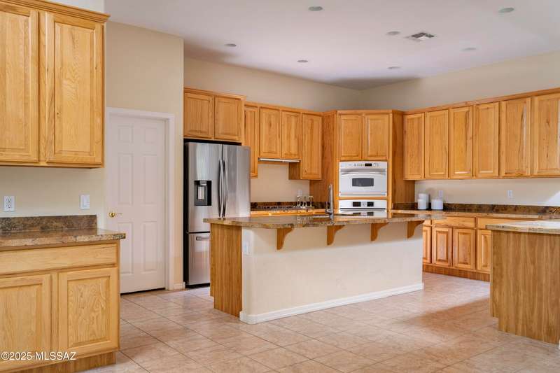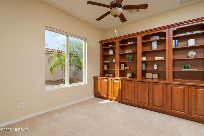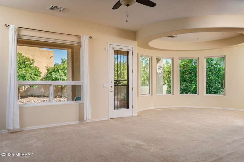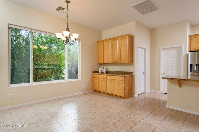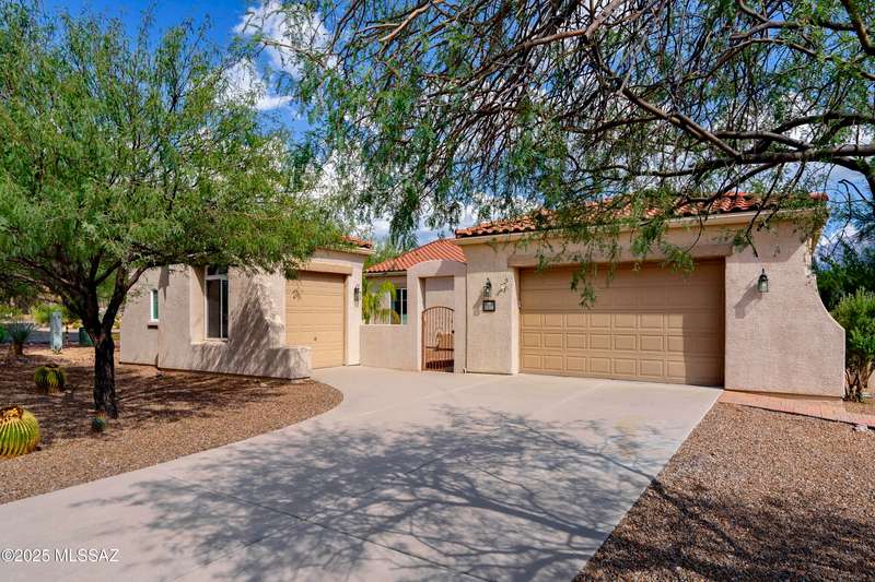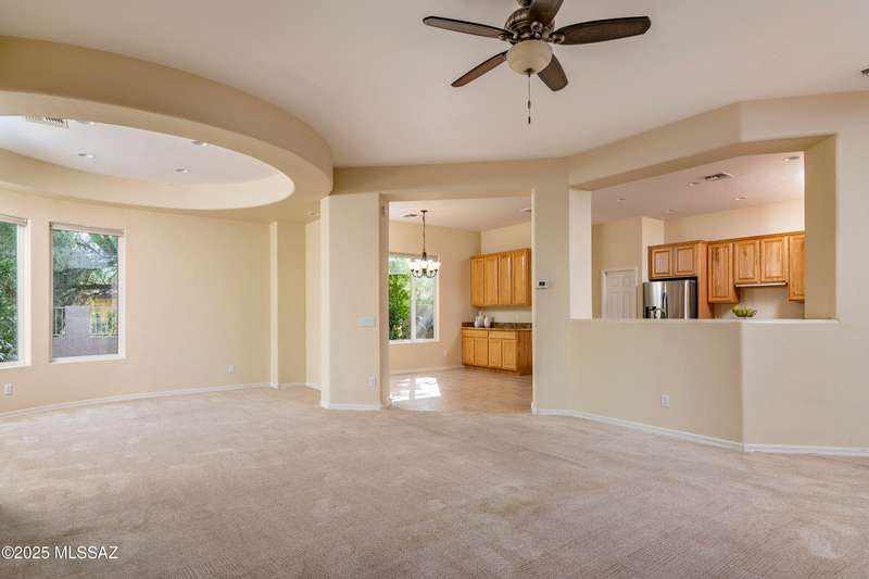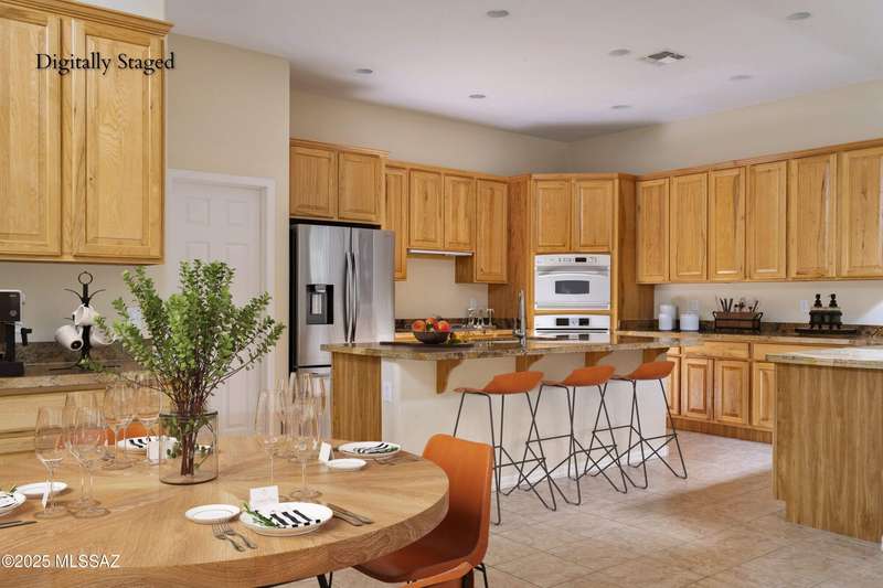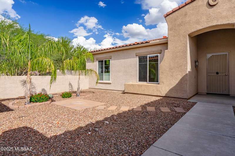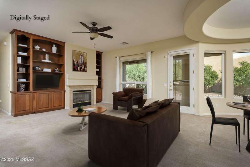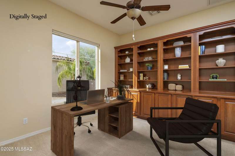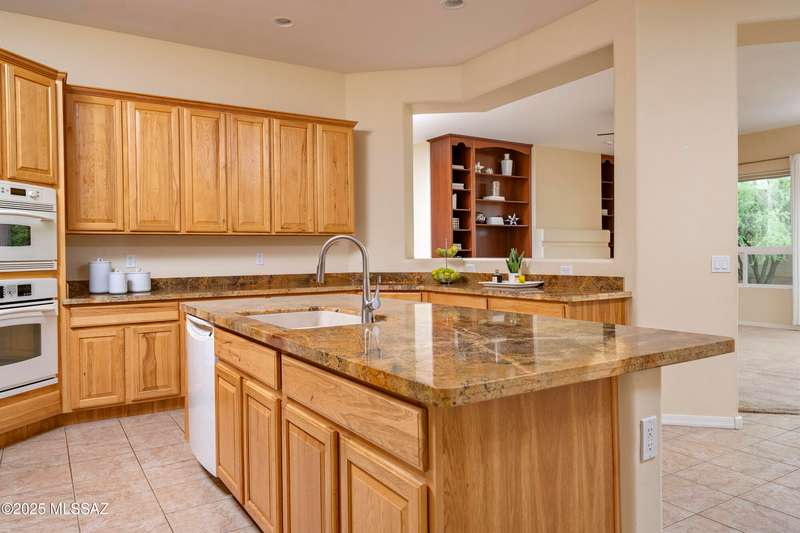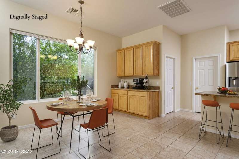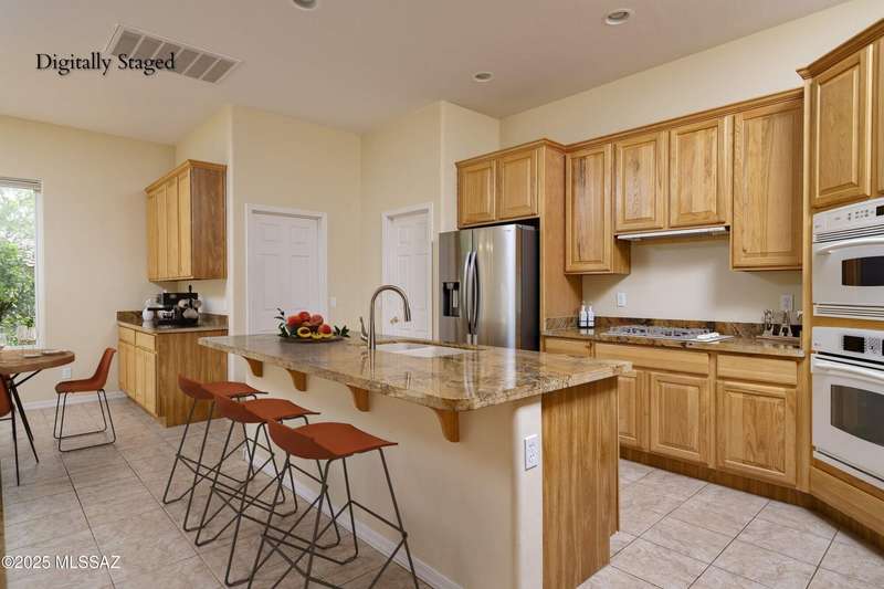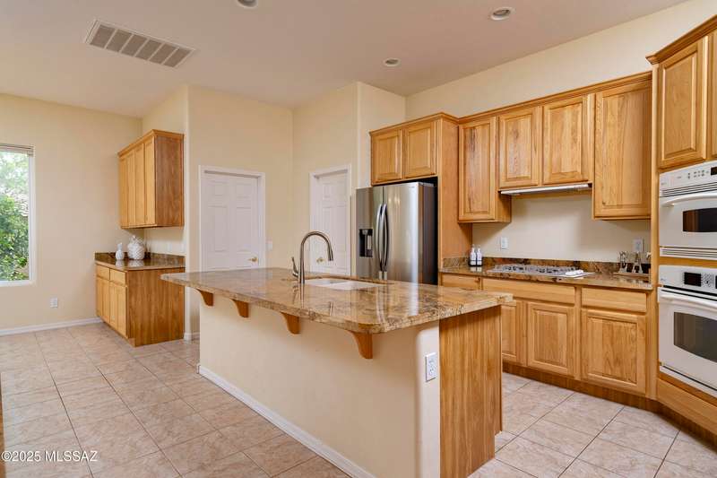 Set on a desirable east-facing lot in Vistoso Ridge in Rancho Vistoso, this 2,416 sq. ft. home offers two bedrooms + den and two full baths. The residence welcomes you through a private courtyard entry into a spacious, open floor plan filled with natural light. The great room offers a warm gathering space with a cozy fireplace, seamlessly connecting to the formal dining area and an open-concept gourmet kitchen with a breakfast room. With granite countertops, hickory cabinetry, an oversized island and abundant storage (including a walk-in pantry), the kitchen is perfect for both everyday living and entertaining friends. The adjacent laundry room has a sink with cabinets and folding counter. The sizable primary suite is a retreat of its own, with patio access, dual vanities, a garden tub,