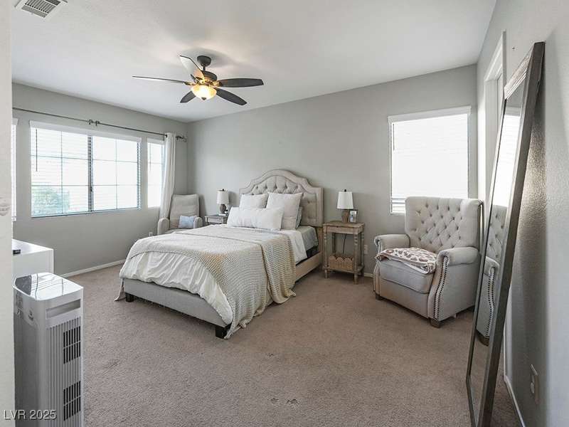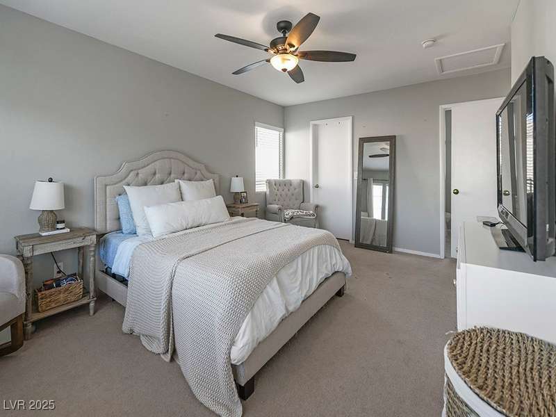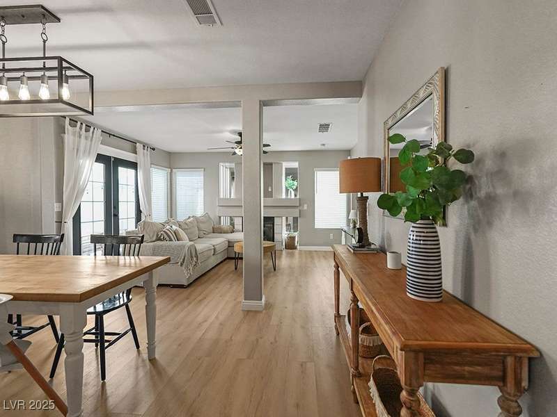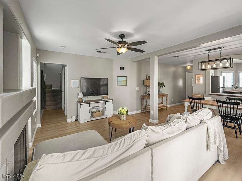 Welcome to this beautifully updated home in American West Village, nestled in a quiet cul-de-sac within a gated, well-maintained community. Enjoy access to 2 community pools, BBQ areas, walking paths, mature landscaping, and RV parking with a virtual gate attendant. Inside, the home features a smart layout with the kitchen just off the entry, butcher block countertops, upgraded lighting, newer fridge and water heater, French doors to the backyard, and a cozy gas fireplace in the living area. 3 bedrooms and 2 bathrooms are upstairs, with great flow for comfortable living. Just minutes from Downtown Summerlin, Target, Costco, Sprouts, Hobby Lobby, and top golf courses, plus easy access to both 215 & 95 freeways. HOA even includes water! VA assumable loan with a low 2.5% interest rate available—don’t miss this incredible opportunity!