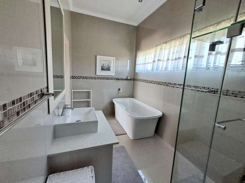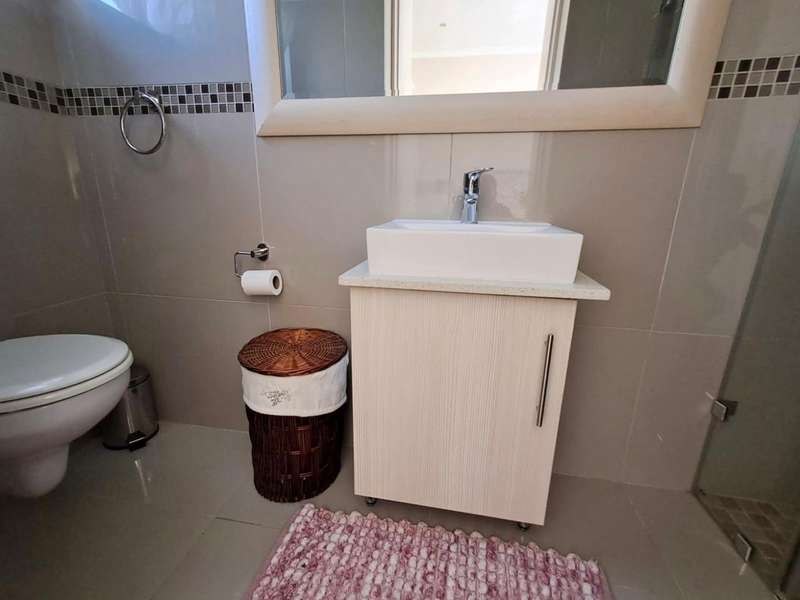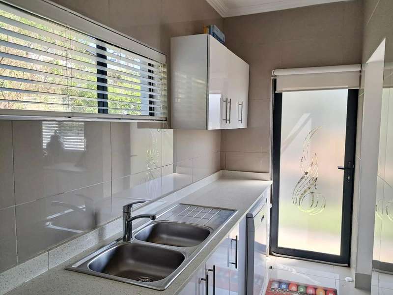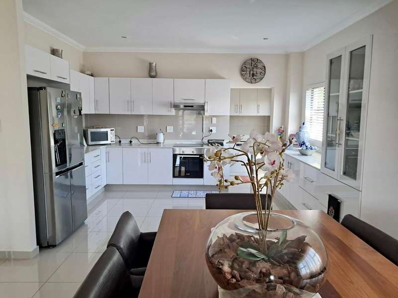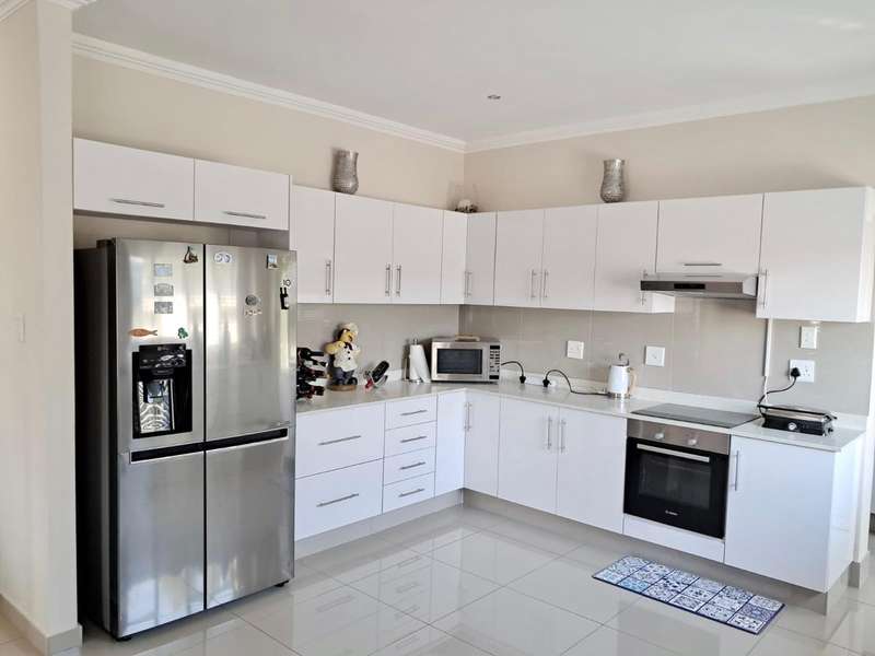 This stunning double-storey home features a neutral blend of modern design and elegant finishes. A beautiful entrance hall is complemented by large windows that invite natural light into this home. The ground floor boasts a large living and dining room with a spacious kitchen including quartz counter tops and a separate scullery. On the left of the entrance hall is a guest toilet and one of the bedrooms. All three bedrooms are super spacious and en suite. On the upper level of this elegant home sits the other two bedrooms including the main bedroom. The main bedroom has a walk in closet as well as a balcony overlooking the estate and green belt. This home perfectly balances style and functionality, making it an ideal sanctuary for modern living. Situated in the family-friendly Palm Lakes Estate, this home provides access to a range of amenities, including swimming pools, a clubhouse, walking trails, and 24-hour security. Don't miss the opportunity to make this exceptional property your new home. Contact us today to arrange a viewing!