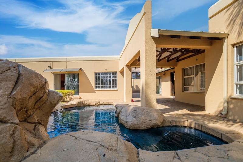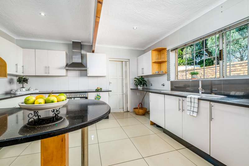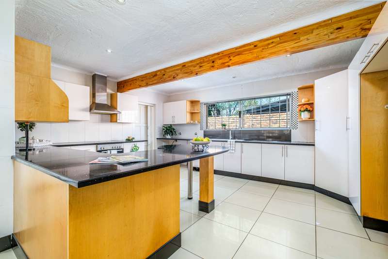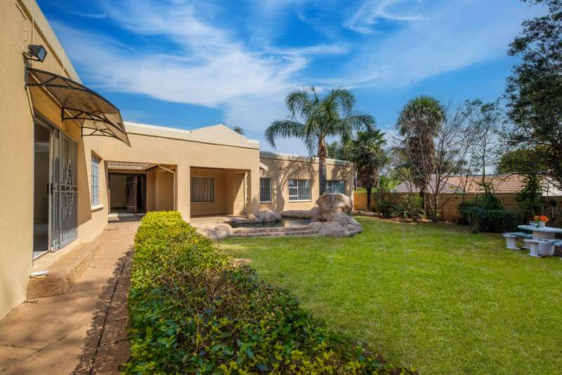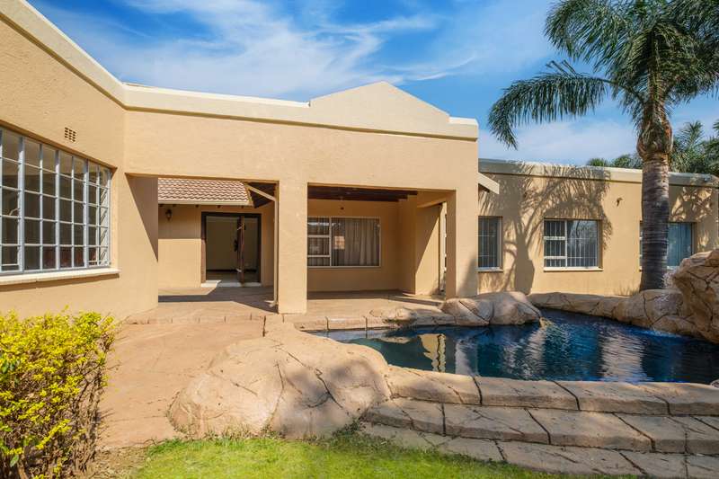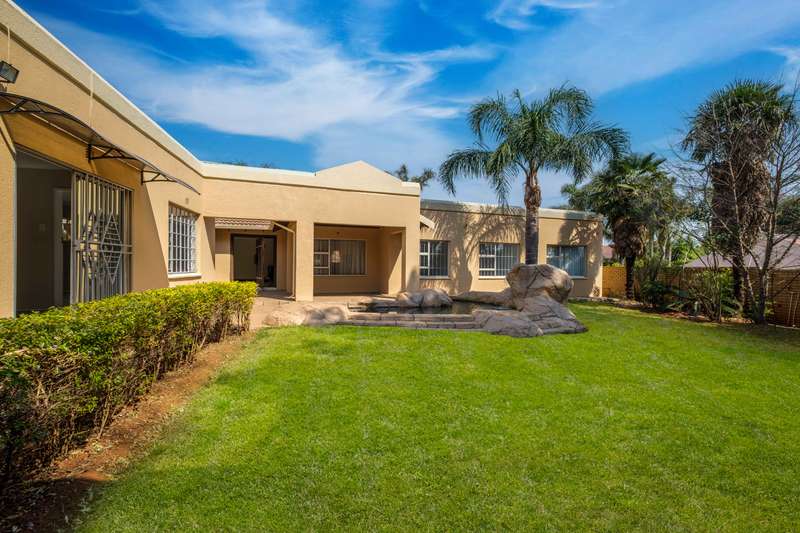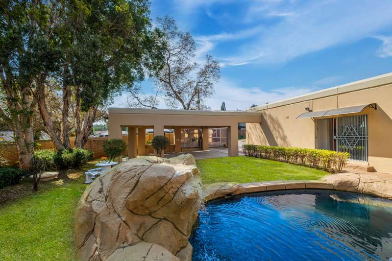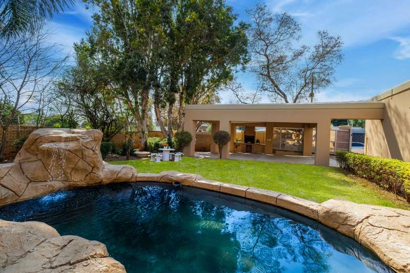 Stunning family home tastefully renovated with attention to finishes & easy maintenance. Welcoming front patio & entrance leads to large north facing lounge (fitted with woodburning fireplace) that flows to open-plan dining room & delightful kitchen. The kitchen is fitted with granite counter tops, breakfast nook, pantry cupboard, glass hob, Bosch under counter oven + enough space for appliances. 3 North facing bedrooms, all fitted with build-in cupboards & 2 modern bathrooms (main En suite) The spacious master bedroom offers a with a walk-in closet. Front covered & open patio overlooks the swimming pool with waterfall feature & tranquil gardens. A further garden covered entertainment area with braai facilities – offer enough space to cater for large entertainment with family & friends. Outbuildings consist of: Work from home facility – these rooms could be converted as additional accommodation & automated double garage (fitted with cupboard space). The setting is quiet; the security is excellent & the location offers easy access to all amenities. If you are urgently looking for a move-in ready home – this is a must view!