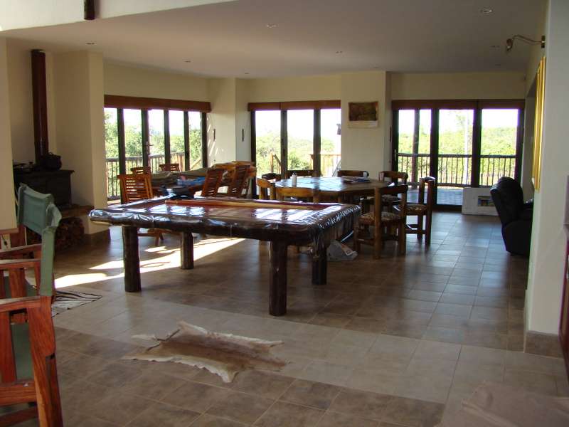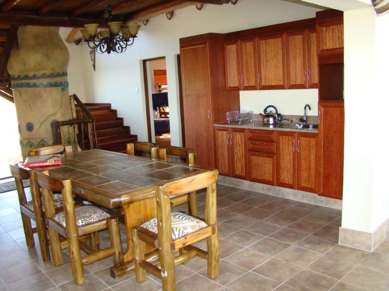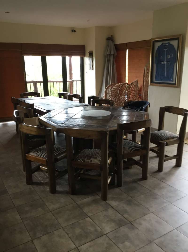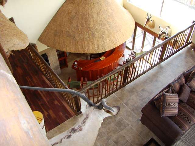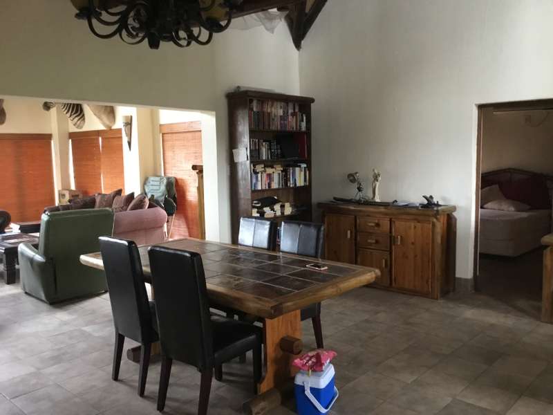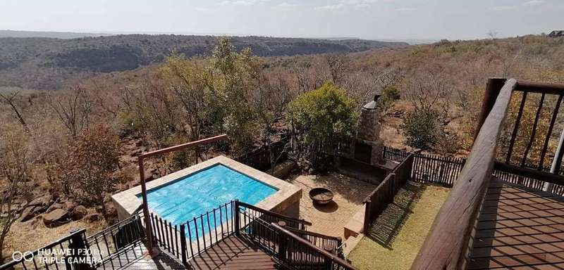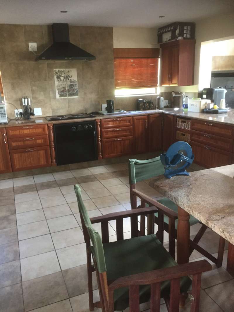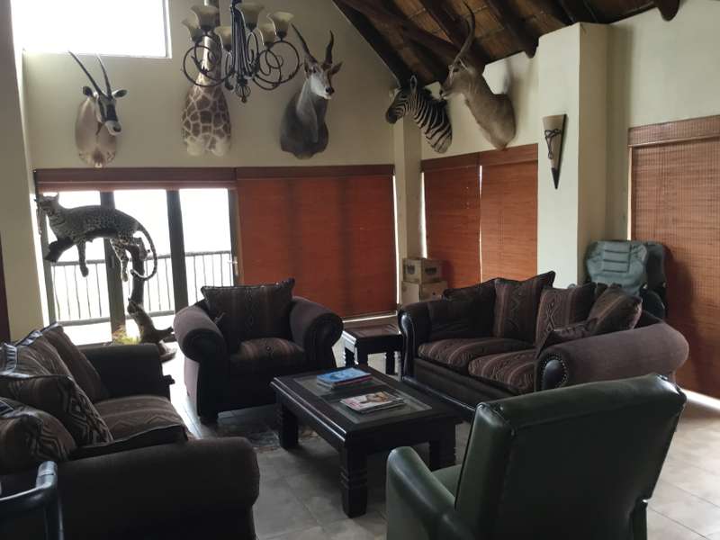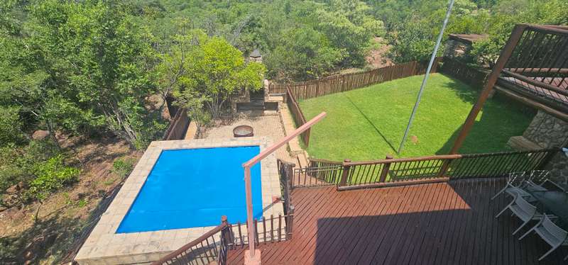Discover the allure of this immaculate property nestled in a Wildlife Estate, just 13km from Bela Bela. This rustic gem serves as a self-catering guesthouse or weekend retreat, boasting spacious accommodation for up to 10 people. The two-story thatched-roof house is adorned with a lightning conductor and features a double garage, 2 carports, and 2 parking bays. Cross the paved entrance, flanked by fish ponds, and enter through a grand wooden door. The ground floor showcases a vast open-plan layout encompassing a lounge, dining area, entertainment space, built-in braai, bar, and a well-equipped kitchen. Glass doors open to a patio, leading to a swimming pool, outdoor braai, and a serene boma. A lush patch of grass invites sun-soaking moments. The kitchen boasts ample cupboards and a breakfast nook, with an adjoining scullery/laundry room. A spacious bedroom with built-in cupboards, aircon, and an en-suite bathroom, along with a guest toilet, completes the ground floor. A small wine cellar adds a touch of sophistication. Ascend the wooden staircase to the first floor, featuring an open-plan lounge, dining room, and kitchenette with built-in cupboards. Two interlocking bedrooms share a bathroom, while another bedroom with an en-suite bathroom opens to a deck. The loft on the second floor accommodates four single beds. Security is ensured with an alarm system and outdoor beams. The sale includes all furniture, linen, garden tools, and more, offering an incredible opportunity for an additional income of R2400 per night. Don't miss out on this stunning property – act now and make it yours! Call to schedule a viewing of this spacious, neat-as-a-pin masterpiece!