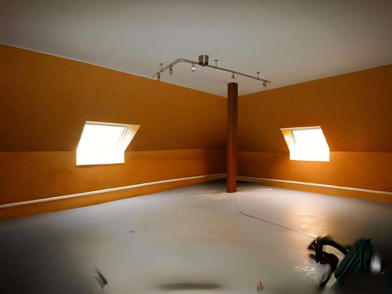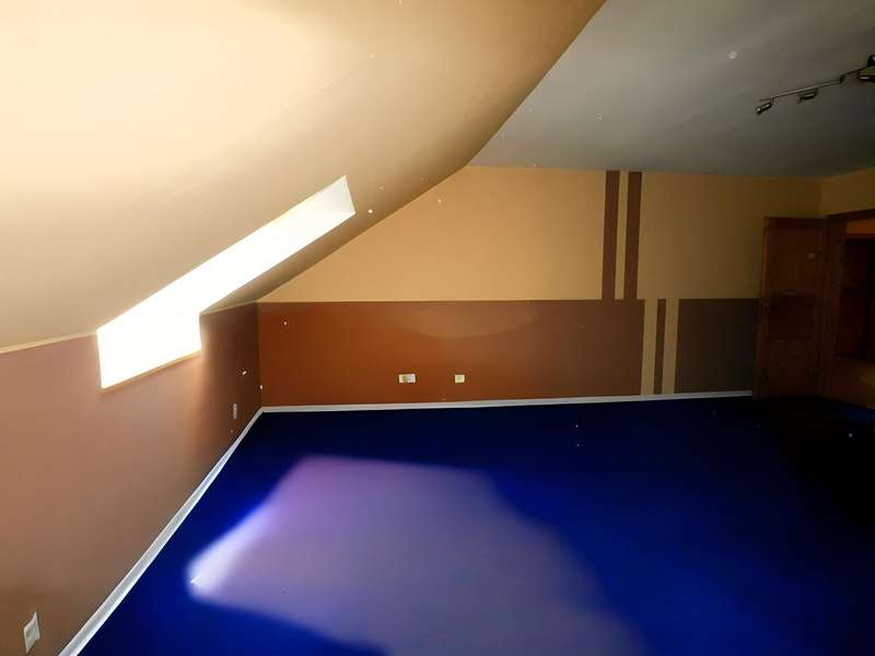 The spacious single-family house was built in open construction. In the entrance area or the vestibule is a closed room, which serves as a checkroom. From the hallway, a solid wood staircase leads to the attic and the center of the house on the first floor. Here is a large living area with open kitchen and dining area. On the left side of this area is access via a small hallway to the guest toilet and garage. Behind the kitchen area there is a small pantry under the staircase, a bedroom with access to the dressing room, a spacious bathroom with bathtub and access to the laundry room with shower and the garden. In the attic there are four spacious rooms and a bathroom with tub and shower. One of these rooms is currently used as a kitchen. The attic and access to the attic are designed so that it could be used as a closed apartment. From the living area on the first floor you can access the covered terrace and from there into the well-kept garden. There is another seating area and a garden / tool shed.