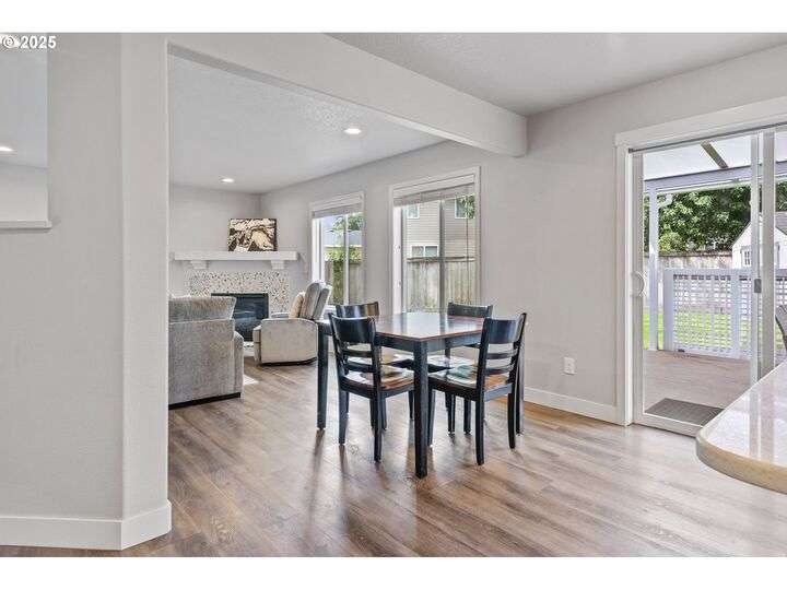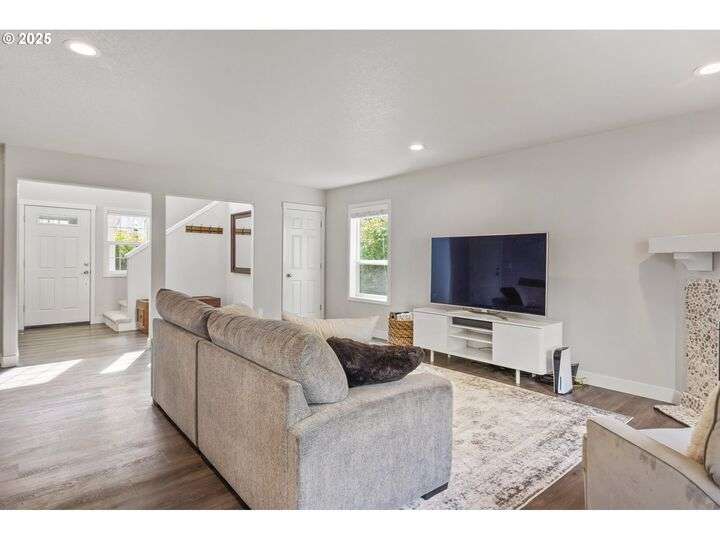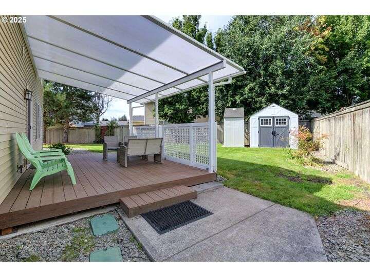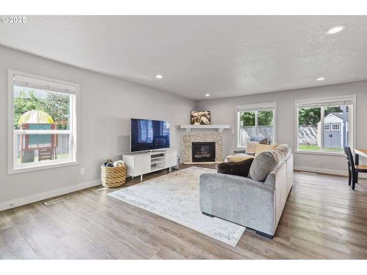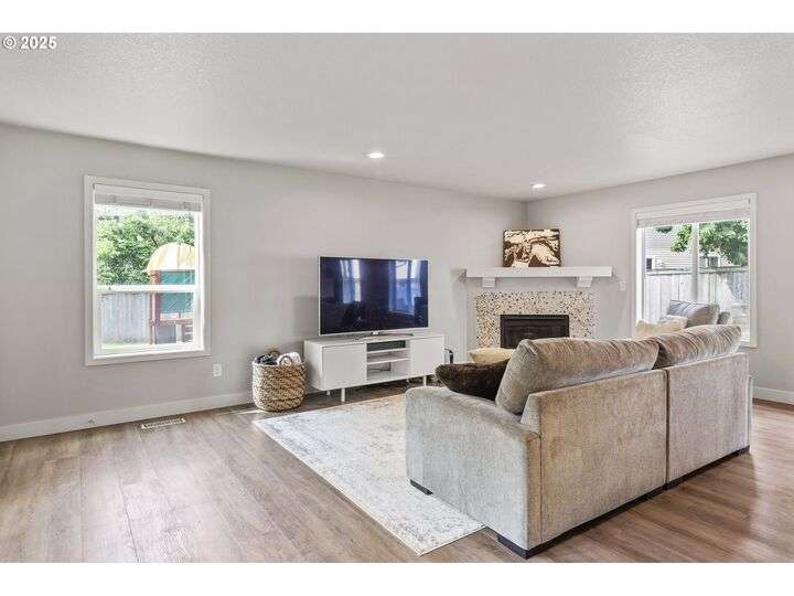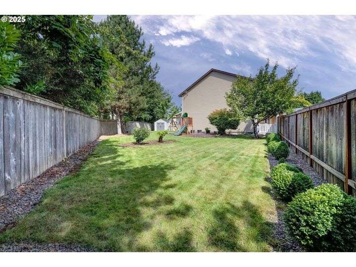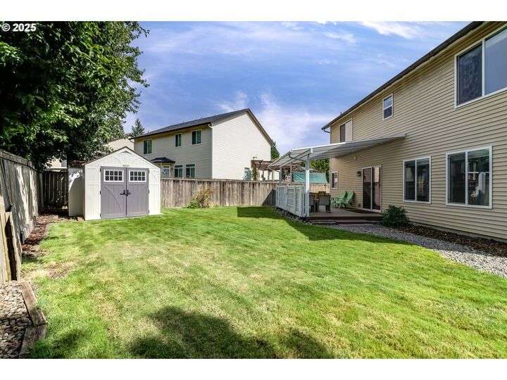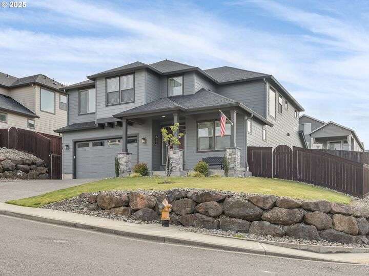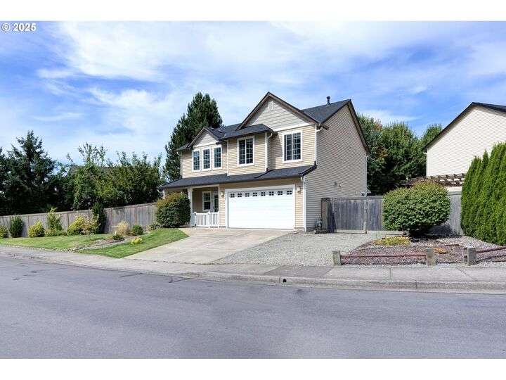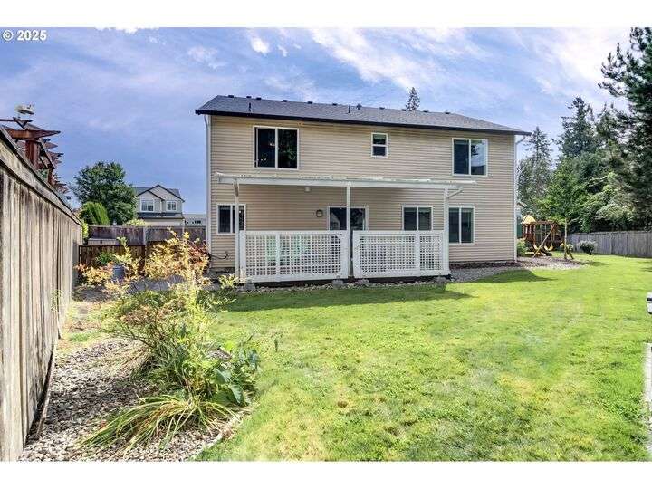 RENOVATED HOME NEAR THE PARK. 3 bedrooms, 2 1/2 bathrooms, 2130 sqft, built in 2006 on a large 8441 sqft lot. New roof in 2023. New flooring throughout w/ LVP on the main floor & high end carpeting upstairs. Two story entry w/ open area. Kitchen has been completely redone w/ huge island, pantry w/ pullout drawers, quartz counters, coffee bar & stainless appliances that opens to the dining area & great room w/ gas fireplace. Vaulted primary bedroom upstairs w/ walk-in closet, built-ins, soaking tub & glass shower. Huge second bedroom & 3rd bedroom upstairs w/ laundry room. Gas forced air heat & AC. Large front porch. Covered composite deck in back that overlooks the large fenced yard w/ play structure & storage sheds. Gated RV parking. Excellent La Center neighborhood, just a short distance to community parks, walking trails, nature preserve, library & schools.