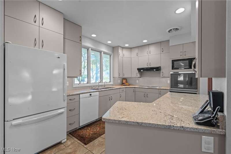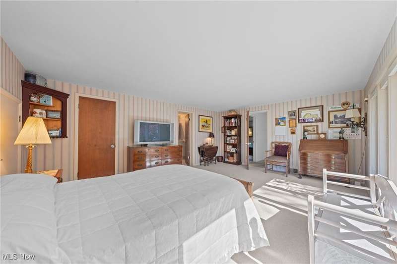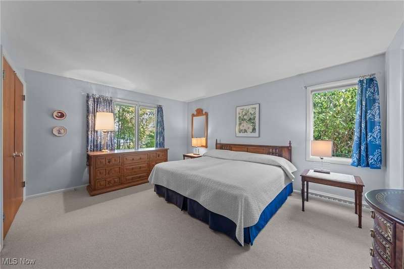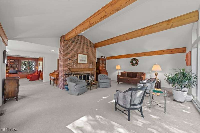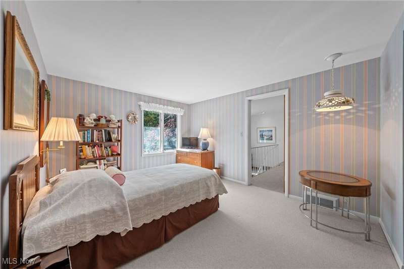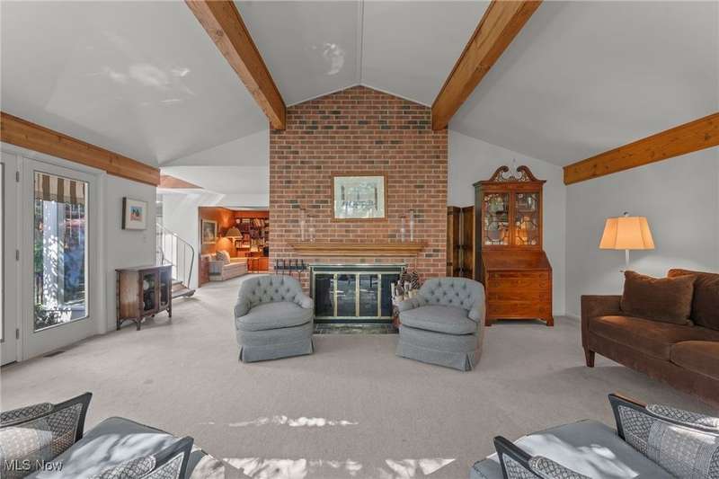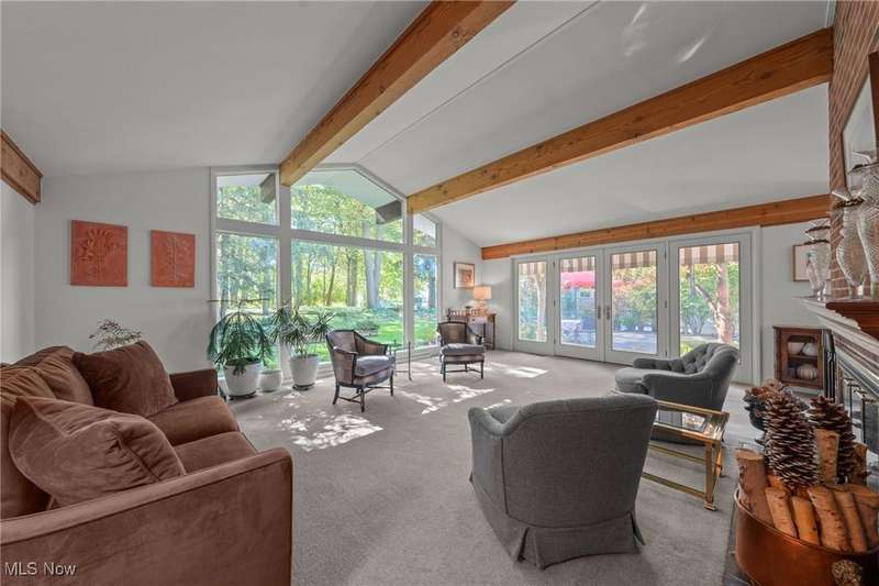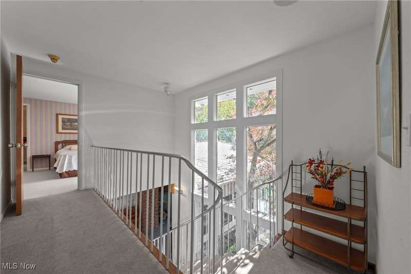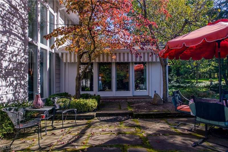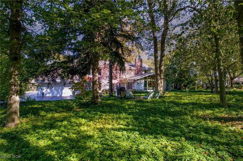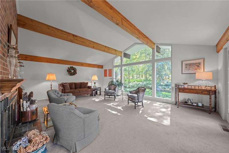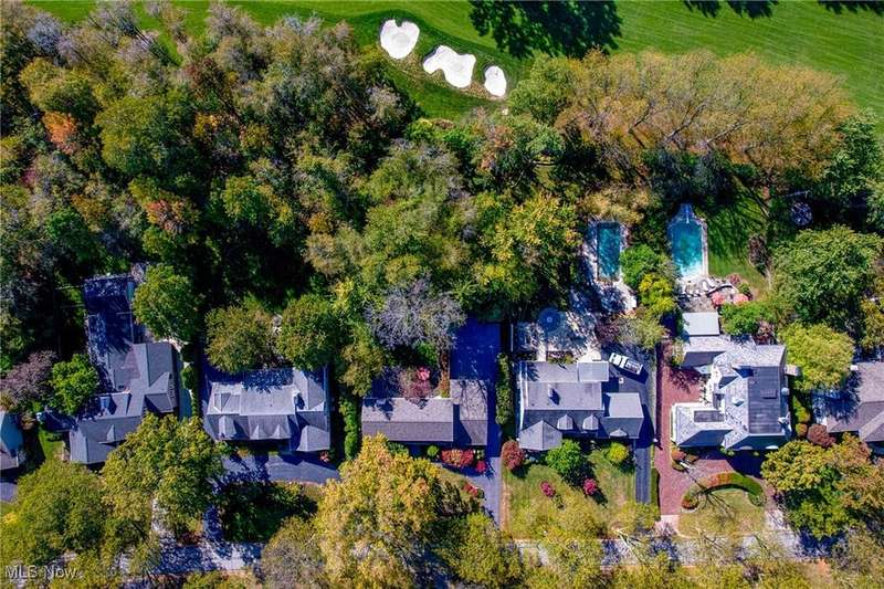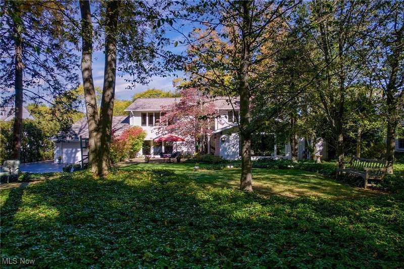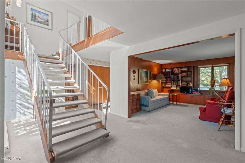 Meticulously maintained 4+ bedroom, 3.5 bathroom home tucked away on a private cul-de-sac and perfectly positioned just off the thirteenth fairway of Canterbury Golf Club. This architecturally striking home features classic mid-century modern details. Step inside to discover an iconic open-riser staircase that anchors the home. The expansive open living room has a vaulted ceiling and exposed beams, with floor-to-ceiling windows that look out to the stunning, private backyard. The sleek kitchen with a breakfast nook opens to the inviting warmth of a classic, warm wooded dining space. A cozy, character-rich library with wood paneling and original built-ins adds charm. The nicely sized first-floor bedroom with an ensuite bathroom features original tilework and period charm. Upstairs, you'll find a primary suite with a walk-in closet and its own bathroom, plus two additional bedrooms and a full bath. The bonus space with a pocket door in the bedroom could serve as a tandem children's room, dressing room, or home office. An attached garage and mudroom, plumbed for first-floor laundry, complete the home. Built with enduring quality, this 2-owner residence awaits its next chapter.