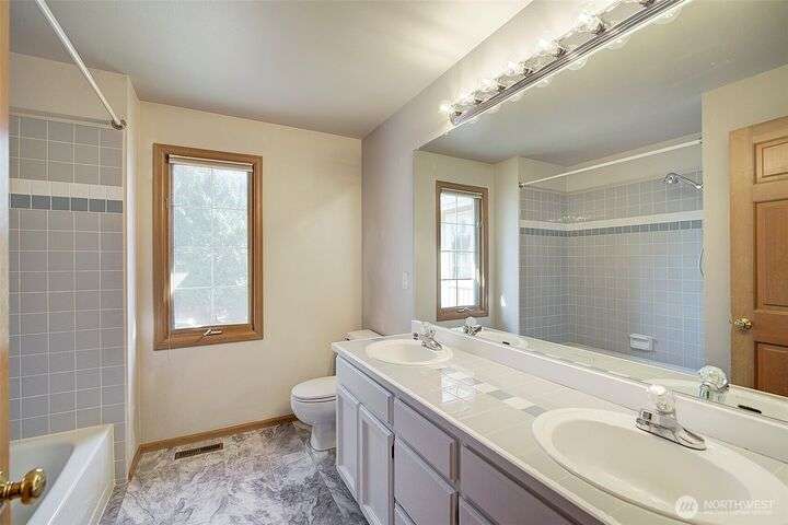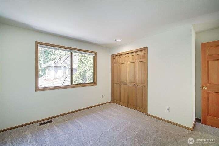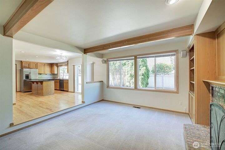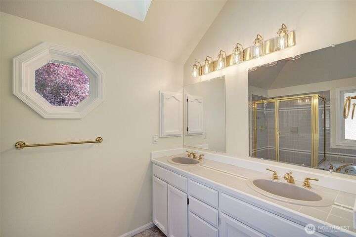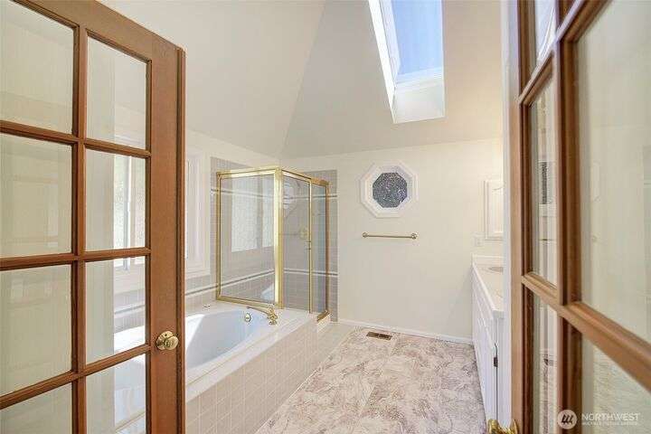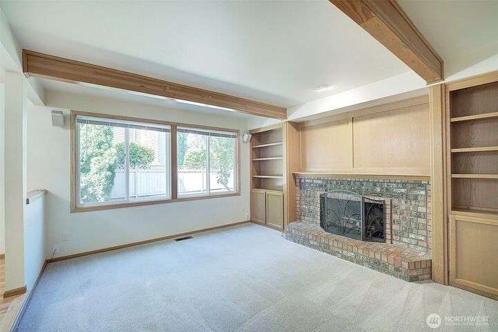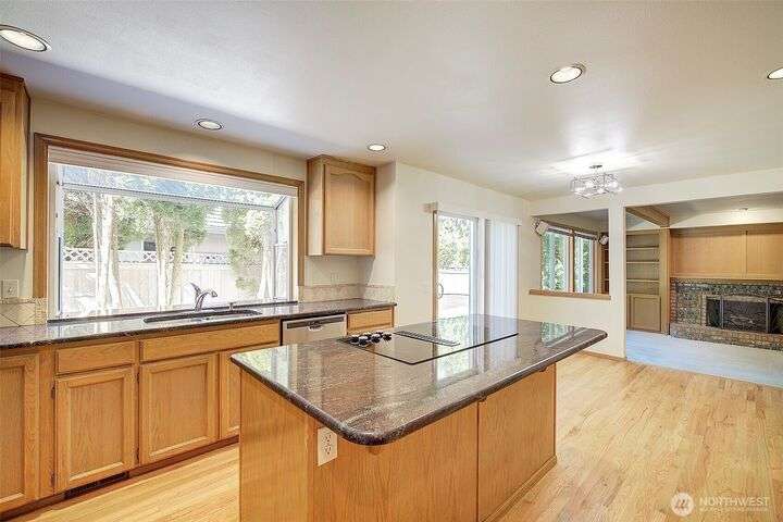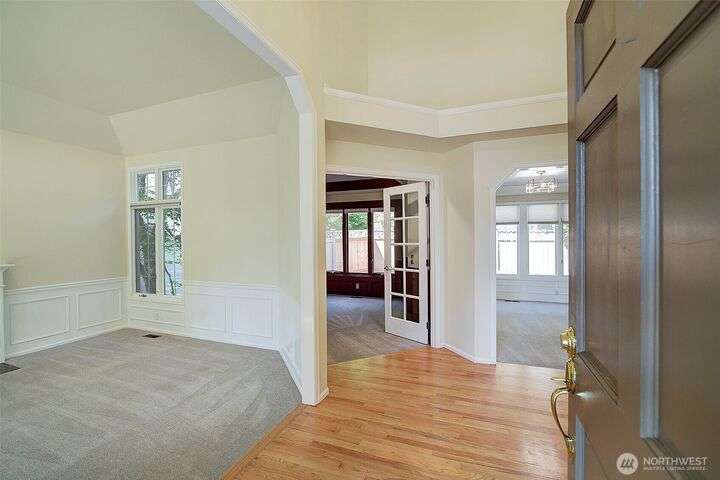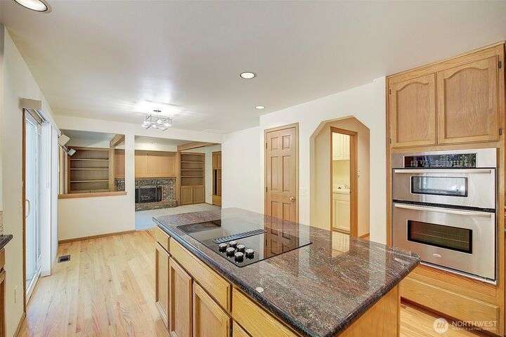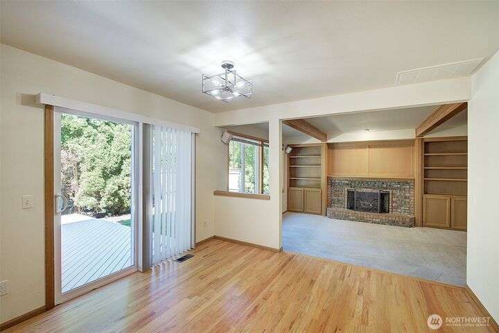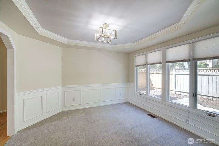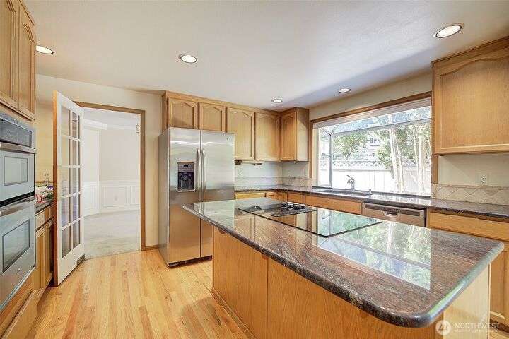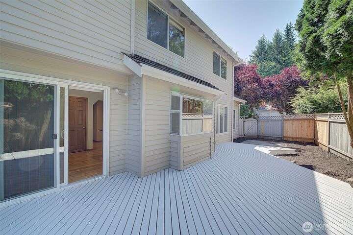 A stunning Sammamish home including vaulted entry, hardwoods, custom built-ins, wainscoting, skylights and coffered ceilings. Front porch welcomes you to vaulted hardwood entry, opens to family room with wood burning fireplace, den/office, dining room with access to kitchen with SS appliances, granite counters, island, pantry and garden window. Dining Room with access to large entertaining deck and backyard. Living room with gas fireplace and built-in surround sound. Utility room with washer, dryer, sink and linen closet, powder bath and garage on main level. Upstairs primary suite with large walk-in closet, 5 piece bath with soaking tub and skylight. Three bedrooms on upper level. 3-car garage. Near parks, trails, shopping and restaurants.
