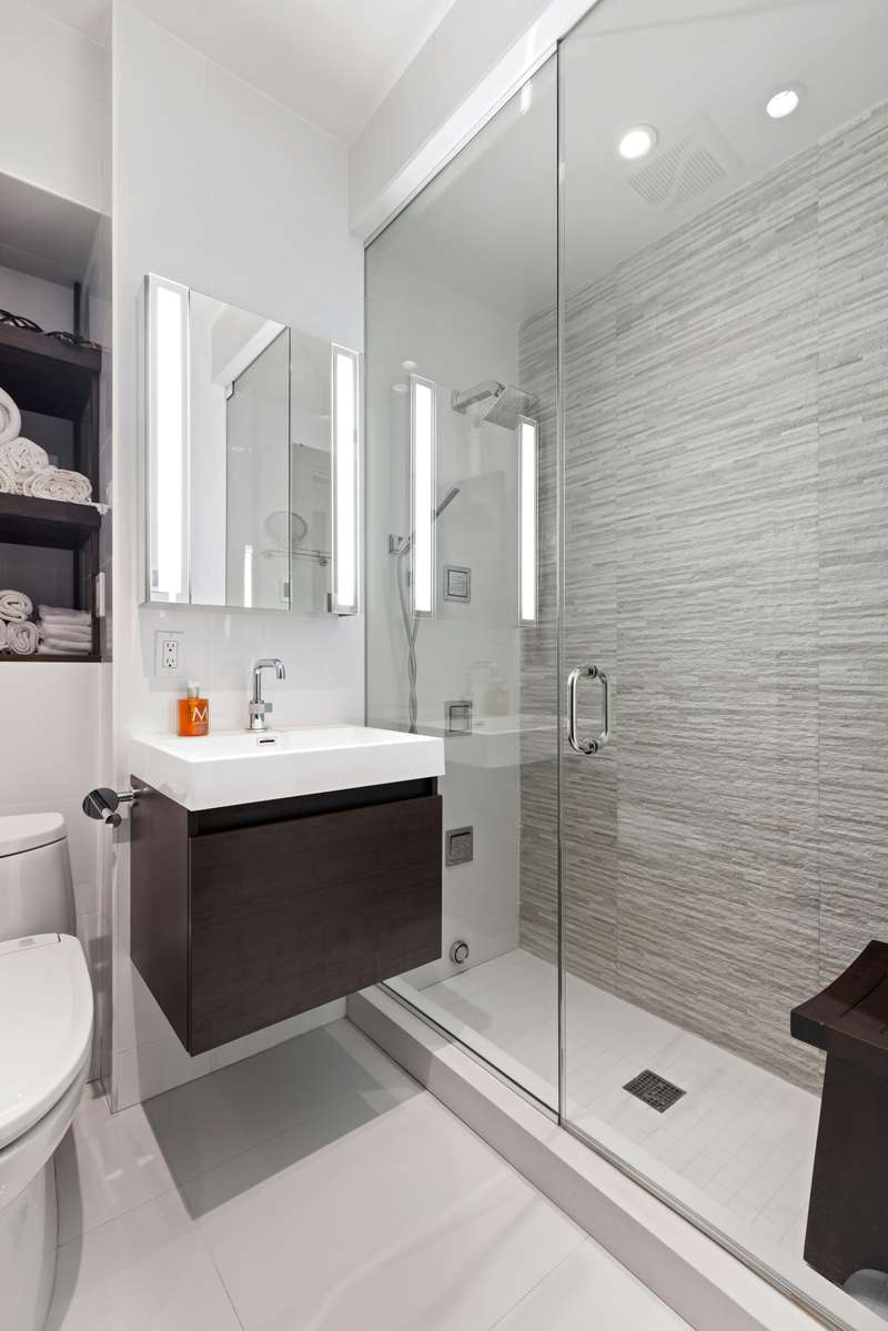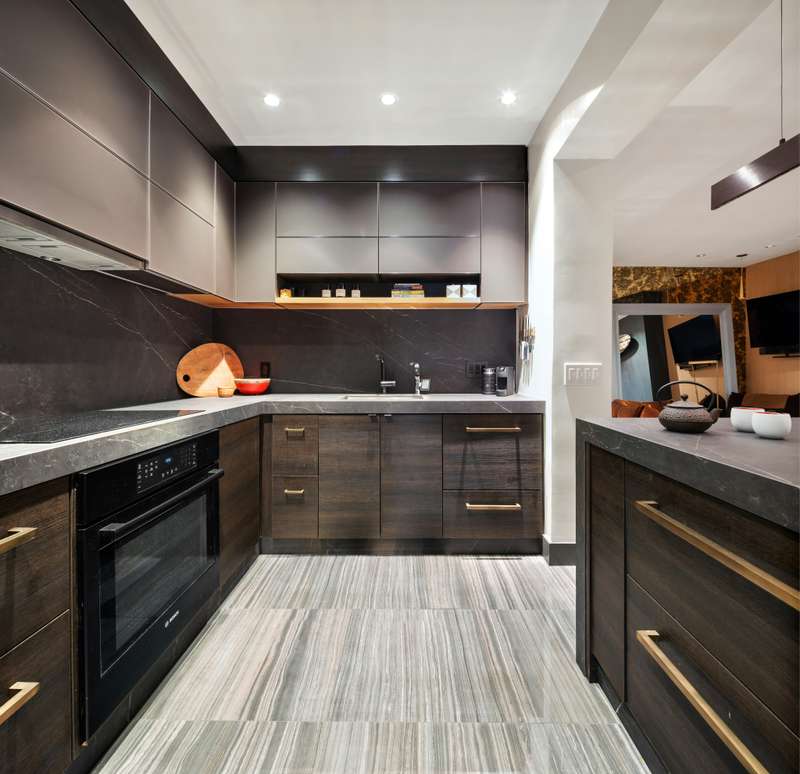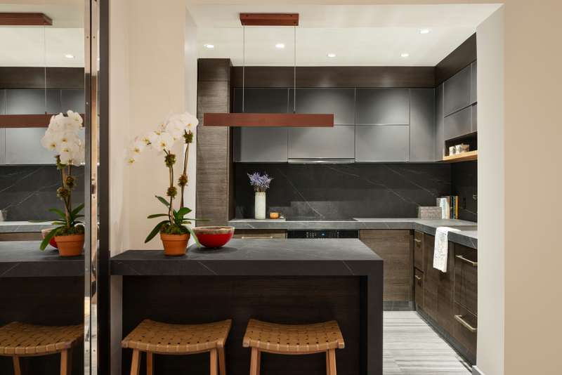 A spacious entrance foyer leads to a sunken Living/Dining room with a wood-burning fireplace and wide open French doors showcasing the natural beauty of the garden. The living room fireplace wall is made of Porcelanosa stone and surrounded by custom-milled wood paneling. The chef's kitchen features three-inch thick stone countertops, abundant custom cabinetry, brushed-bronze hardware and top-of-the-line Bosch, SubZero and Fisher-Paykal appliances. Handmade slatted lacquered doors open to a hallway leading through a dressing area to the pin-drop quiet primary bedroom suite, a serene sanctuary overlooking the garden. Sleep with the windows open, wake up to greenery and hear the birds in the morning! The bedroom has been designed with large custom closets and a separate dressing area with rows of built-in closets. The primary bathroom is designed with beautiful stone walls, radiant heated floors, a Toto toilet and a glass enclosed Koehler spa with steam shower, multiple body sprays and rain shower head.