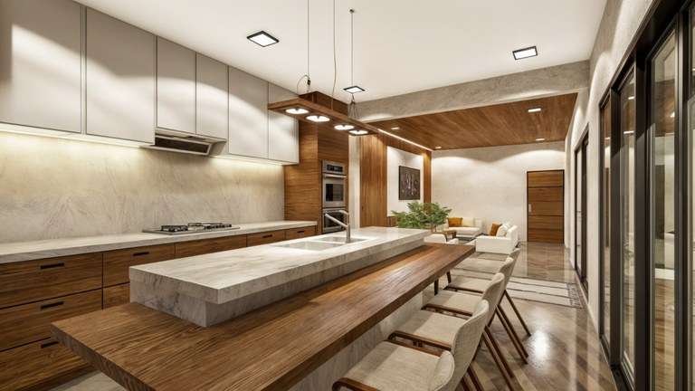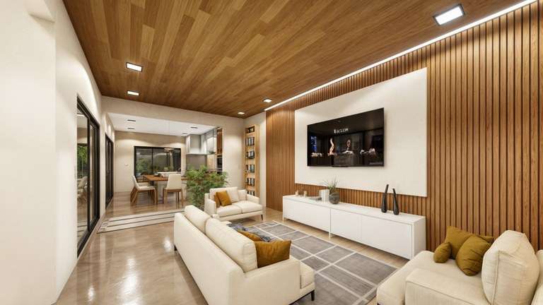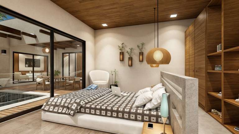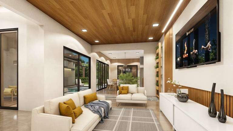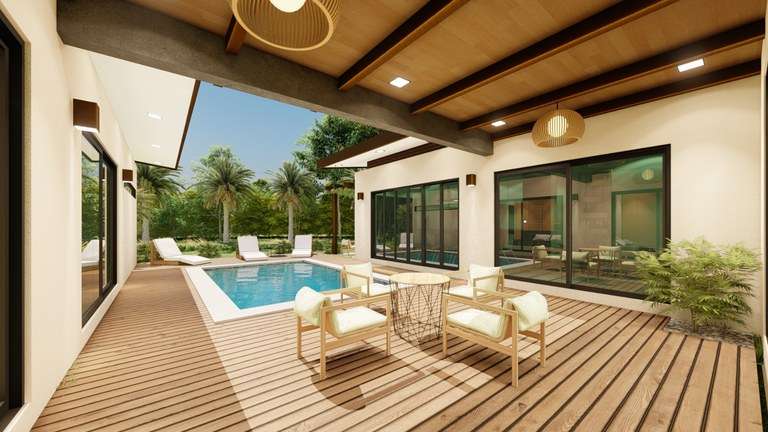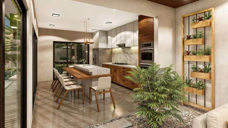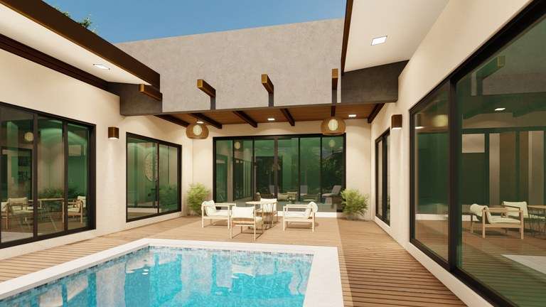 Crafted with attention to detail, the home features warm, rich teak wood accents throughout—from the solid doors to the custom ceilings—infusing the space with a timeless sense of luxury. Expansive sliding glass doors connect the interior with the outdoors, seamlessly blending the living room and terraces for a true indoor-outdoor lifestyle. A unique interior courtyard separates the kitchen and living room, creating an airy, open layout that's both functional and architecturally striking.