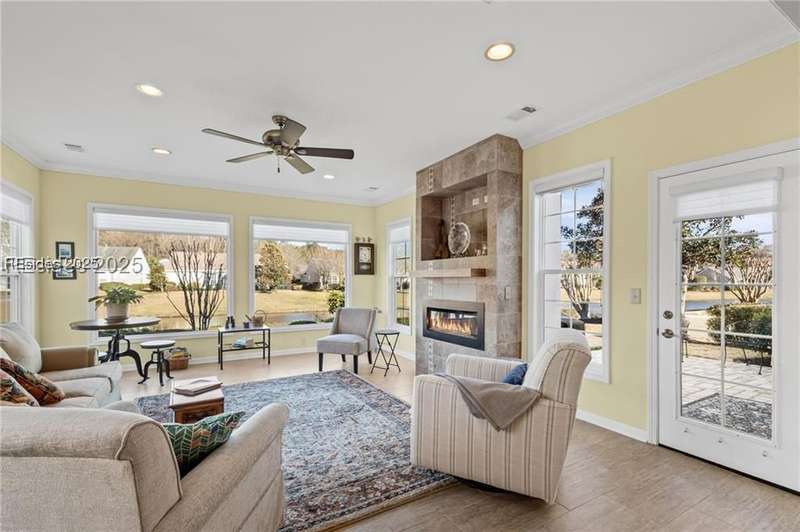 $70,000 in upgrades! One of Sun Citys finest! This home has everything from the beautifully renovated kitchen with quartz countertops, Induction stove and convection oven, new self-closing cabinets to the large Carolina room with stunning fireplace overlooking the lagoon to the charming, serene patio. The Luxurious primary bath makes a statement of how well this home has been maintained and improved. This gracious home offers more than ample storage in the garage and is located near Hidden Cypress and the Sports Complex A plus is the new 2025 AC. Built-ins in den can be easily removed. This home is centrally located easy access to all the amenities Sun City has to offer, if it is golf minutes to Hidden Cypress, softball, woodworking, pickleball, pool or fitness centerer again minutes away an easy golf cart or bike ride. This is a very special home.