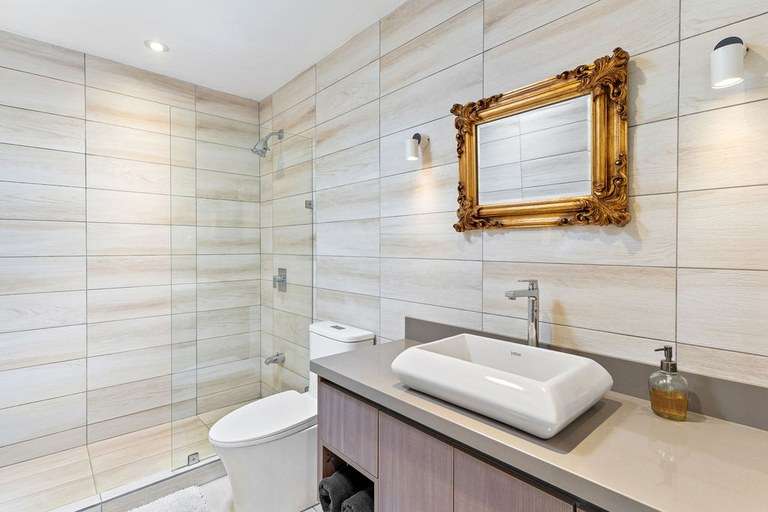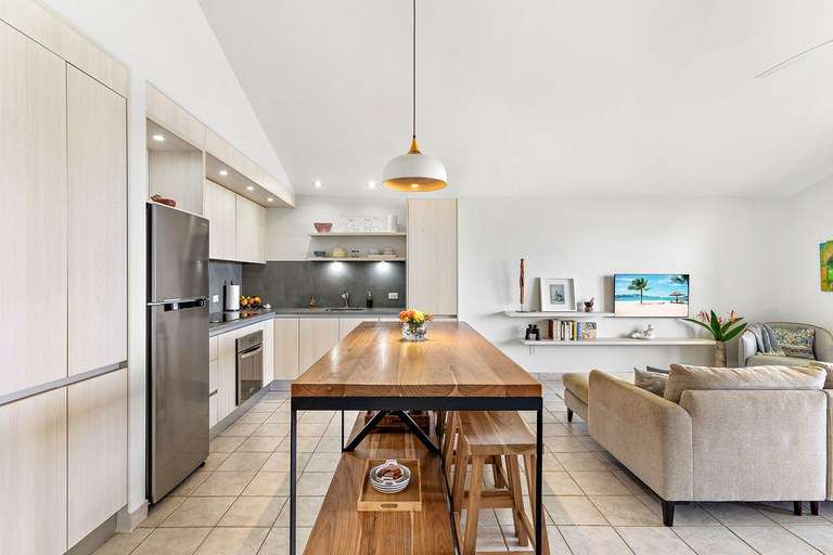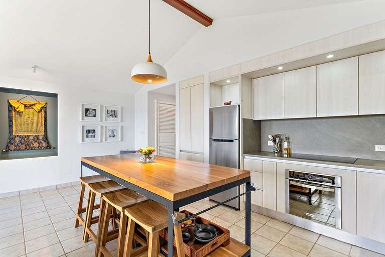 The interior is light-filled and tranquil, with vaulted ceilings, soothing neutral tones, and thoughtful design throughout. The kitchen showcases floating shelves, designer lighting, a striking full-height backsplash, and a custom island that's both artistic and functional.