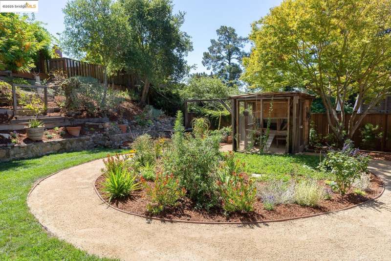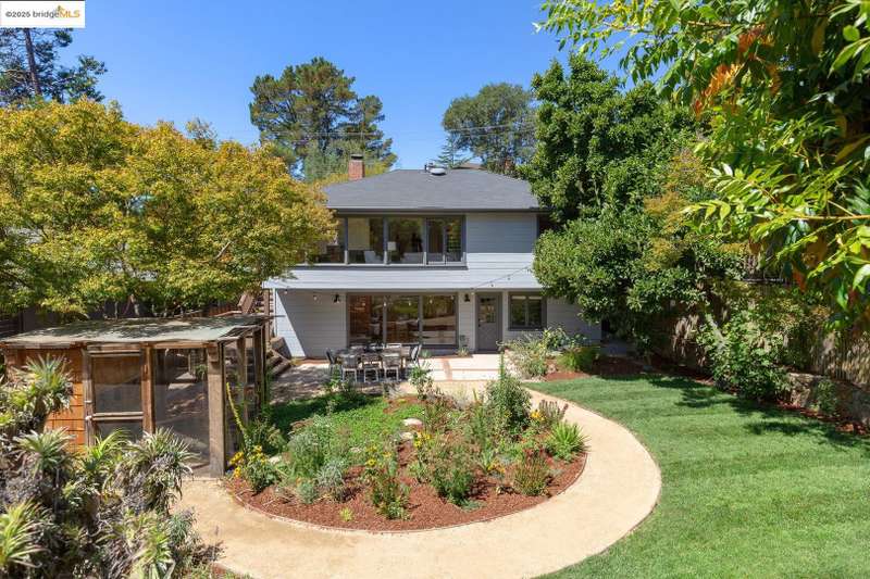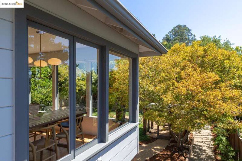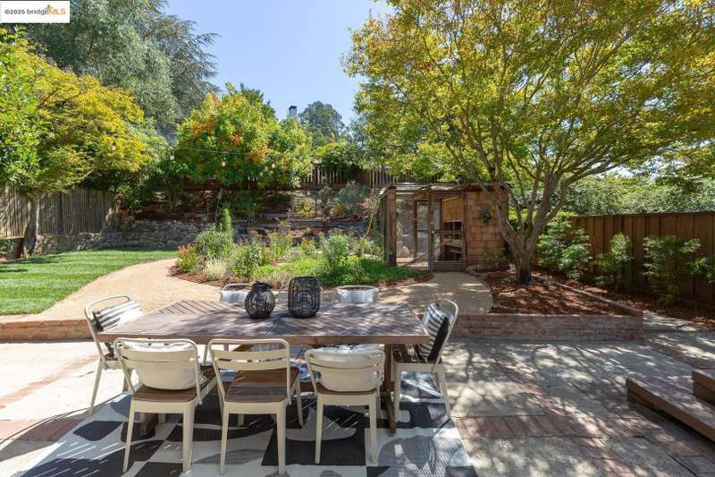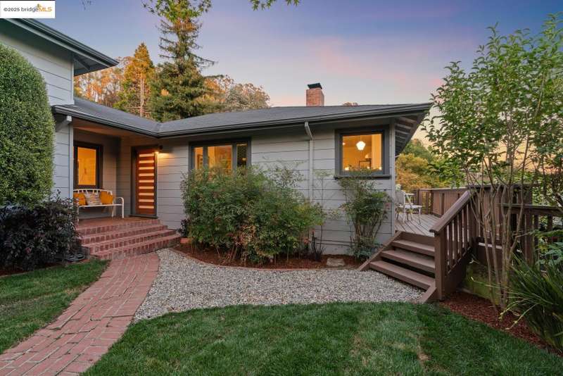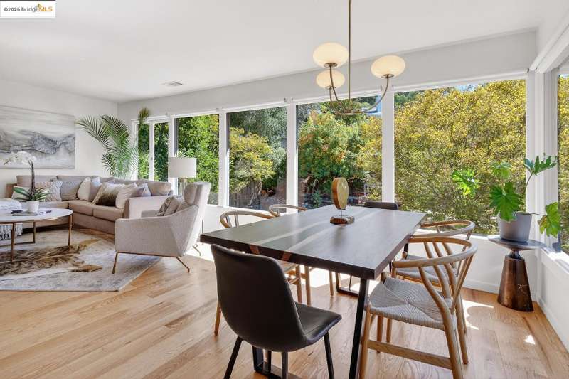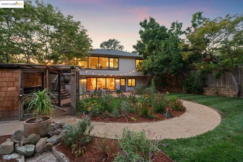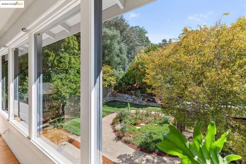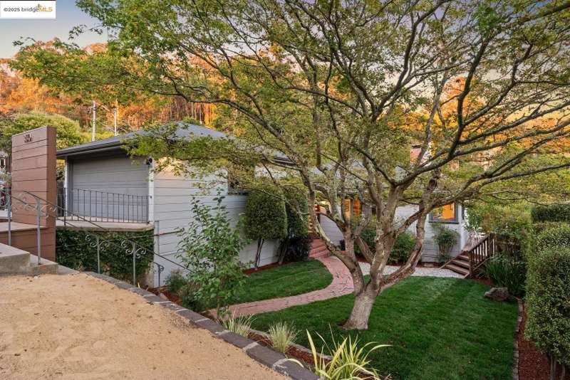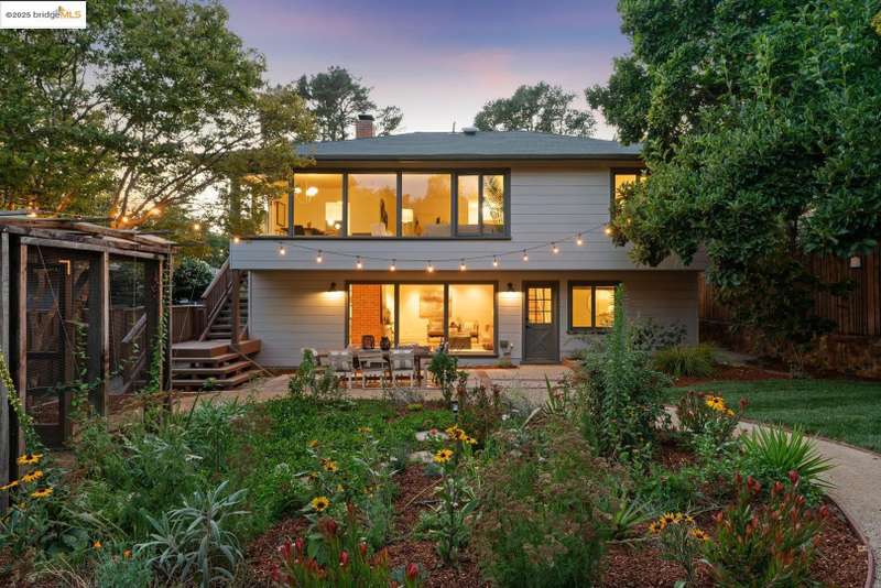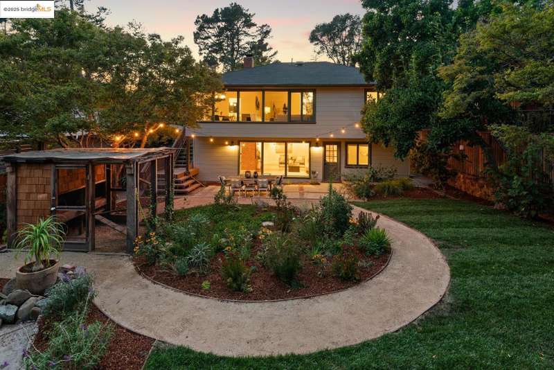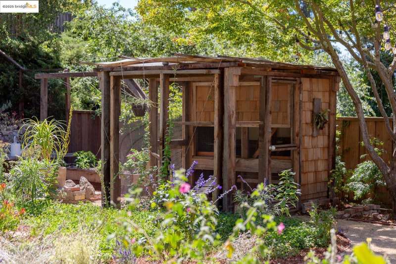 Welcome to the sunny, enchanting pocket of Joaquin Miller, Oakland. Here, beneath a graceful maple tree, awaits an oasis of a home—nestled in nature, a hidden world of its own. A brick path winds through a lush front lawn, the perfect spot for morning coffee. Step inside to discover floor-to-ceiling windows, flooded with natural light, while mature trees frame every view—as if nature itself were the décor. The living room flows effortlessly to the dining area, and an updated polished kitchen. Top-line appliances, custom banquette seating, and live-edge wood shelving, creates a space both functional and beautiful. Open the kitchen’s Dutch door to a small deck—indoor-outdoor living at its finest. Additionally, two spacious bedrooms and a chic updated bathroom await. Downstairs, endless options available for the vast bonus room—customize entirely to fit your life. A garden-view bedroom with office or vanity room, laundry, and a huge storage room will delight. Outside, the backyard blooms with magic—a large patio for al fresco dining, fruit trees, exquisite plantings, an herb garden, and even a handcrafted chicken palace. Birdsong and calm surround you. With an oversized two-car garage and dual EV chargers, this home has it all. Your own retreat awaits- welcome your heart home!