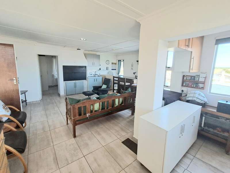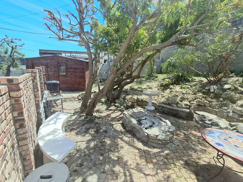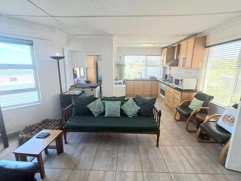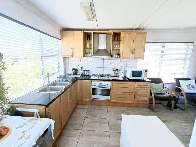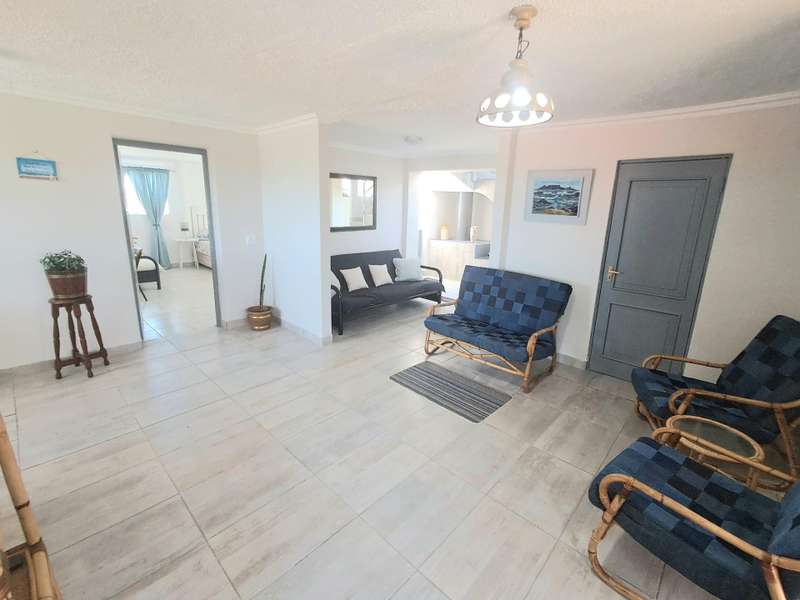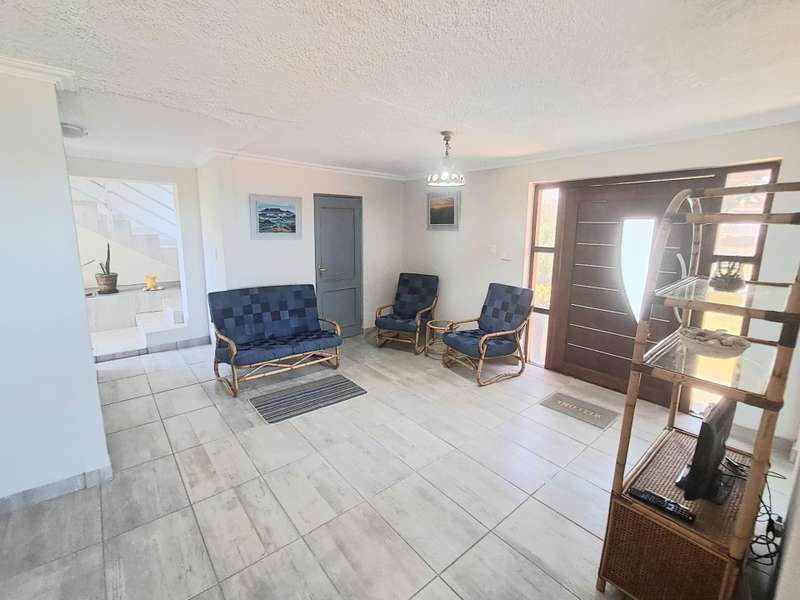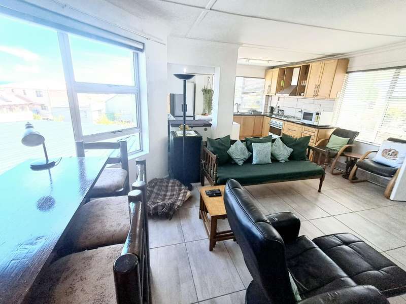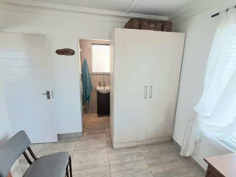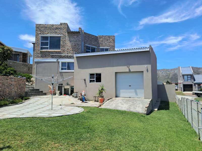 This well maintained and spacious four bedroom home is in an immaculate condition. This house can be a starter or retirement home or a lock up and go holiday home. The ground floor comprises a living area with kitchenette and access to the spacious "drive through" double garage with workshop space. Two bedrooms and separate shower/toilet. The main bedroom is above average size. To the first floor is an open plan living area with built in braai and fitted kitchen (gas hob/ electric oven). Two bedrooms, each with en suite. Main bedroom with open plan bathroom & toilet, and the second bedroom with shower & toilet. From the first floor are distant sea views looking west with mountain views to the east. The property is enclosed at the rear with a spacious garden including a braai pit and Wendy House. Alarm and beams.