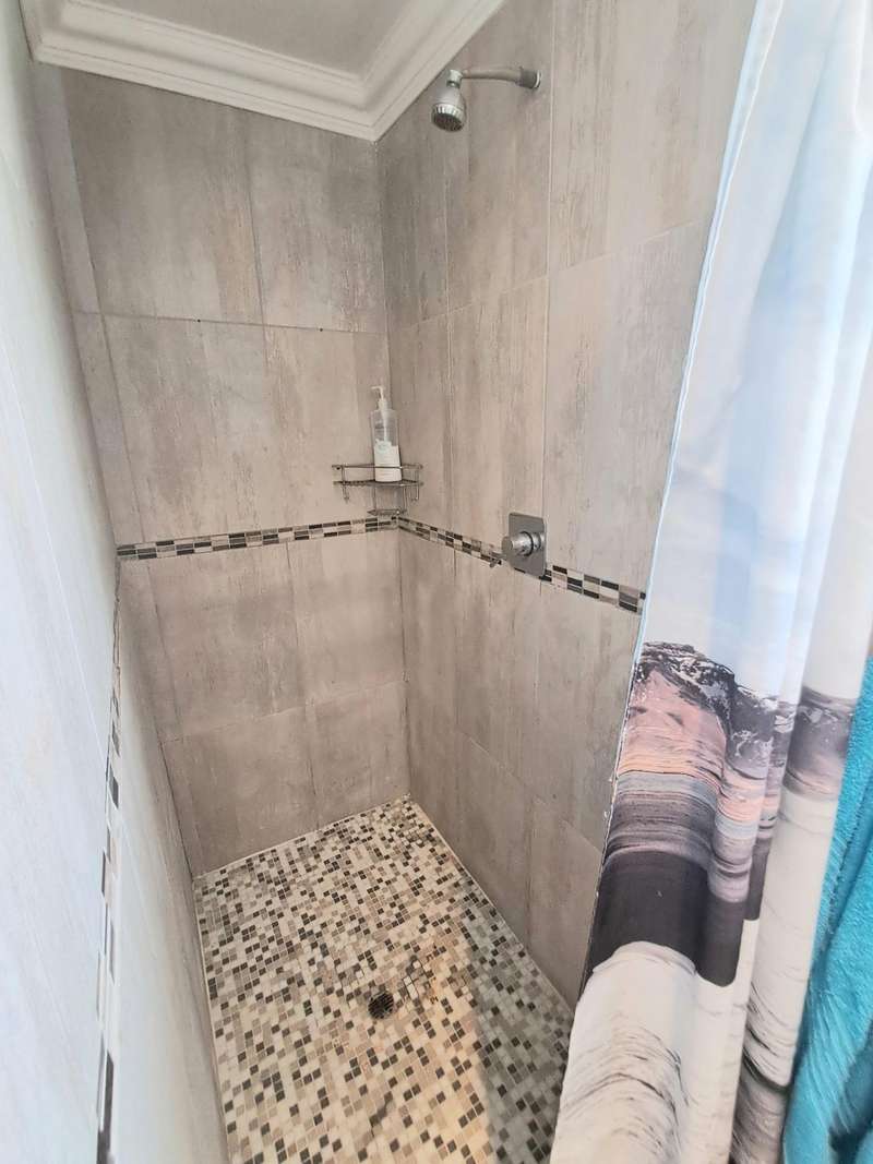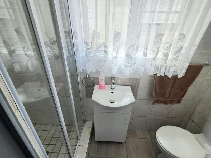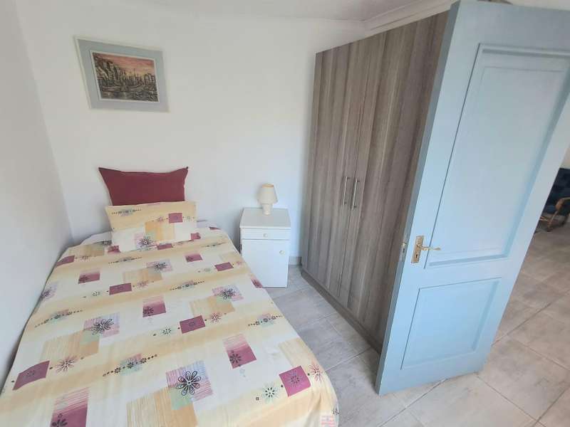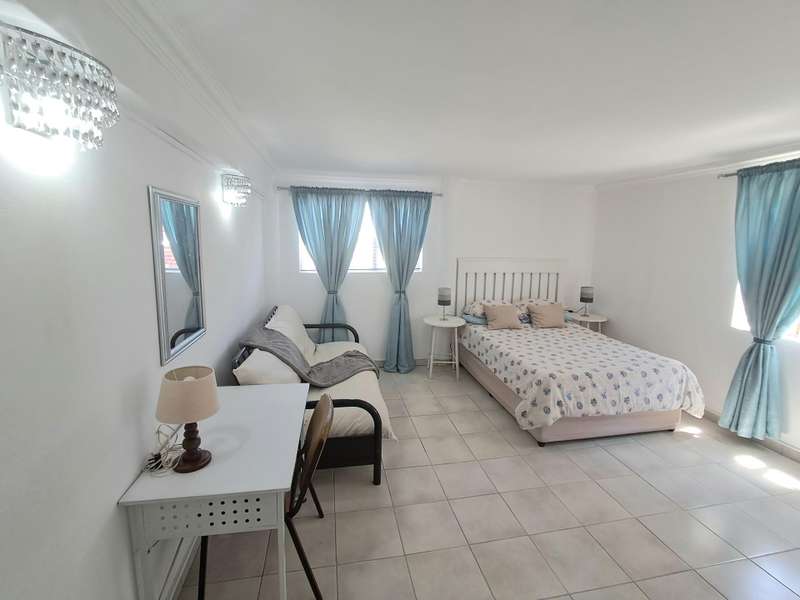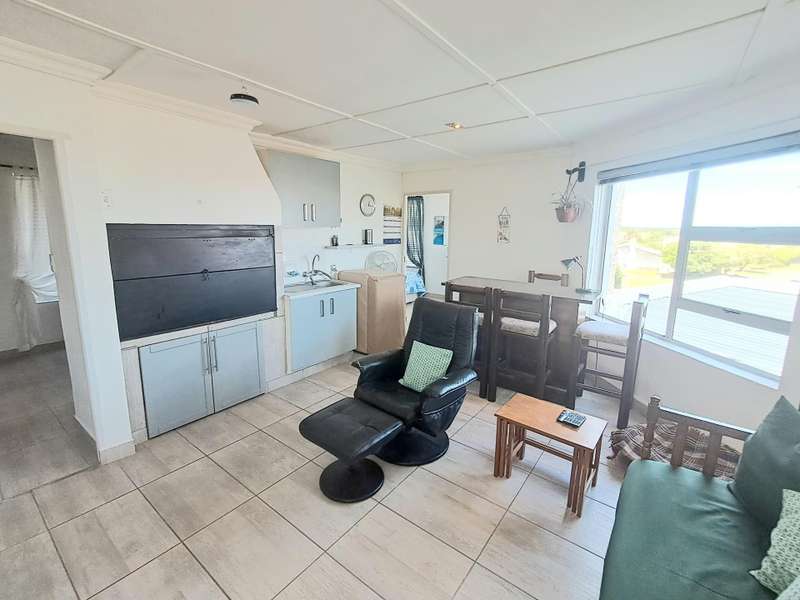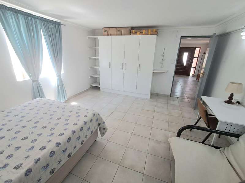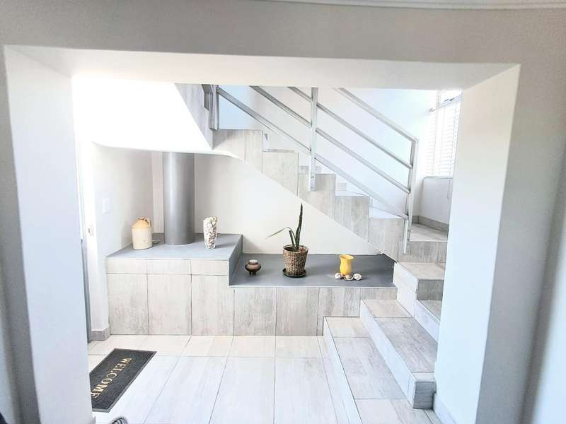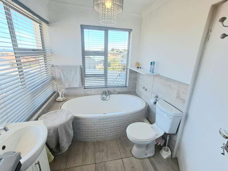 This well maintained and spacious four bedroom home is in an immaculate condition. This house can be a starter or retirement home or a lock up and go holiday home. The ground floor comprises a living area with kitchenette and access to the spacious "drive through" double garage with workshop space. Two bedrooms and separate shower/toilet. The main bedroom is above average size. To the first floor is an open plan living area with built in braai and fitted kitchen (gas hob/ electric oven). Two bedrooms, each with en suite. Main bedroom with open plan bathroom & toilet, and the second bedroom with shower & toilet. From the first floor are distant sea views looking west with mountain views to the east. The property is enclosed at the rear with a spacious garden including a braai pit and Wendy House. Alarm and beams.