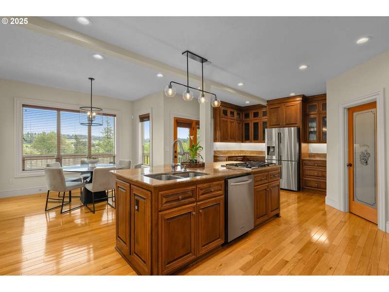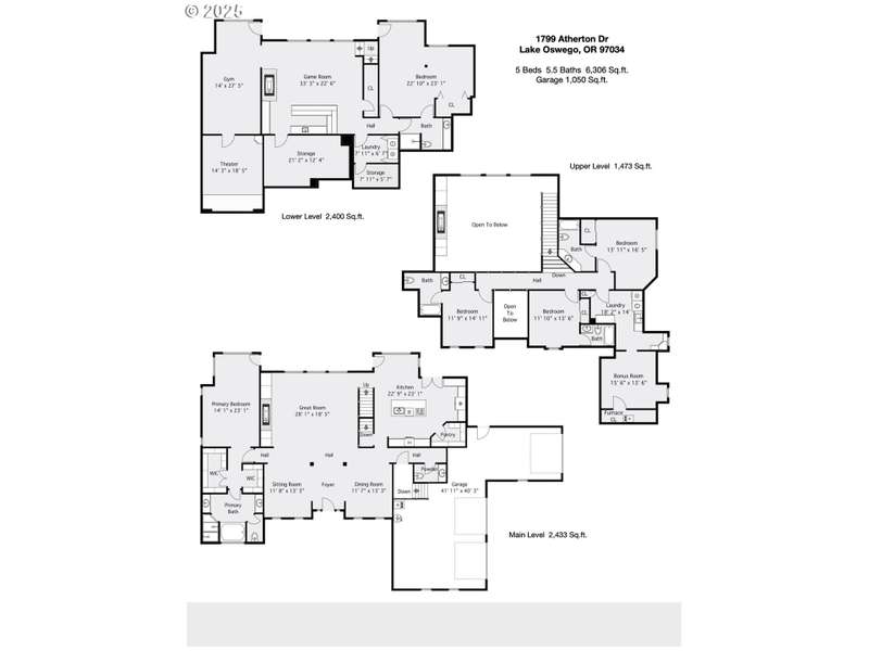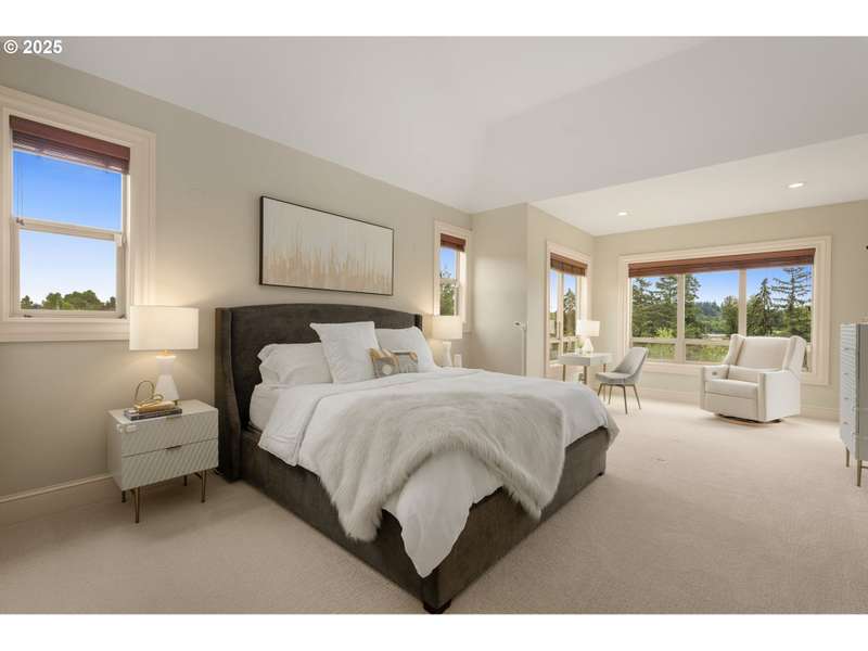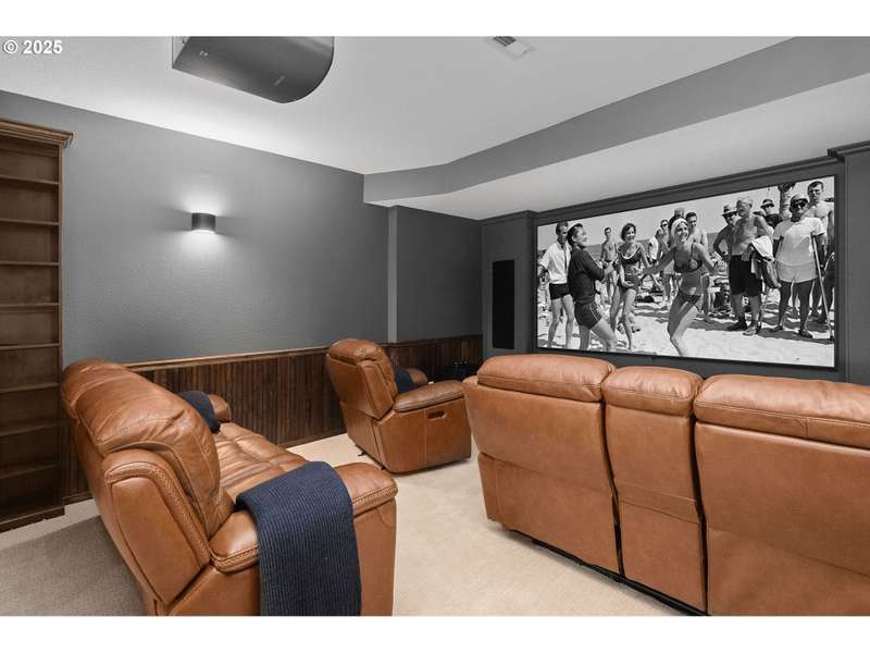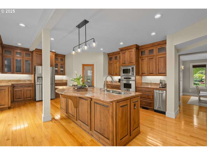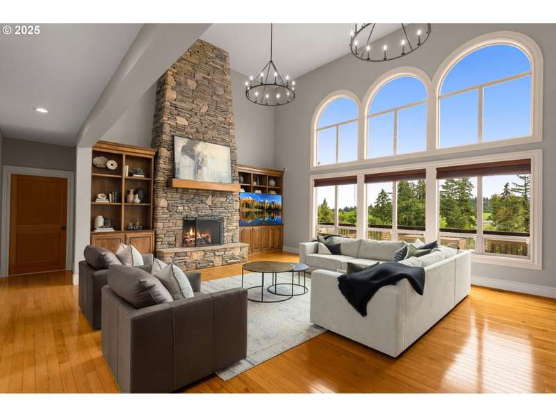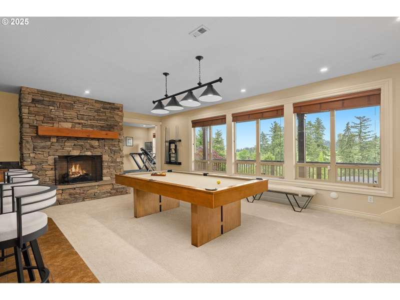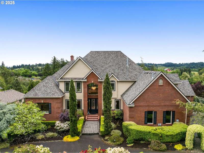 Tucked at the end of a secluded drive and enveloped by nearly an acre of property, this home offers a rare opportunity to own a grand, private estate just minutes from the heart of Lake Oswego. With over 6,300 square feet of masterfully designed living space, this extraordinary residence blends timeless sophistication with modern comforts. A dramatic foyer leads into an expansive great room, where soaring ceilings and floor-to-ceiling stonework frame a striking fireplace. Rich hardwood floors flow into the formal dining area and spacious formal seating area, creating a refined yet welcoming atmosphere. The gourmet kitchen is designed to impress, featuring slab granite countertops, a large island, walk-in pantry, top-of-the-line stainless appliances, and both a breakfast nook and direct access to an expansive entertaining deck with panoramic views. The main-level primary suite is a private retreat, complete with its own stunning vistas, deck access, dual walk-in closets, and a spa-like bath with double sinks, a soaking tub, and elegant tile finishes. Upstairs, three generously sized bedroom suites provide comfort and autonomy for family or guests, each offering walk-in closets and en suite bathrooms. The lower level is dedicated to recreation and entertainment, featuring a fully equipped bar and game room, a professional-grade home theater, and spacious home gym with custom mat flooring. A second oversized primary suite on this level includes its own exterior entrance—ideal for multigenerational living or a private guest escape. Outside, the manicured gardens, raised beds, covered deck, and expansive yard space all create a tranquil oasis for both entertaining and quiet relaxation. Ideally located just minutes from boutique shopping, fine dining, top-rated golf courses, parks and the new Lake Oswego Recreation & Aquatic Center. For the discerning buyer who values serenity as well as access to amenities, this home is the best of both worlds.