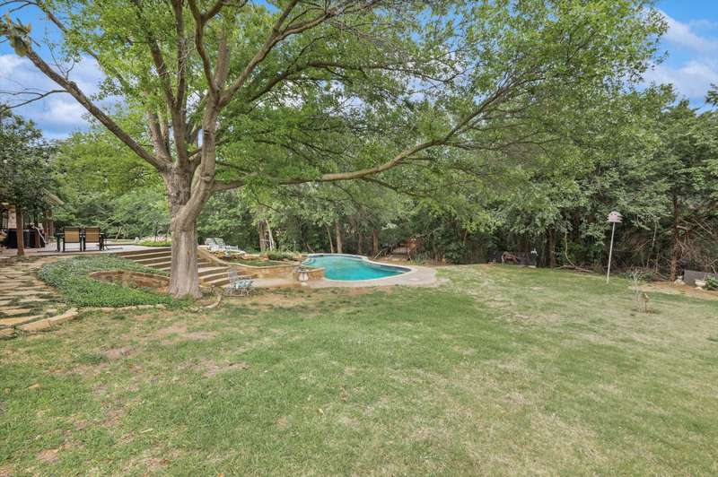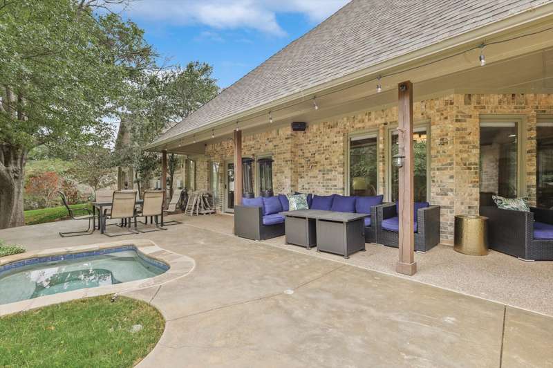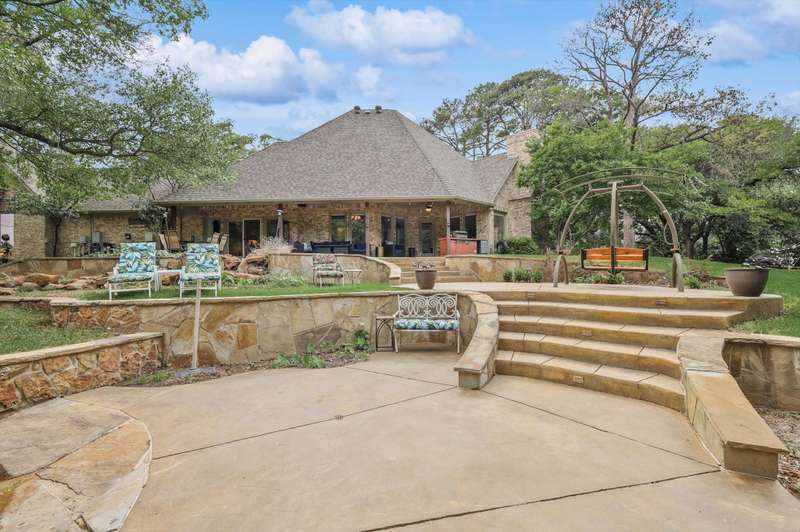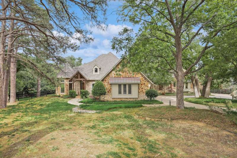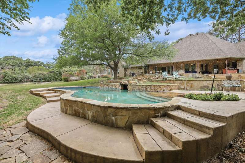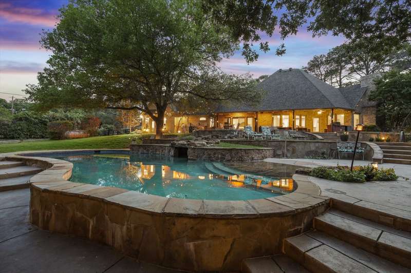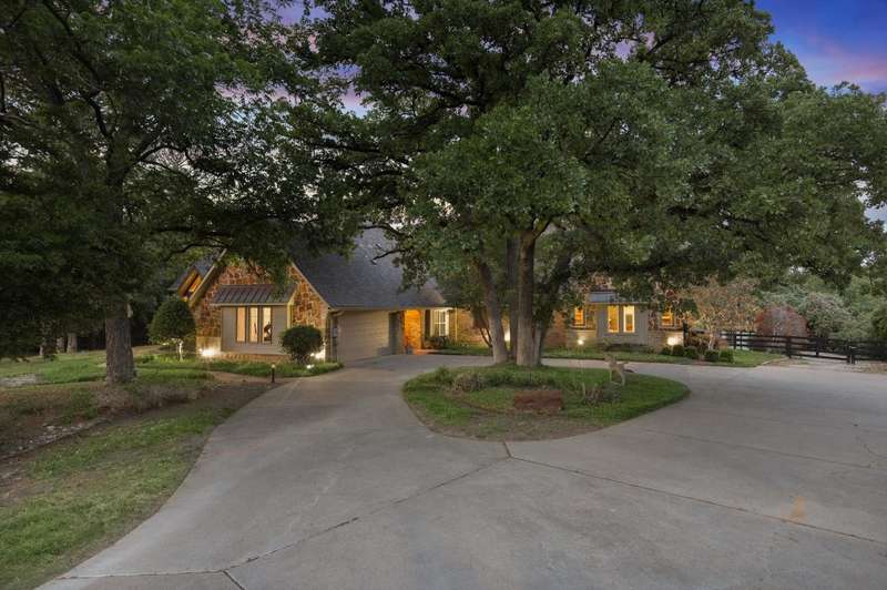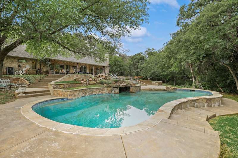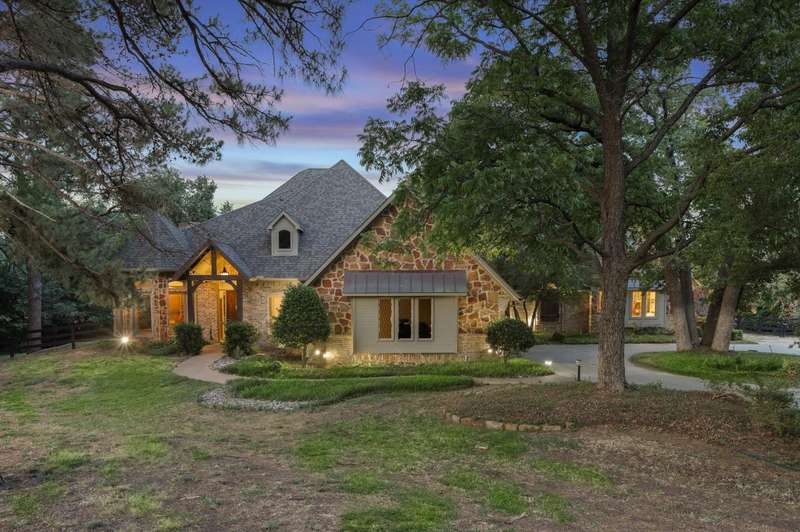 Secluded paradise that offers every amenity you could wish for. Situated on 2.45 acres, this property provides tranquility, breathtaking views, and is within walking distance of Grapevine Lake. The home features designer colors, wood, carpet, and heated ceramic flooring, complementing the numerous picture windows that offer stunning views day and night. It boasts an open floor plan, a gourmet kitchen with an island and granite countertops, and an oversized primary bedroom overlooking the backyard. The primary bedroom includes a dreamy 15'x19' dressing room with an island, mirrors, a chandelier, ample storage, and a comfortable sitting area. You'll also appreciate the home office, complete with picturesque views and built-ins, where the windows conveniently open. Outside, towering trees provide a beautiful backdrop to the sparkling pool with a waterfall and spa. The covered porch is an ideal spot to enjoy the many well-manicured gathering spaces, perfect for entertaining family and friends. Additional features include a private driveway, heated garage floors, and a circle drive for guests. This property truly offers outdoor living at its best, while remaining close to major highways, shopping, and entertainment.