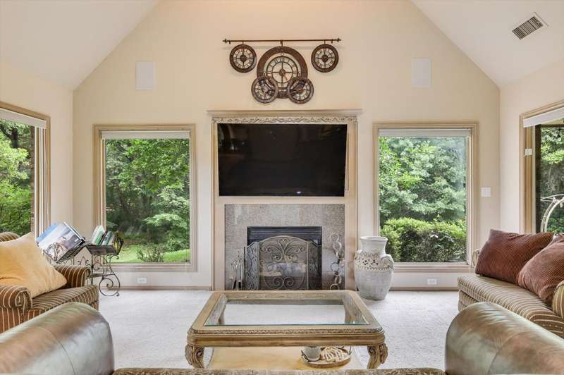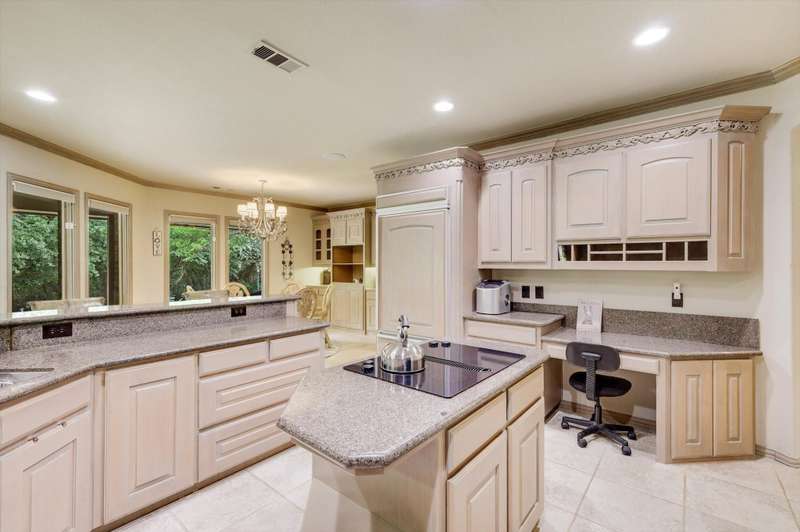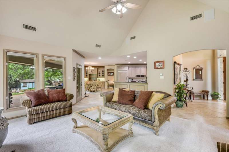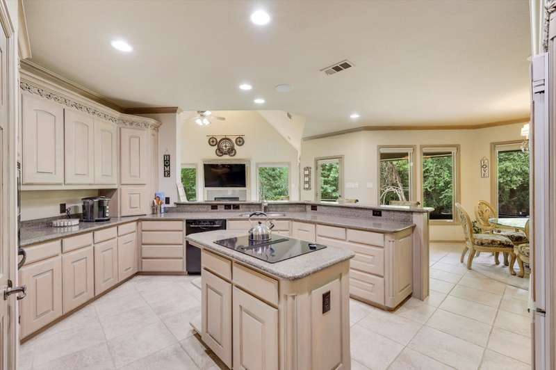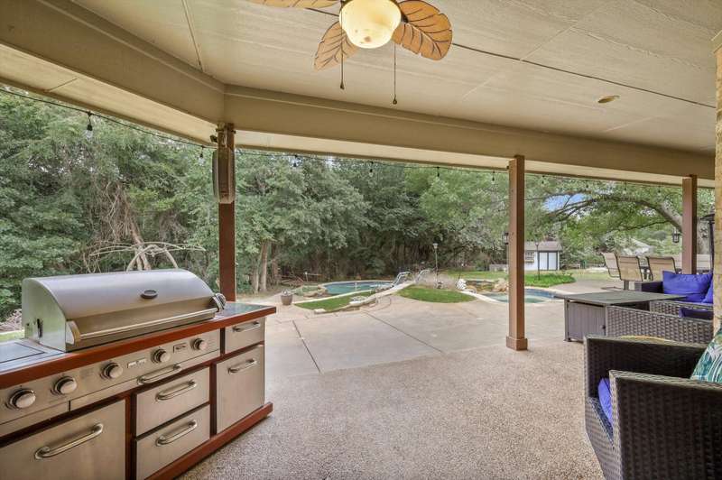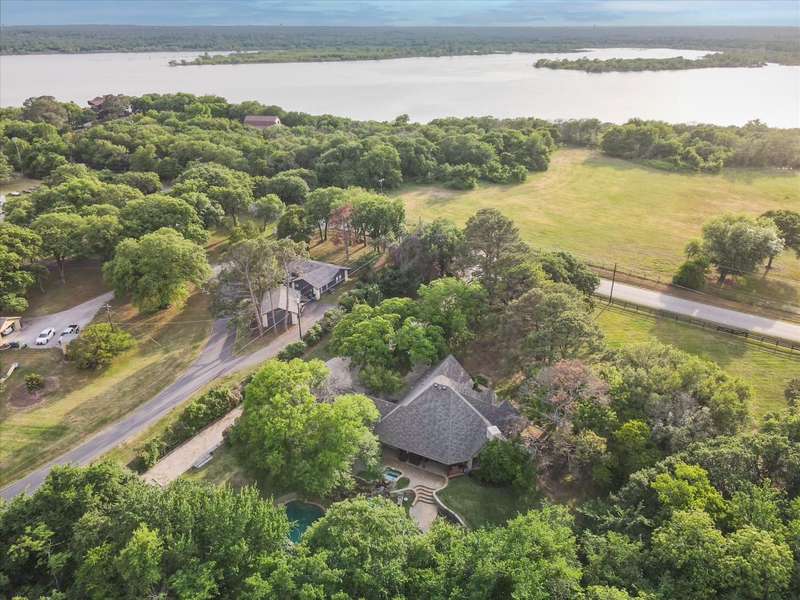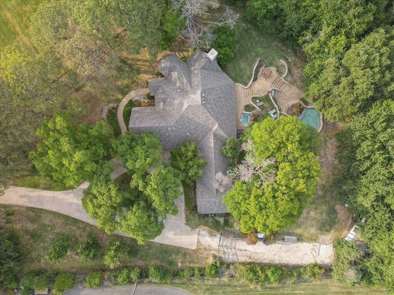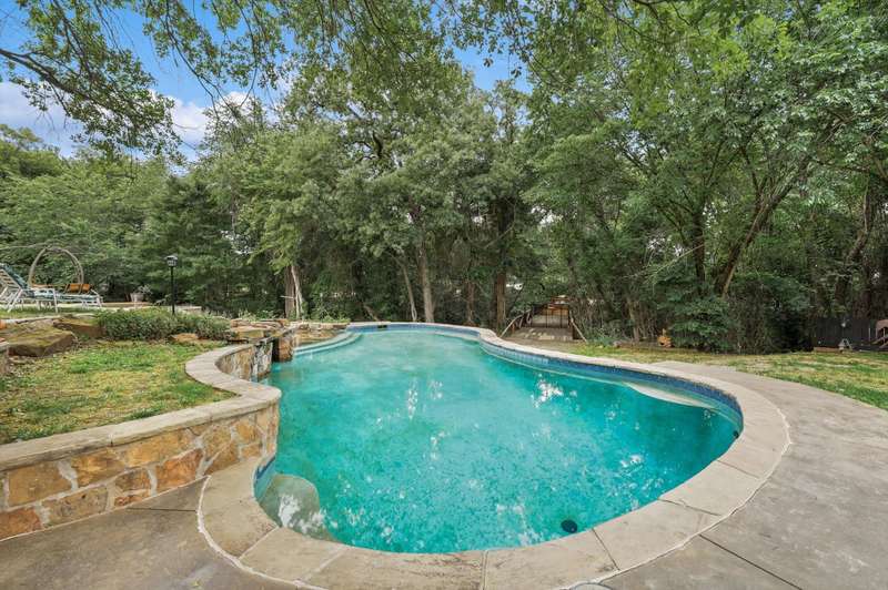 Secluded paradise that offers every amenity you could wish for. Situated on 2.45 acres, this property provides tranquility, breathtaking views, and is within walking distance of Grapevine Lake. The home features designer colors, wood, carpet, and heated ceramic flooring, complementing the numerous picture windows that offer stunning views day and night. It boasts an open floor plan, a gourmet kitchen with an island and granite countertops, and an oversized primary bedroom overlooking the backyard. The primary bedroom includes a dreamy 15'x19' dressing room with an island, mirrors, a chandelier, ample storage, and a comfortable sitting area. You'll also appreciate the home office, complete with picturesque views and built-ins, where the windows conveniently open. Outside, towering trees provide a beautiful backdrop to the sparkling pool with a waterfall and spa. The covered porch is an ideal spot to enjoy the many well-manicured gathering spaces, perfect for entertaining family and friends. Additional features include a private driveway, heated garage floors, and a circle drive for guests. This property truly offers outdoor living at its best, while remaining close to major highways, shopping, and entertainment.