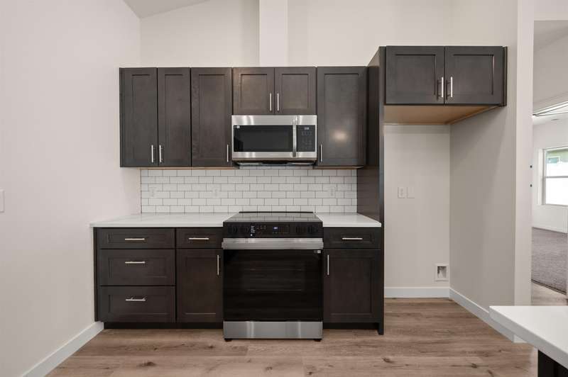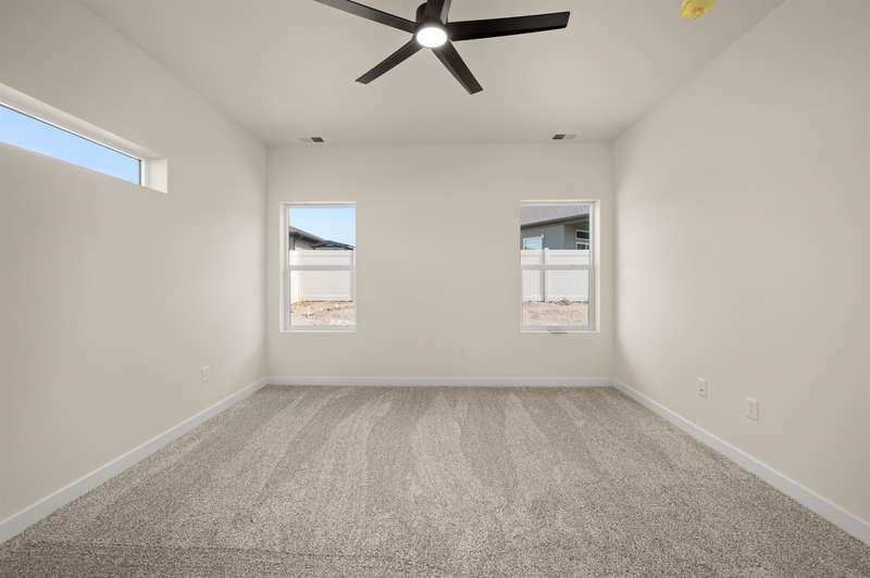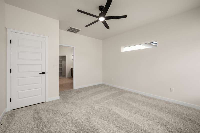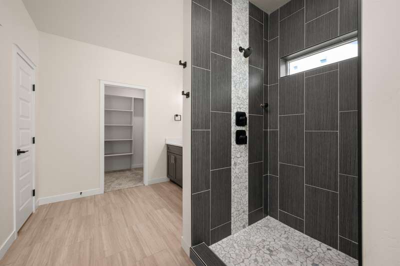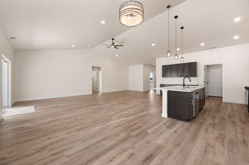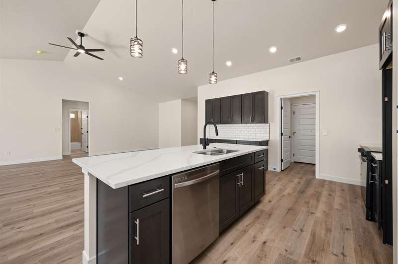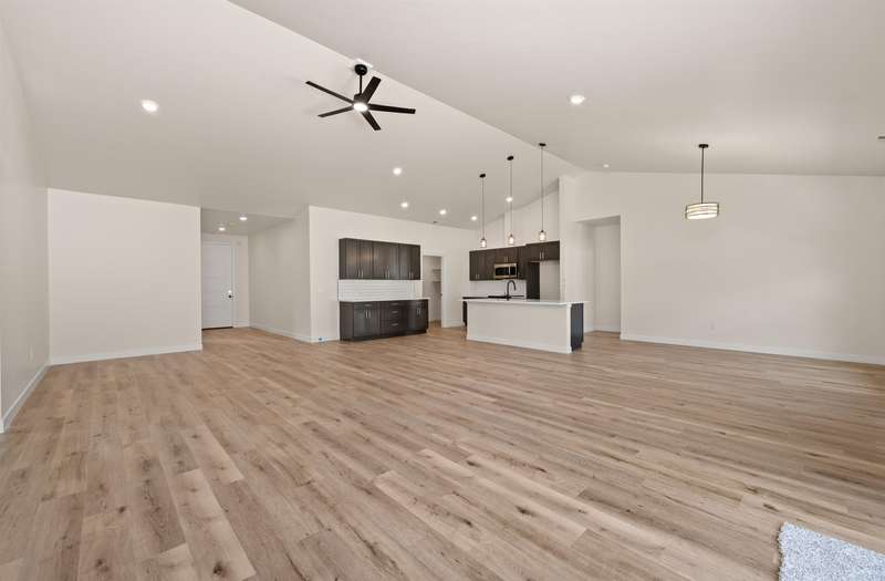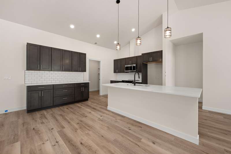 Introducing a new home from King's Contracting with expected completion by mid-July 2025. This contemporary stucco and stone ranch-style residence features a split room layout and includes four bedrooms, two bathrooms, and a three-car garage with space for small RV or utility trailer parking. The home boasts a large, open, and vaulted living, dining, and kitchen area designed for entertaining. Expansive windows overlook the backyard, enhancing the grand living space. The kitchen is equipped with stained slate grey wood cabinets, marble-like quartz countertops, stainless steel appliances, and black hardware for a sophisticated look. A large pantry/closet adjacent to the kitchen provides ample storage. The micro hood is vented to the outside, ideal for the at home chef. The master bathroom offers dual vanities, a large, oversized tile shower with a frameless glass door, a private toilet room, and a spacious walk-in closet. The generously sized fourth bedroom at the front of the house can also serve as an office, craft room, exercise room, or media room. Front xeriscape landscaping, a tan vinyl rear yard fence, and a double RV gate are included. Additionally, the property benefits from pressurized irrigation water.