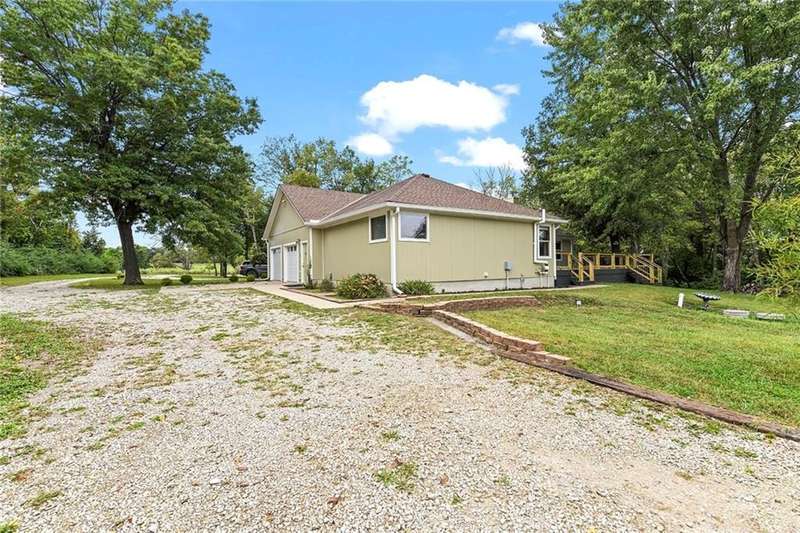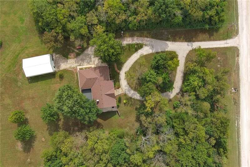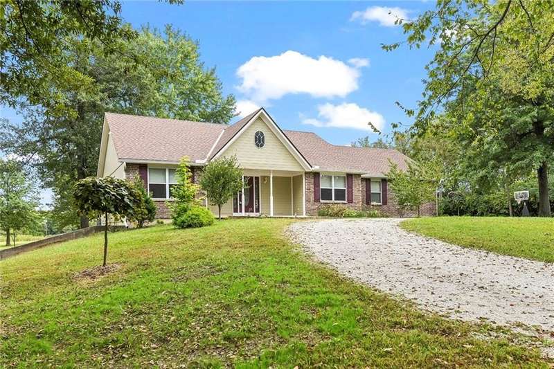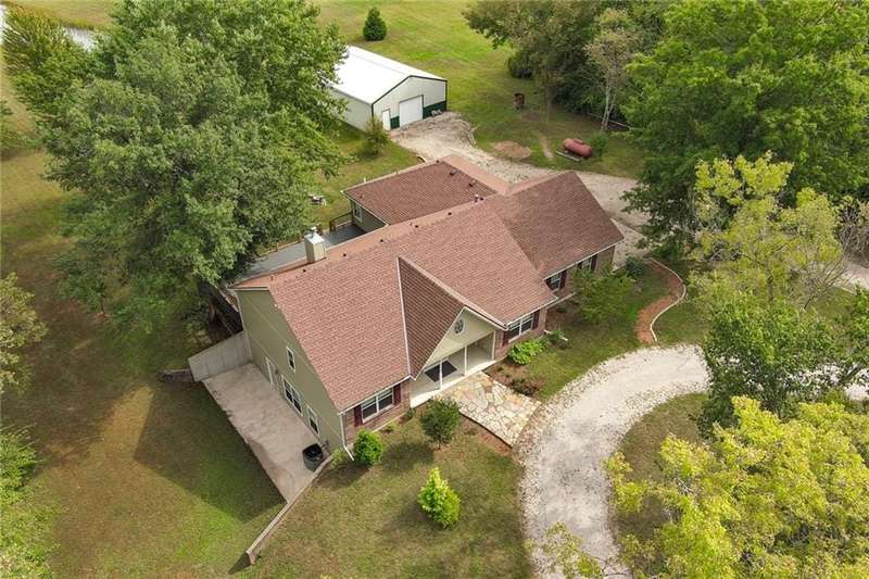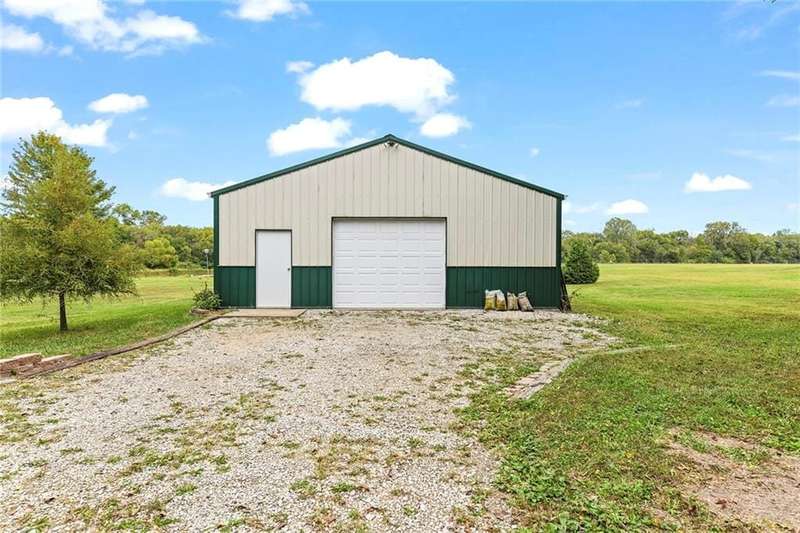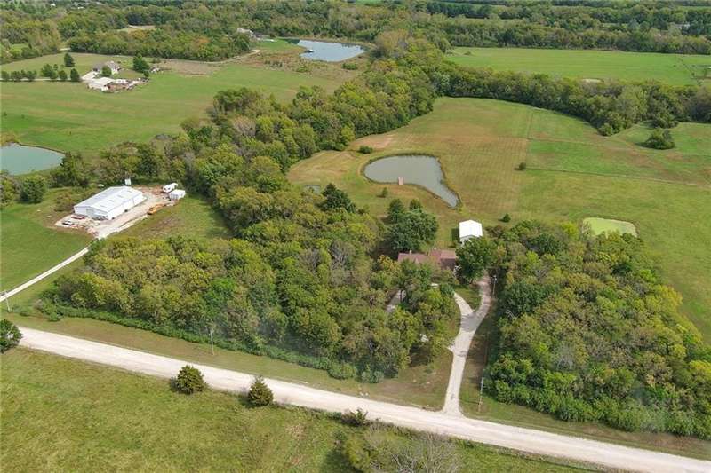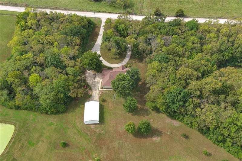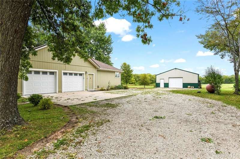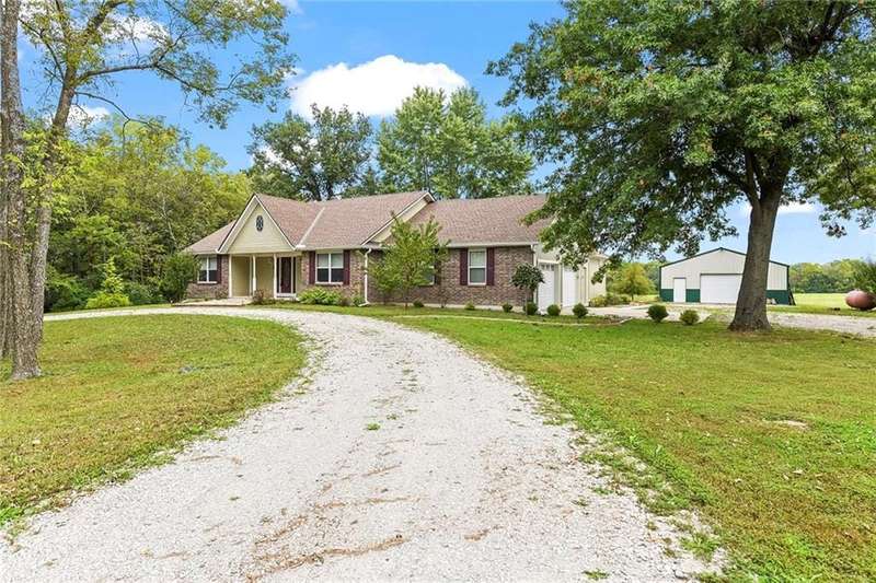 They say location..location..location...this one has it! A beautiful piece of property and very well maintained home close to town on 15.1 acres (much of it wooded). Just about a block off of blacktop. Come enjoy country living with the convenience of being close too, Harrisonville, Raymore, Belton, Greenwood, Peculiar and Lee's Summit. Newer items include: roof (5 yrs), HVAC, insulated garage doors and direct drive openers, septic tanks, dbl wall ovens, (a more complete list is in supplements). One level living includes new carpet in the primary BR (2 huge w/i closets leading into the laundry RM), fresh paint in the 2nd BR and lower level. The lower level is huge and includes a 4th BR (with egress), huge game room, plus another carpeted living area, full bath and a room to suit your own lifestyle, would make a great hobby/craft room or finish it out for a 2nd kitchen...could be a complete mother-in-law set up. There is a bunker (storm shelter) area...and it is a walk-out. Enjoy fishing and wildlife as there is a nice pond with a private dock. The 50X40 Metal outbuilding is complete with concrete floor and electricity (seller is leaving much of the shelving, air compressor & more (again see supplement to the SD for a complete list). The treed entrance adds to the charm of this country property. Don't miss it!