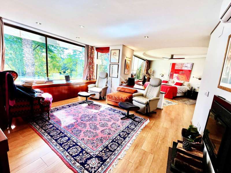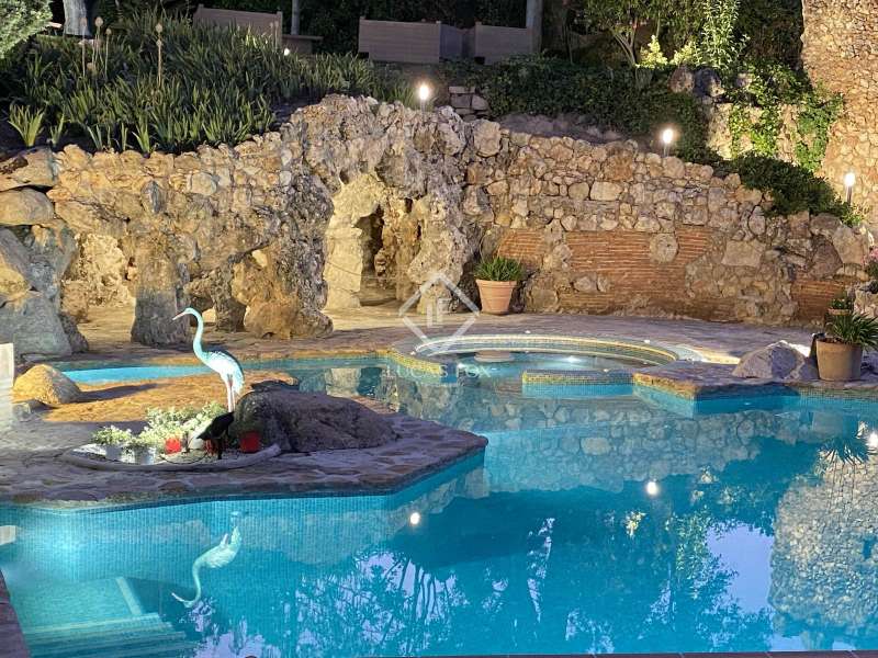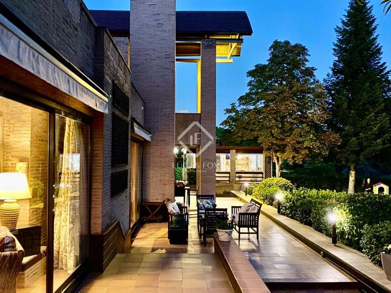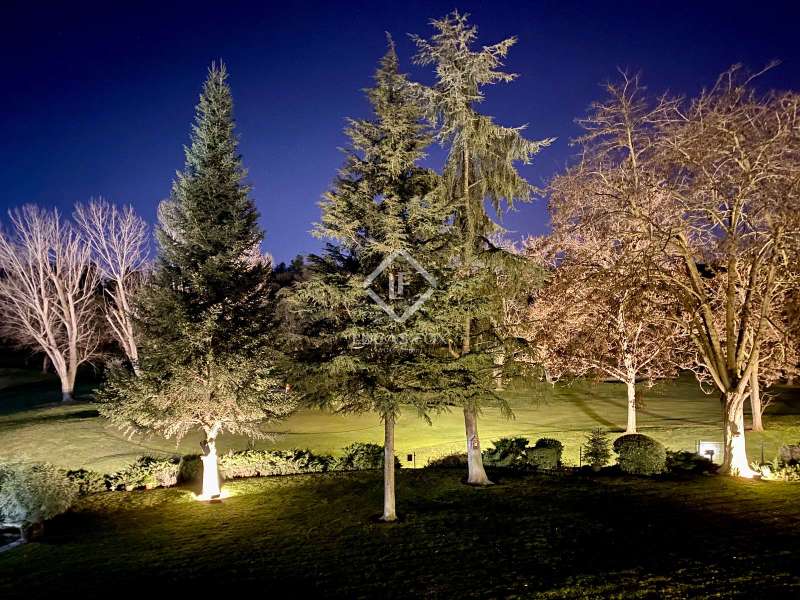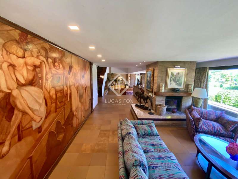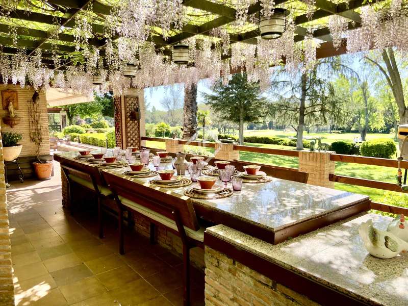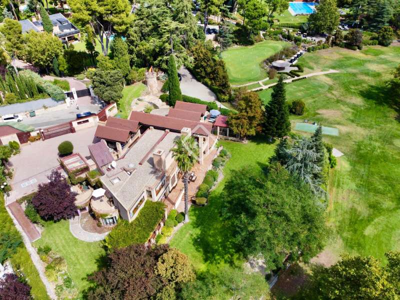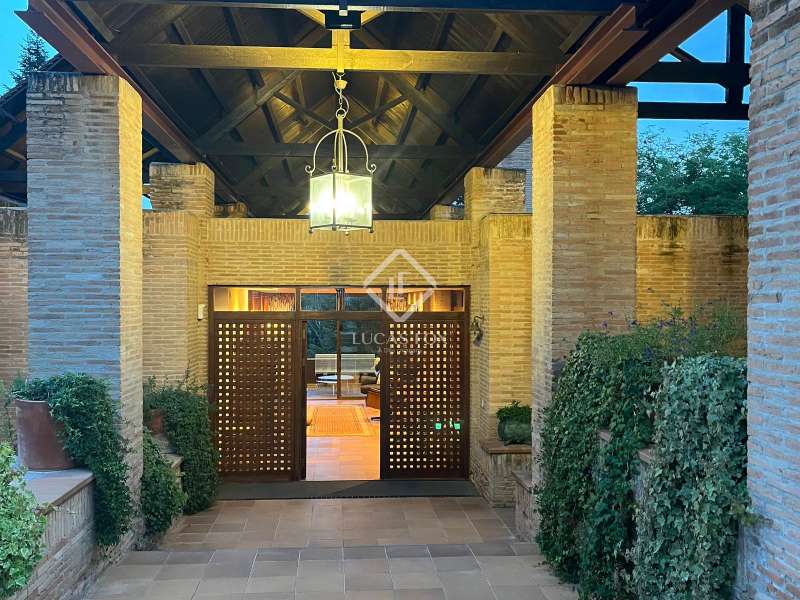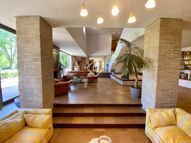 Lucas Fox International Properties is proud to present this unique property, located in one of the main areas of La Moraleja, with an entrance through a cul-de-sac. This magnificent villa was built on a unique plot and enjoys the best position, a permanent water spring, historical buildings and impressive views of the golf course, bordering the plot for about 150 linear metres. The property, designed by the prestigious architect Javier Carvajal, has a timeless and avant-garde design. It has been included in different books that bring together the most representative architectural works of the 20th century. The property was completely renovated in 2020 and has an area of approximately 1,400 m², with very bright rooms and views of the golf course. It is accessed from the upper floor, by a 3-metre wide pedestrian entrance. On one of its sides, a Japanese garden has been built and on the other, a pool of water that cascades down into the swimming pool. Upon entering, we find a large entrance hall, equipped with a terrace that provides the first extraordinary views of the golf course and a large circular two-piece guest bathroom. Later we find two large living rooms, one of them with a double height ceiling and three levels to separate the three spaces, each with a fireplace. Next, there is a cinema room with capacity for 14 people with air conditioning and state-of-the-art equipment, and a circular dining room for 14 diners with air conditioning and access through glass doors to a decorative tiled brick courtyard. The night area includes the 63 m² main suite with access from a private circular entrance hall. It includes a seating area with a fireplace and air conditioning, wall-mounted plasma television with home cinema, separate oak dressing room, large shoe wardrobe, a travertine marble bathroom with whirlpool tub, separate shower and golf views and its own circular terrace. Next, we find a second 58 m² bedroom with a private bathroom, a lounge, views of the golf course, the waterfall and the tower. Two more bedrooms with a complete bathroom and a large closet space complete the night area. The service staff area includes a spacious kitchen, with an indoor and an outdoor dining room which is accessed through an area with a glass floor and a large pantry with a service lift, which is directly connected to the parking space, as well as a bright ironing and utility room with direct access to the garden. All these spaces are furnished with top quality pieces from the Santos brand. Finally, there is a brick 20 m² circular wine cellar or games room with a separate entrance through the garden. There is also an office of 35 m² which is separate from the property, with air conditioning, a service staff apartment with two bedrooms (or a bedroom and living room) and a complete bathroom. Finally, there are rooms with various uses, such as a wardrobe, changing rooms, pool bathroom, materials storage, garden room, bicycle room, and rubbish room. Outside, we find a large barbecue area with a large honed pink granite table with capacity for 14 diners, with additional areas for another 14 people, built-in metal cabinets, sink and metal lattice on the roof of the entire complex, covered by vegetation that provides shade to that area, with two Argentinian barbecues and a professional wood-fired oven made of brick. On the other hand, there is a fully equipped chill-out area, with a honed granite bar counter, professional refrigerators, beer tap, television and pellet heating. It is presented glazed for use in winter with Lumon glass with magnificent views. Finally, there is a covered parking area for two cars that could easily be transformed into a closed garage and an open garage for at least six more, which could be covered, as well as a large outdoor car park in the cul-de-sac area. In summary, this beautiful and luxurious high-end house is presented in perfect condition, making it one of the largest and most impressive homes in the Moraleja area, not far from the town centre of Alcobendas and of all its benefits. Contact Lucas Fox today for more information or to arrange a viewing. We work seven days a week to adapt to the needs of our clients.