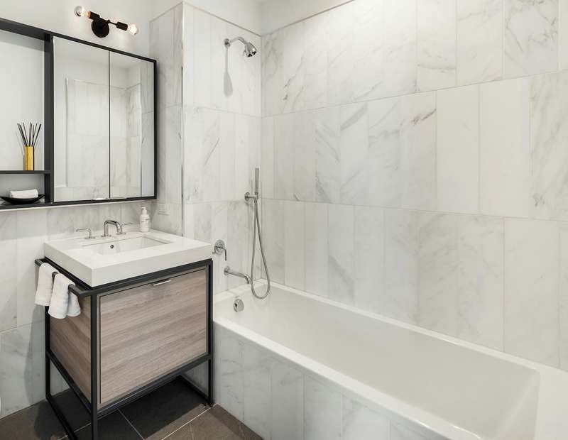 Residence PHD, is an expansive corner unit and features an open concept kitchen, dining and living room. Enjoy your private wrap around balcony and terrace, which is easily accessible from the living room. Inside floor-to-ceiling double-paned windows facing Park Slope to the east and The Verrazano Bridge to the South bring in abundant light. Unit finishes include a 7" European oak wood flooring, a custom kitchen with walnut cabinetry, fully integrated Thermador and Bosch appliance package, Blum German hardware with soft close drawers, and gleaming Alleanza quartz countertop with matching backsplash. The primary bedroom offers stunning open views of Park Slope to the East. The luxurious bathroom features Dolomiti marble tile wall and slab countertops, Waterworks fixtures, custom oak vanity and Kohler sink. A washer/dryer, multi-zone heating and cooling system, complete this luxurious, modern home.