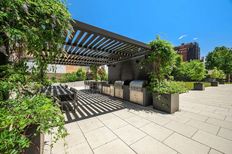 575 Fourth's robust amenities include a double-height attended lobby, well-appointed state-of-the-art fitness center with adjoining yoga studio, whimsical children's playroom, music-room, game room and modern resident lounge with workspaces. Multi-floored bicycle storage ensures quick and easy storage. Enjoy sweeping views of the Brooklyn and Manhattan skylines, New York Harbor and Statue of Liberty from the building's common roof deck featuring sundeck, outdoor showers, lounge area, and dining area with BBQ grills. A second greenspace with outdoor great lawn, trellis-covered al-fresco dining area with adjacent BBQs, children's playground and fenced dog run provides spaces to play, relax, and recharge. Indoor parking and private rooftop cabana are available for additional fee.