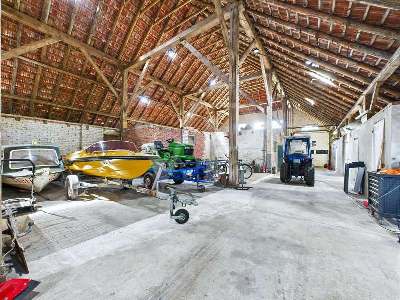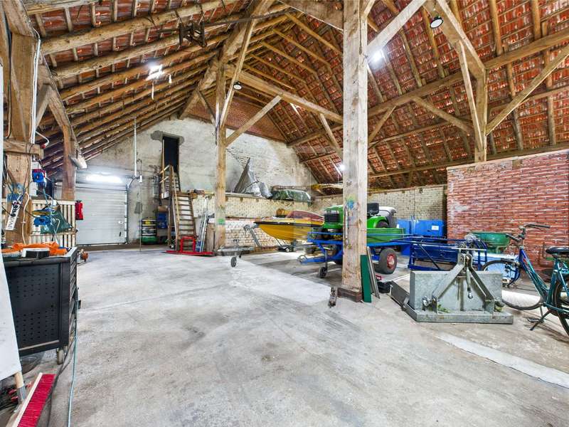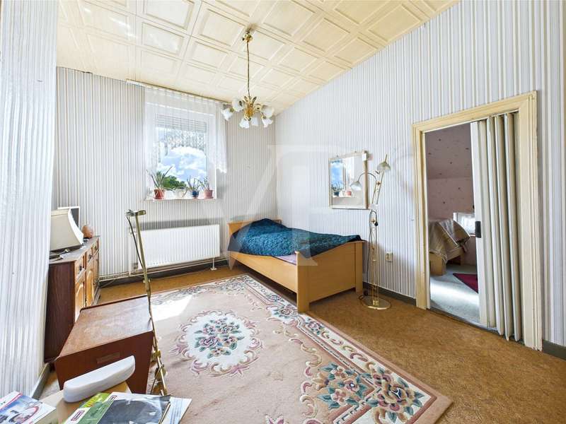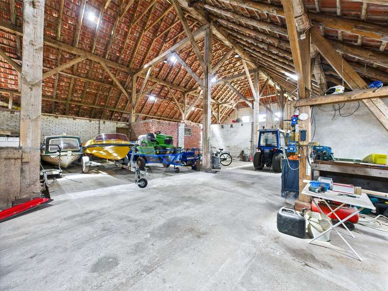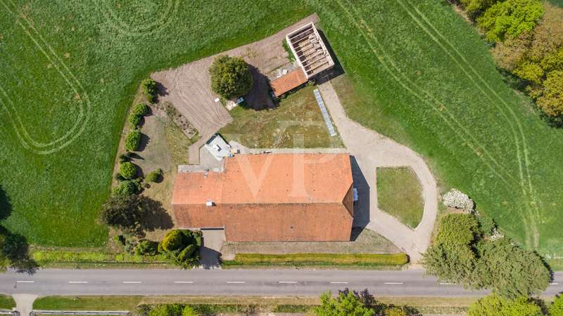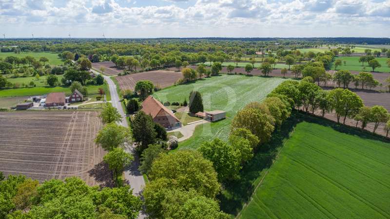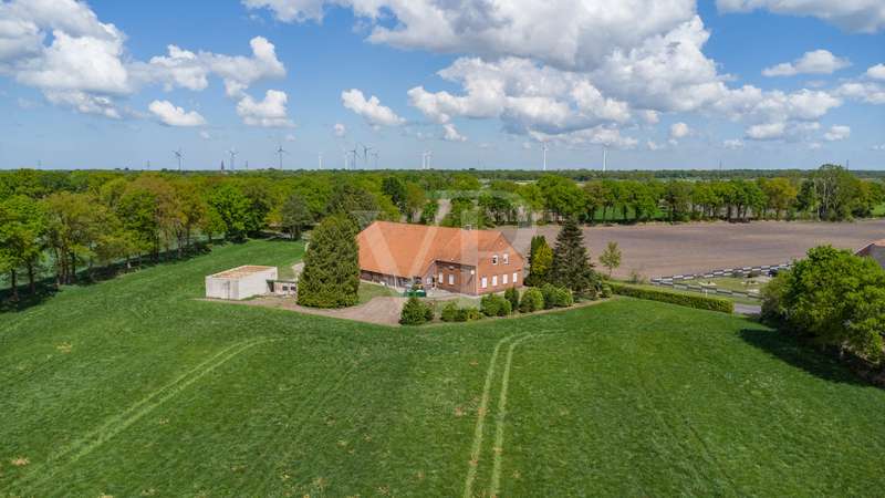 This Gulfhof dating back to 1955 is situated in a peaceful rural location on a spacious plot with around 2.4 hectares of pastureland - ideal for people who want to keep animals or have an agricultural background. The property not only offers plenty of space for personal development, but also enormous potential for individual usage concepts. The very good condition of the barn section, which was overhauled around 15 years ago, should be emphasized. On entering the house, you are greeted by the classic hallway, from which you can access the first floor. Here you will find a spacious eat-in kitchen, the adjoining living room and two bedrooms. A bathroom, a separate WC and a small cellar room under the hallway complete this level. The rooms have a solid basic structure, but require renovation in parts - an advantage for anyone who wants to realize their own living ideas. The functional floor plan continues on the top floor: two further bedrooms, one of which has a practical storage room, and a bathroom offer space for family or guests. A small additional room, which is accessible from the second bedroom, can be used flexibly as a guest room or study. In addition to the existing rooms, there is also a large expansion reserve here. Adjacent to the residential building is the former farm part of the courtyard. This includes a boiler room, a large garage with modern doors, former stables, a workshop area and a versatile party room. There are also several storage rooms and passageways. The courtyard area is easily accessible and has a large turning circle - a real plus for agricultural use. The property is complemented by a massive, large hall, which is in a well-kept condition. The existing small sewage treatment plant, solid blown-in insulation and renewed windows and doors form a good technical basis for future expansion or modernization projects. The spacious outdoor area with terrace and pastureland surrounding the property creates space for people and animals - close to nature, functional and freely configurable. A property with potential: this Gulfhof combines space, views and scope for use in a quiet location - perfect for anyone who wants to combine living, working and keeping animals under one roof.