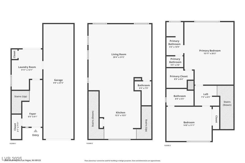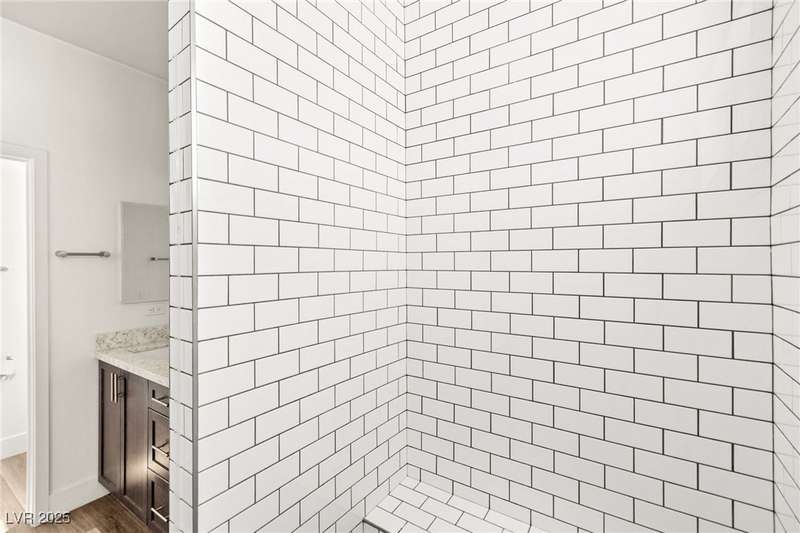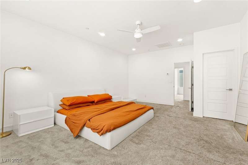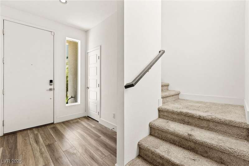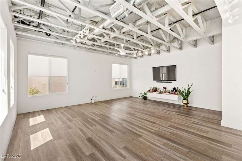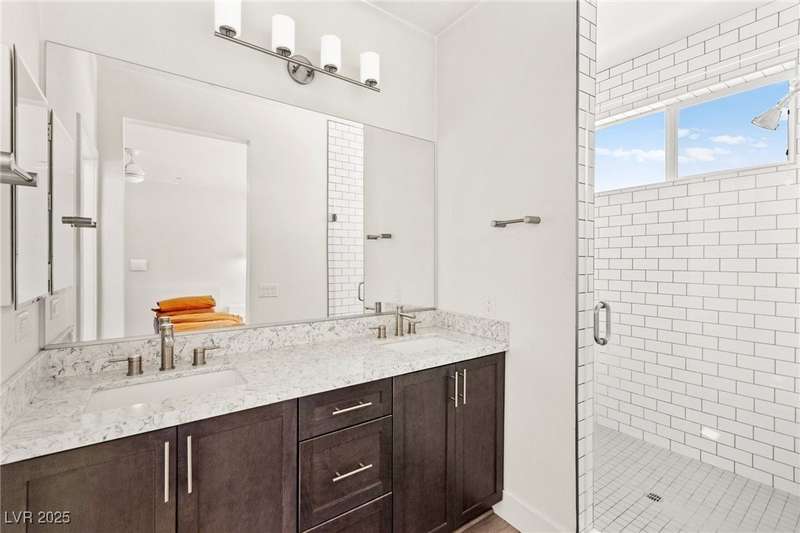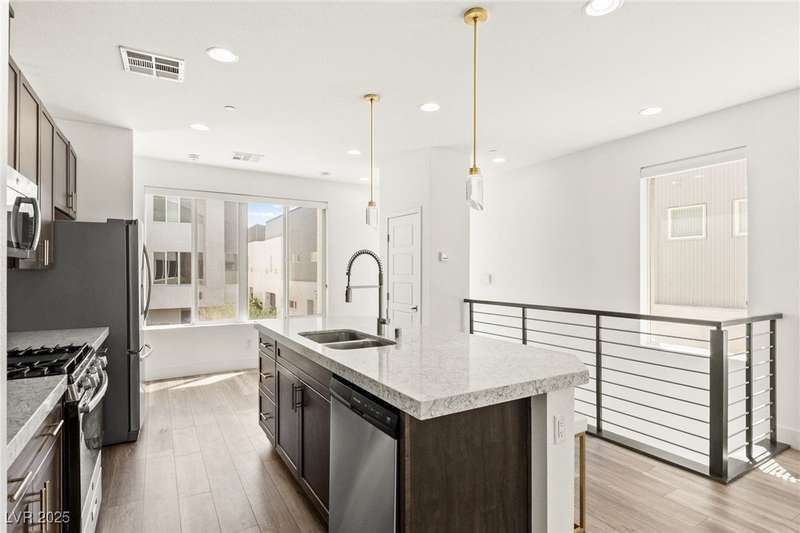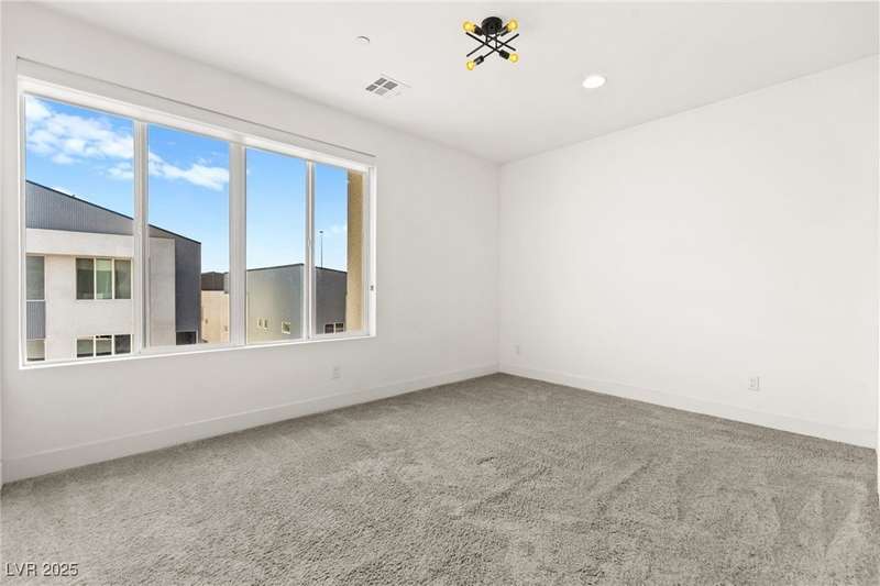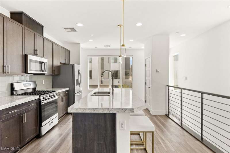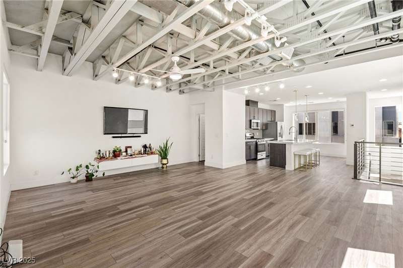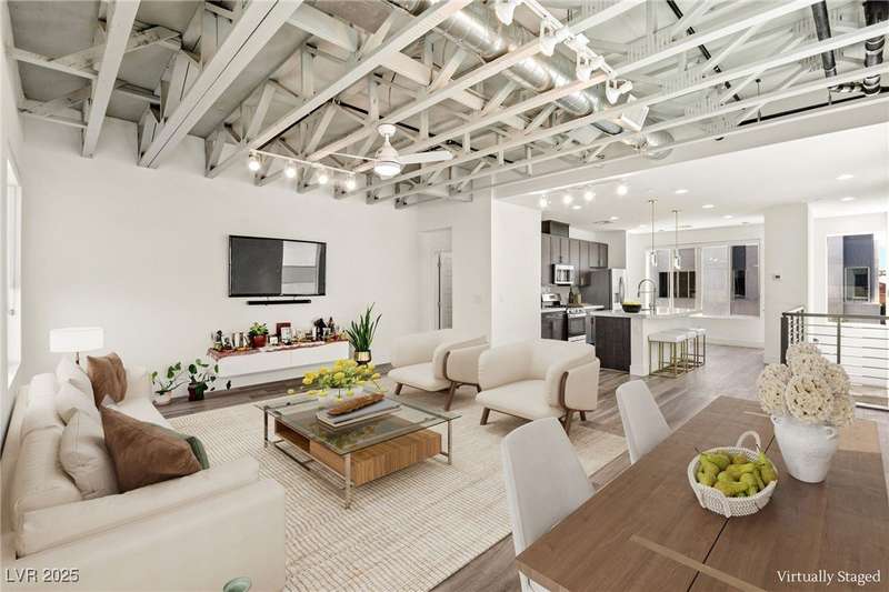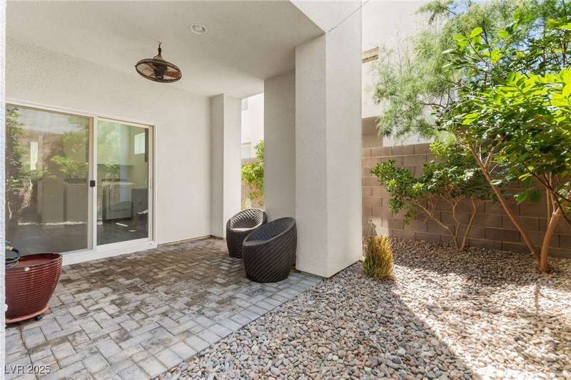 This modern-urban-industrial designed home offers exceptional living in a prime location, conveniently situated close to the Raider's Stadium, Town Square, and the vibrant Las Vegas Strip.The interior of this condo is designed with an open concept, featuring a stunning kitchen with stainless steel appliances, a spacious island that's perfect for entertaining, and a stylish subway tile backsplash. The living room is wonderfully light and bright, thanks to an abundance of windows, and boasts unique exposed ceiling beams that add to its modern aesthetic. The third-floor master suite is a true retreat, complete with a customized walk-in closet, a luxurious walk-in tile shower, and impressive views of the Strip. The second bedroom offers an en-suite style with its own attached bathroom, providing privacy and comfort. Additionally, the private backyard is designed for relaxation and ease, offering a covered patio, attractive pavers, and low-maintenance landscaping.