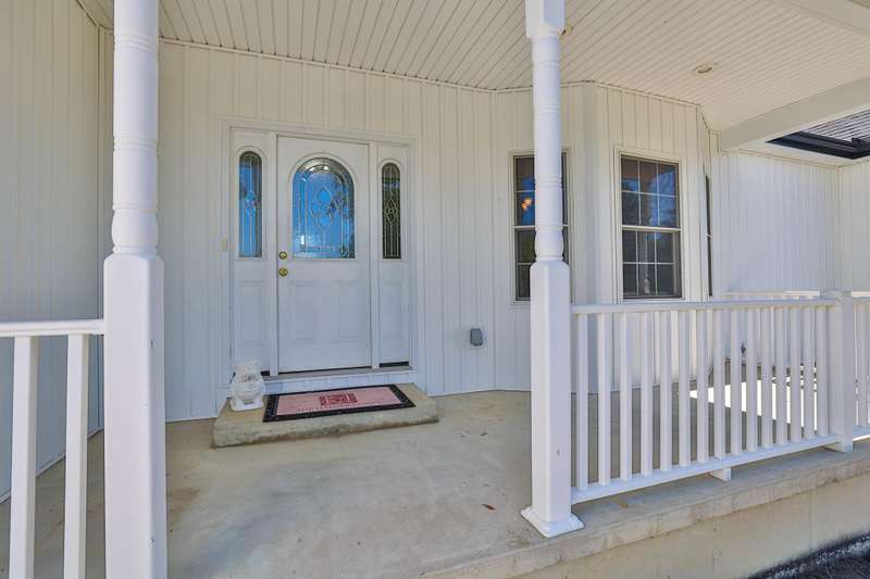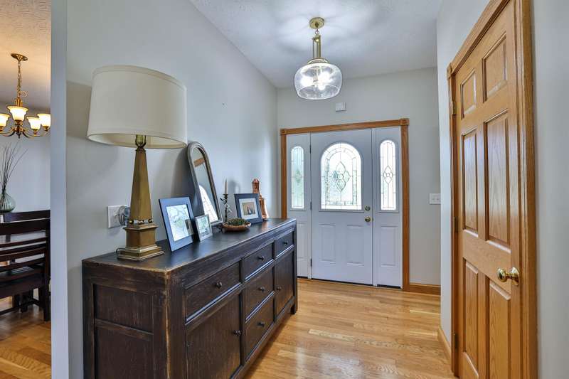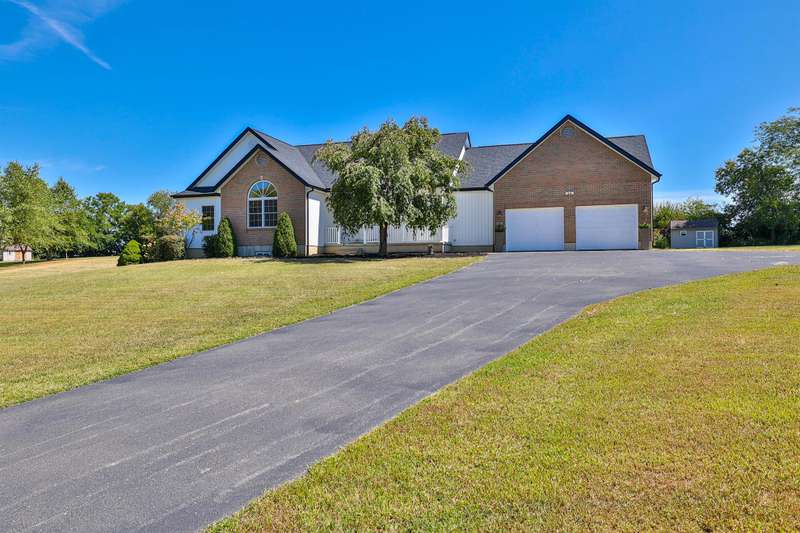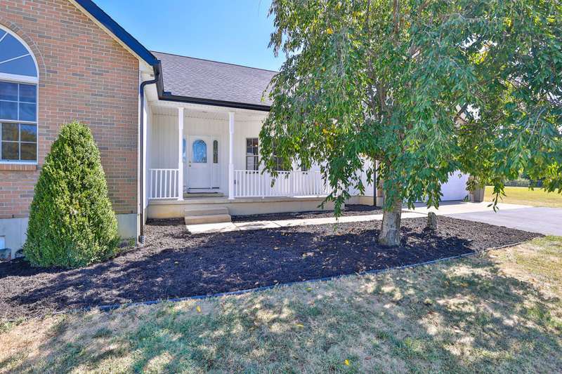 Immaculate Ranch on 2 Acres in Eastland Meadows.Beautiful custom-built ranch nicely situated on a quiet cul-de-sac lot. This move-in ready home sits on 2 scenic acres and features hardwood floors throughout the main living areas, a spacious living room with cathedral ceilings, gas fireplace, and access to a large deck (14x14). The open kitchen offers a walk-in pantry (8x4), breakfast bar, recessed lighting, loads of cabinet and counter space, open to large dining area and all appliances stay including a brand new refrigerator. The first-floor laundry includes cabinetry and the washer and dryer will stay.The full walkout basement has 9 ft ceilings, is roughed in for a bathroom and offers access to a huge patio (25x17) and features storage room that doubles as a storm shelter (21x6). The oversized 2½ car garage (32x26) includes openers plus a third door that opens to the side yard. The primary suite has tray ceilings with ceiling fan, a walk-in closet (7x6), and a large bath with a jetted tub, separate shower, and double vanity. Anderson windows, solid 6-panel wood doors, a covered front porch, and a backyard shed add even more appeal. Recent updates include a new roof (July 2025), new heat pump (July 2025), new siding (August 2025), and new gutters (August 2025). Extra clean and ready to move in.