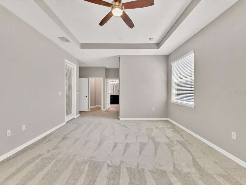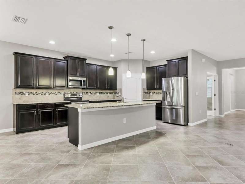 Welcome to your dream home in the peaceful, gated community of Del Tierra! This stunning 3-bedroom, 3.5-bath open-concept residence offers over 2,500 SqFt of thoughtfully designed living space and has been meticulously maintained by the original owner with updates throughout. Key Features Include: New Roof (11/2024), New Carpets in all bedrooms, and Freshly Painted Interior & Exterior. Step inside and immediately be captivated by the breathtaking view of your private backyard oasis, framed by large sliding glass doors that flood the home with natural light. This home blends comfort, elegance, and functionality at every turn. Just off the foyer, you'll find the first bedroom with plush carpeting and a built-in closet with built-in shelving. Adjacent is a full bathroom featuring granite countertops, a tub/shower combination, and elegant ceramic tile. A cozy den or home office with French doors offers privacy and flexibility, ideal for remote work or a quiet retreat. The heart of the home opens to a spacious great room and a chef-inspired kitchen designed to impress. The kitchen features: Stainless steel appliances including LG refrigerator with dual ice maker, GE range, microwave, and dishwasher, oversized granite island with garbage disposal, full-height coordinating backsplash and soft-close wooden cabinetry, Generous pantry with spice rack. Abundant of electrical outlets for your kitchen gadgets throughout the kitchen. The dining area is thoughtfully placed just off the kitchen, perfect for everyday meals or entertaining guests. The great room includes three floor outlets for discreet cable management and is prewired for surround sound. Bedrooms, lanai, and garage are prewired for speakers. Retreat to the luxurious master suite, complete with a tray ceiling, ceiling fan, private lanai access, and two walk-in closets. The en-suite bathroom features dual granite vanities, a soaking tub, a glass-enclosed shower with a bench, and a separate water closet for privacy. The third bedroom makes a perfect guest suite with its own walk-in closet, and a private en-suite bathroom with a granite vanity and walk-in shower. Step outside to your fully screened-in lanai oasis featuring a working hot tub, ceiling fan, and peaceful views of your private backyard. There's even a convenient half bath under air with a granite countertop sink. The laundry room offers wooden cabinetry, a storage room with shelving, and LG washer & dryer, all situated near the entrance to the oversized 3-car garage. The garage boasts epoxy flooring, dual door openers, built-in cabinets, a utility sink, a workbench, and hurricane shutters with hardware. The property also includes a 4-zone irrigation system powered by reclaimed water to keep the landscaping lush and low-maintenance and aluminum gutters. Minutes to SR-64, I-75, and Ft. Hamer Bridge. Close to Gene Witt Elementary (bike ride away). Nearby shopping including Costco, and many more! Residents of Del Tierra enjoy access to a resort-style pool, fitness center, and gated entry all while being surrounded by nature and tranquility. This home truly has it all: elegant design, thoughtful upgrades, and an unbeatable location. Don't miss the opportunity to make this beautiful home yours!