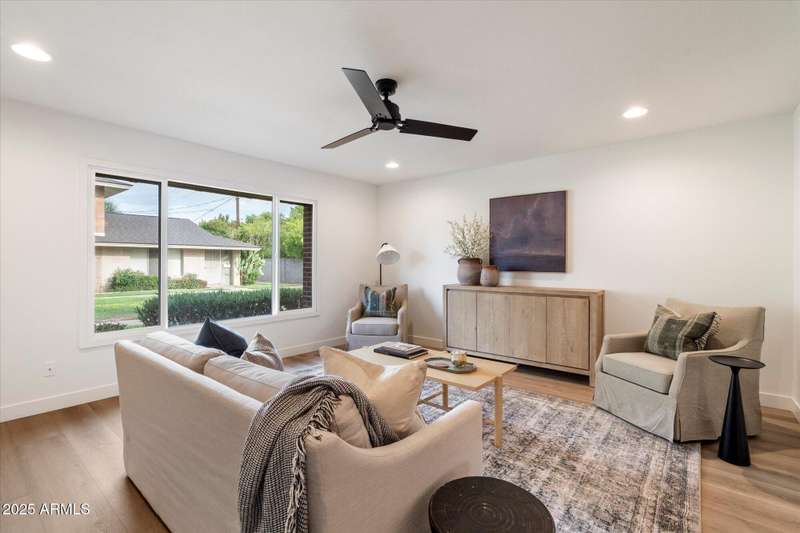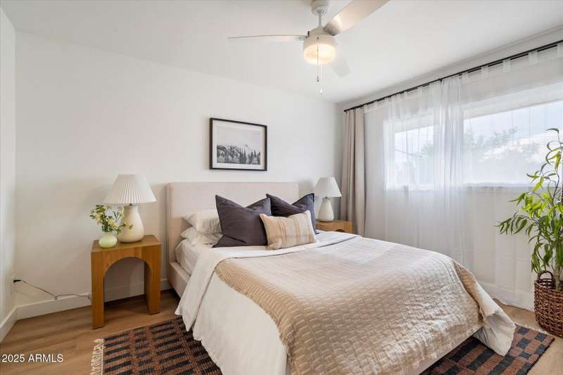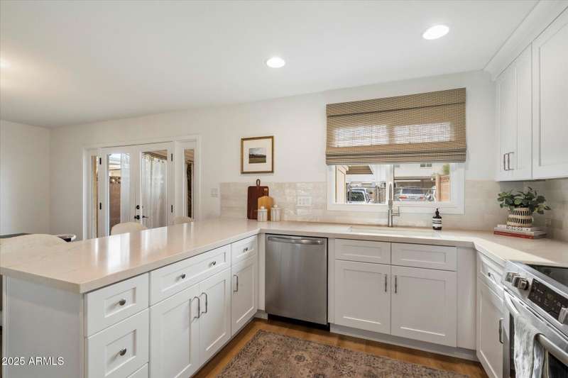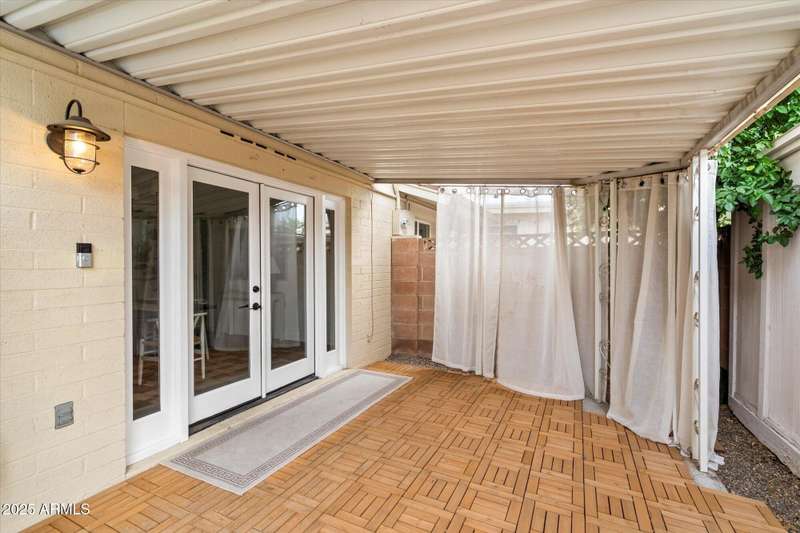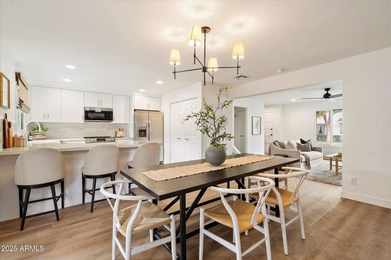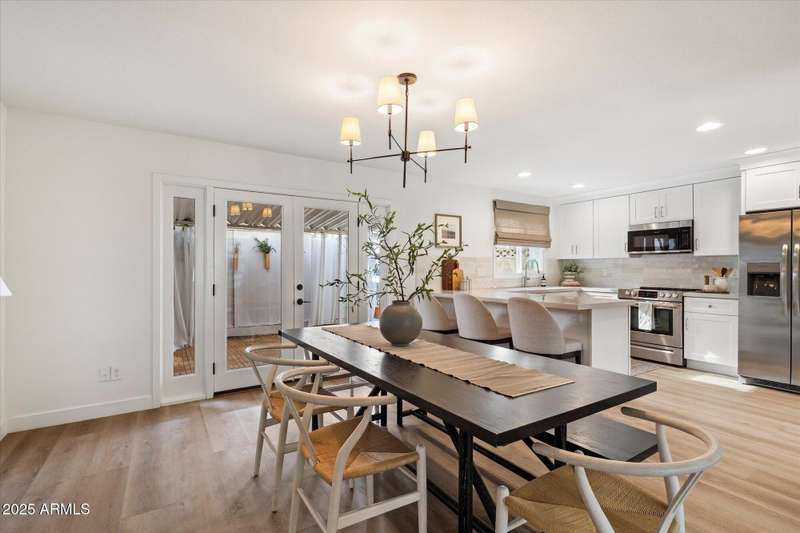 Charming traditional style townhouse is located in the heart of Scottsdale. Close by to parks, walking and biking paths, restaurants and near Old Town Scottsdale. The property has been completely renovated top to bottom with beautiful finishes and a welcoming spacious open concept floor plan. The main level of the home features an entry foyer, living room, hall to coat closet and powder bath, dining room, full kitchen and laundry adjacent. Second floor has 4 bedrooms including a primary suite, open hallway to secondary bedrooms, hall bathroom and linen closet. French doors off the dining room lead to the private and spacious outdoor patio which is equipped with new gravel, metal shade awning, citrus tree for shade, outdoor storage shed and 2 reserved covered parking