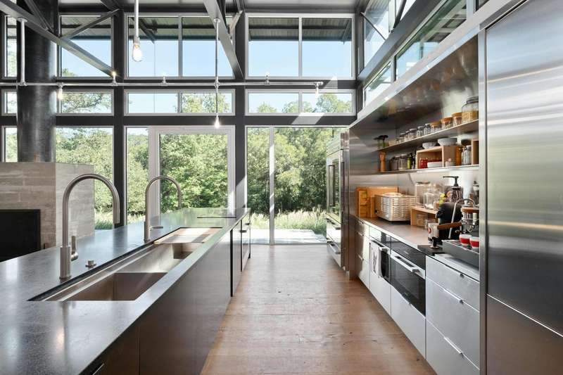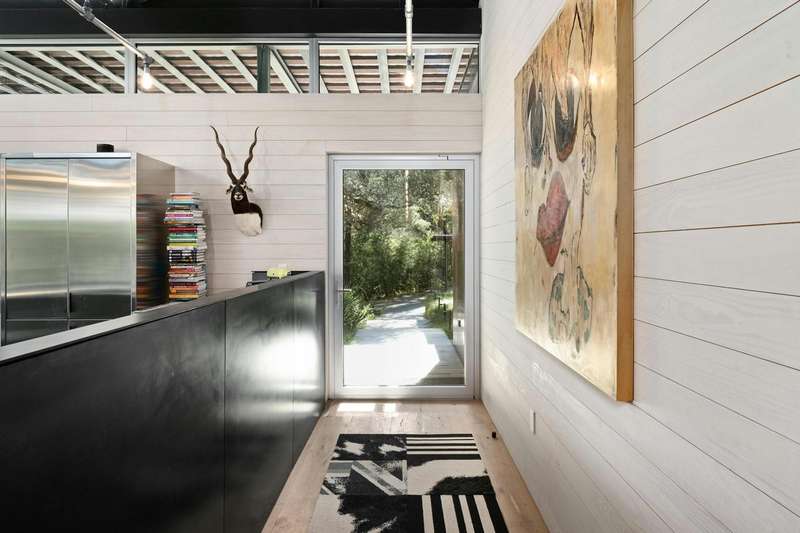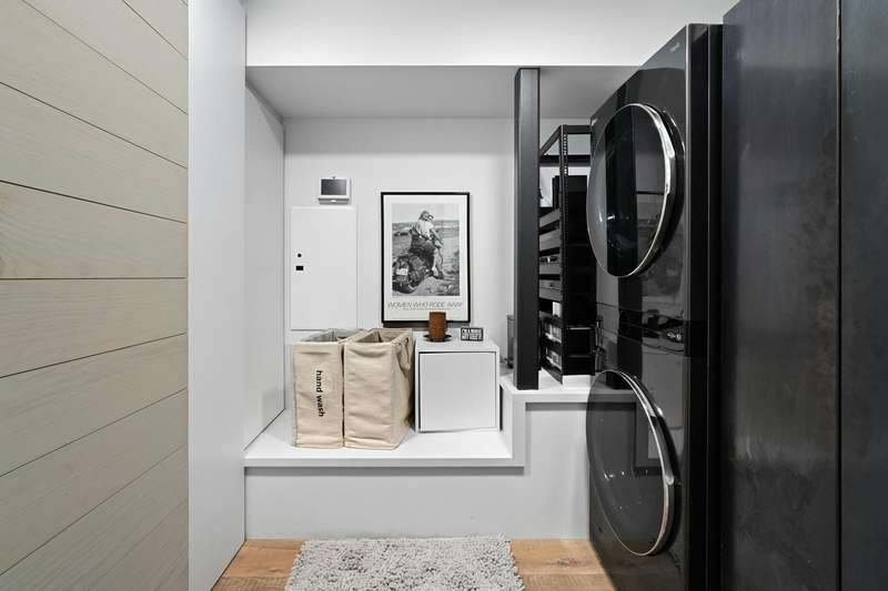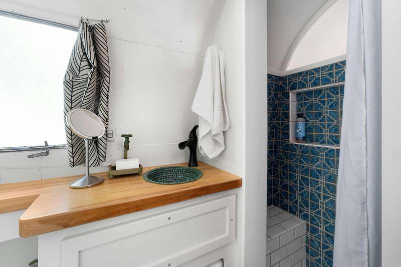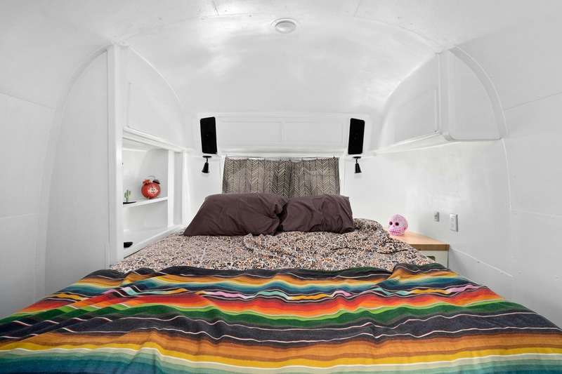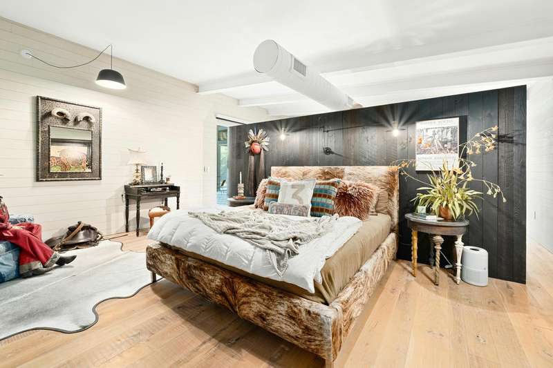 The former workshop shed was converted to a detached lounge area that could also serve as a guest casita that ensures privacy and comfort for visitors. In addition to the guest accommodation, the residence includes a meticulously finished Airstream, for additional space to host family or friends for an overnight stay. The outdoor experience is equally impressive, with a newly redone pool, sleek fire pit, and a dog run outfitted with astro turf. The landscaping, designed by Word + Carr Design, enhances the serene atmosphere, while the new path lights and brick pavers add a touch of sophistication to the grounds.