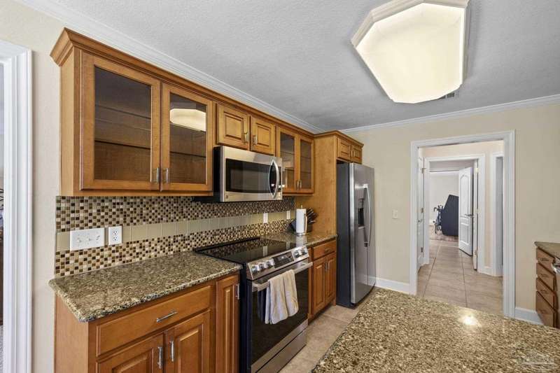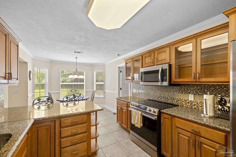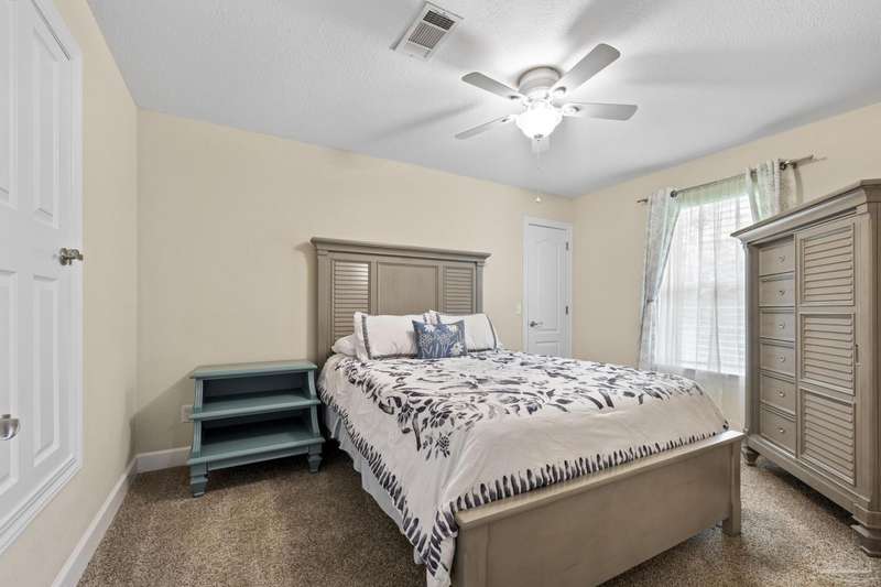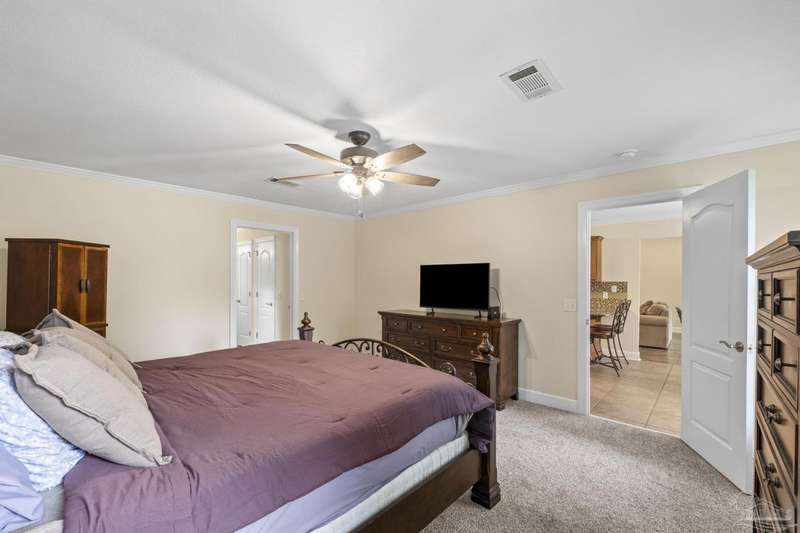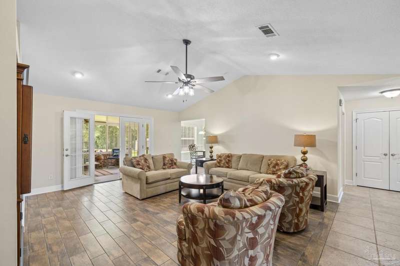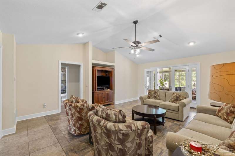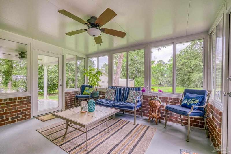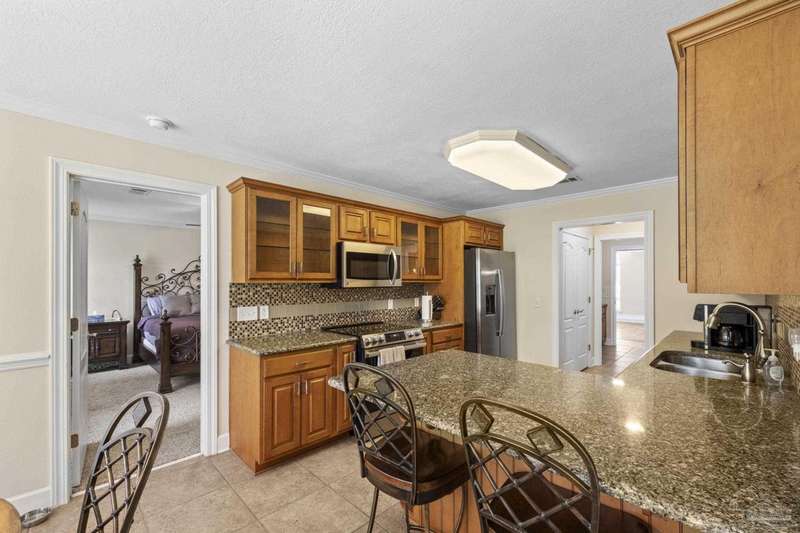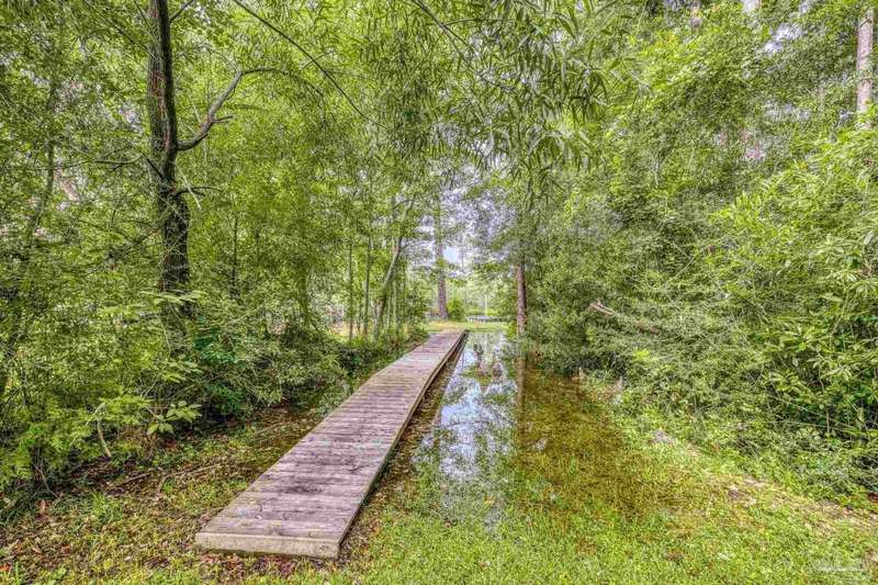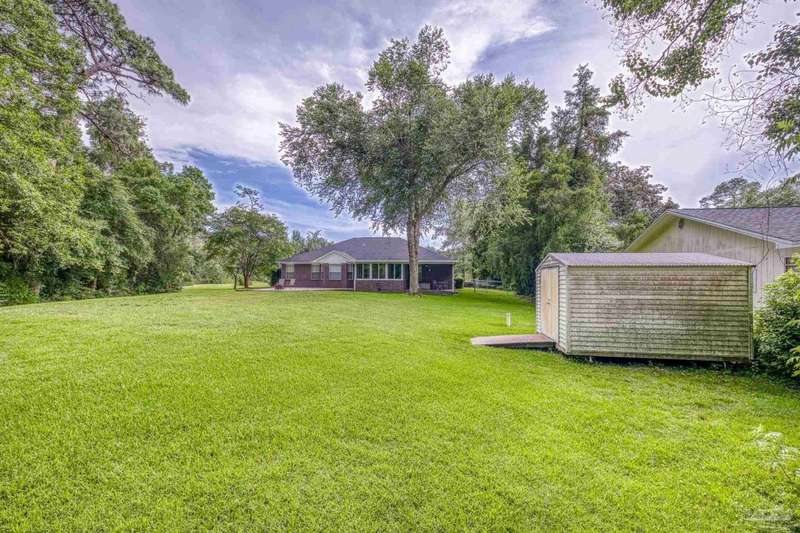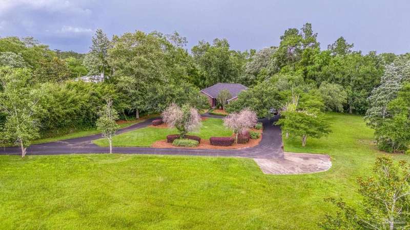 Nestled in the heart of Milton, Florida, this exceptional 9.84-acre estate comprises four contiguous parcels, offering unparalleled privacy and direct access to both Lake Kilburn and Pond Creek. With over 1,000 feet of combined waterfrontage, this property presents a rare opportunity for those seeking a tranquil retreat with convenient proximity to local amenities. The residence features a spacious 4-bedroom, 2-bathroom home designed for comfort and style. A welcoming front porch with an intricate glass front door leads into a bright and airy living room, complemented by high ceilings and abundant natural light. The versatile floor plan includes a large family room, den, or flex space, providing ample room for relaxation or entertainment. The updated kitchen boasts beautiful wood cabinetry with glass inserts, granite countertops, a dry bar area with a granite and tile backsplash, and new stainless steel appliances. Adjacent to the kitchen, the dining area offers scenic views of the lush, landscaped surroundings. The master suite serves as a private sanctuary, featuring a jetted soaking tub, separate shower, double vanity, and two walk-in closets. Three additional bedrooms, each with walk-in closets, ensure ample storage and personal space for family or guests. Outdoor living is enhanced by a climate-controlled sunroom, providing year-round enjoyment of the serene landscape. A walkway leads directly to the deep water of Pond Creek, offering navigable access to Blackwater Bay for boating and water activities. The property is further complemented by a circular driveway, carport, and updated ceiling fans and fixtures throughout. This estate combines the tranquility of waterfront living with the convenience of being centrally located in Milton. Whether you're seeking a private retreat or a place to entertain, this property offers endless possibilities.