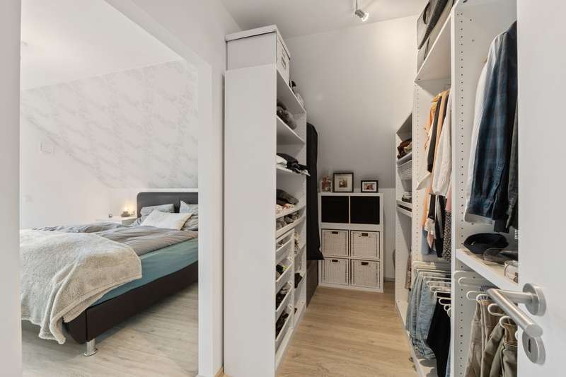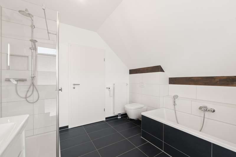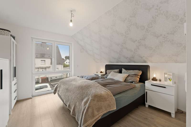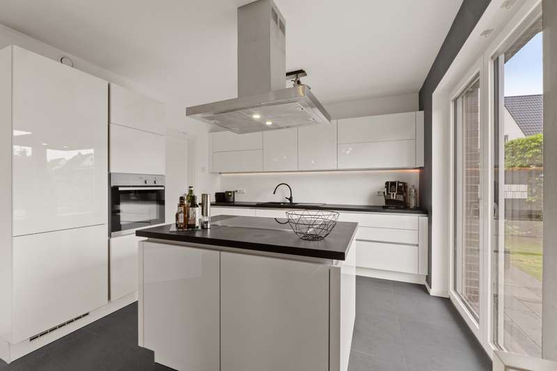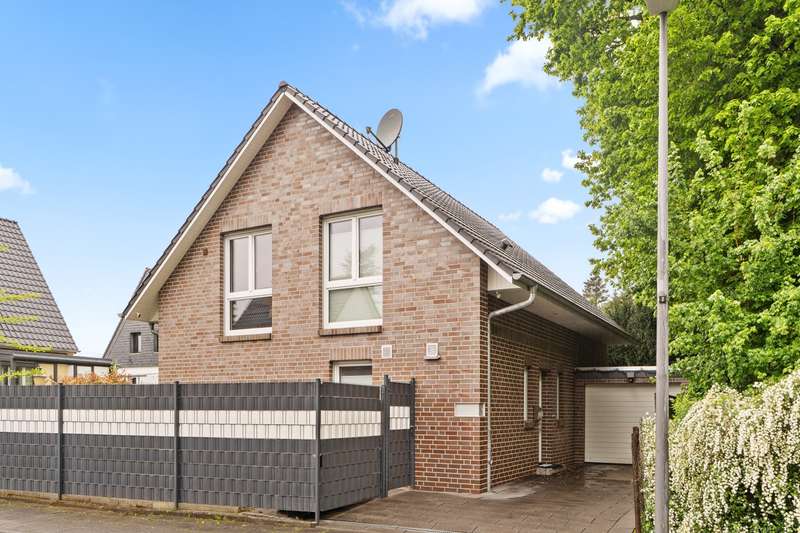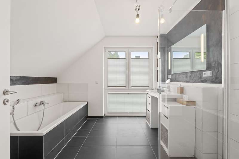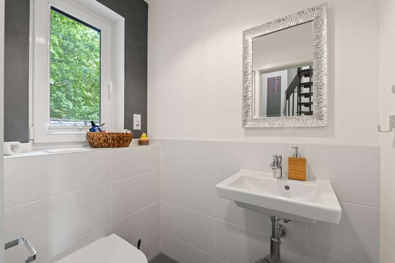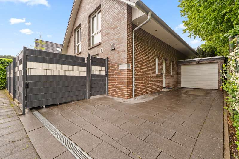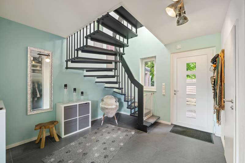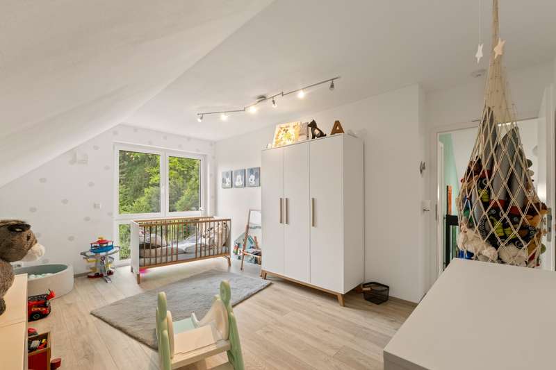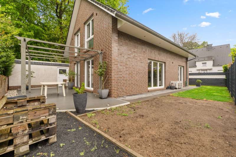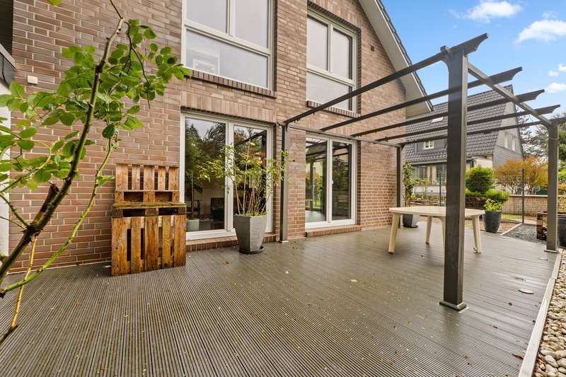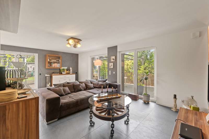 VON POLL IMMOBILIEN presents this modern detached house with garden, terrace and two parking spaces in a quiet residential area of Cologne-Longerich. The house, built in 2015 by the construction company Viebrockhaus, is located on a plot of approx. 295 m² and offers a well thought-out room layout with four rooms and high-quality furnishings on approx. 136 m² of living space. The open-plan living and dining area forms the heart of the house. Large, floor-to-ceiling windows provide plenty of natural light and a friendly living atmosphere. The living area offers direct access to the terrace and the compact, low-maintenance garden, which enjoys sun from morning to evening thanks to the detached design - perfect for relaxing hours outdoors or social evenings with friends. The modern fitted kitchen with central cooking island is openly integrated into the living and dining area and also provides direct access to the garden. On the first floor there is also a separate guest WC and the utility room, which is equipped with a heat pump and ventilation system with heat recovery. The staircase leads to the top floor, which boasts a spacious daylight bathroom with bathtub and shower, a children's room and study as well as another bedroom with adjoining dressing room. All rooms are bright and inviting thanks to the floor-to-ceiling windows. Large-format, easy-care tiles on the first floor underline the modern character and ensure a contemporary aesthetic. The entire house is in a very well-kept condition and impresses with its modern construction, high-quality materials and the use of renewable energy through a PV system. A garage and two parking spaces directly in front of the house ensure convenient parking right next to your own home. Have we piqued your interest? Feel free to arrange a viewing appointment and see this charming detached house with its high quality of living for yourself.