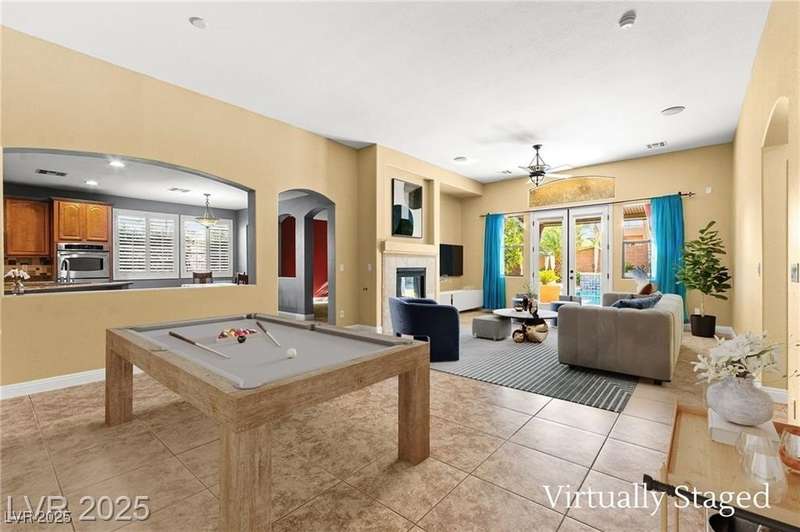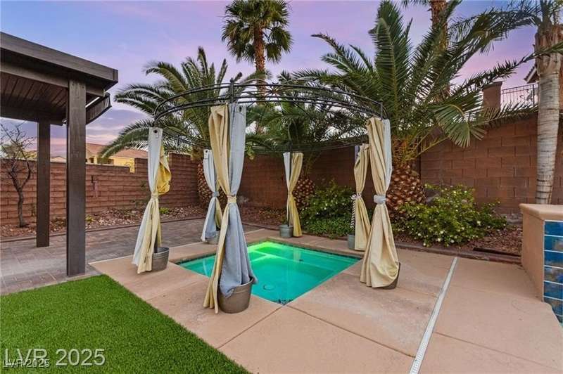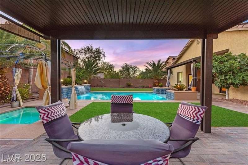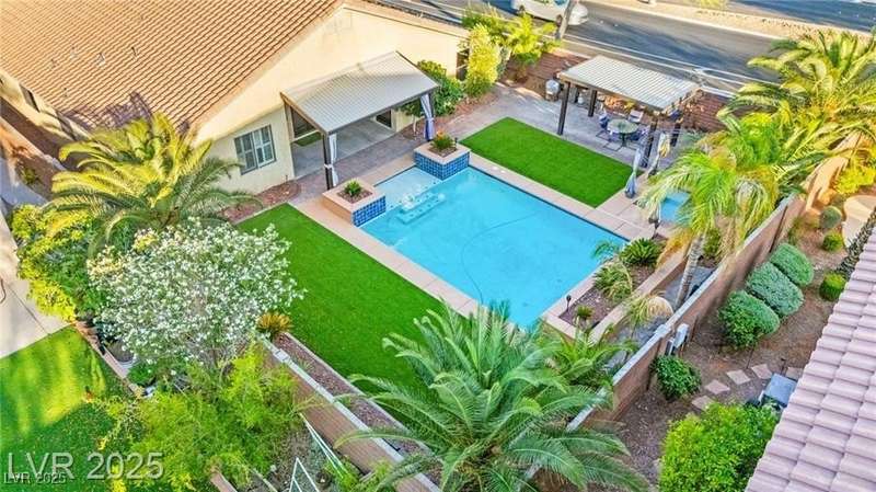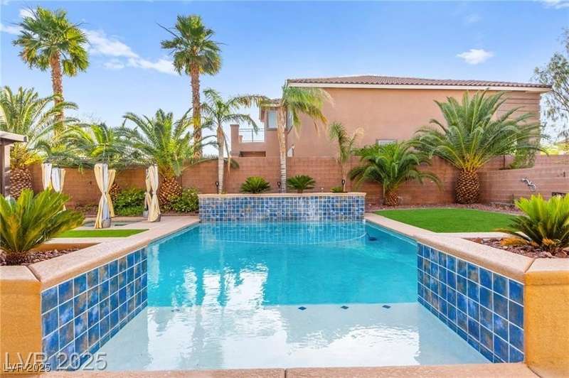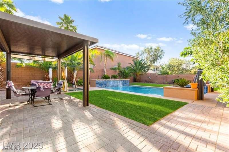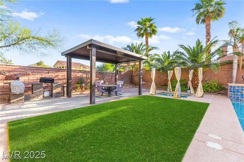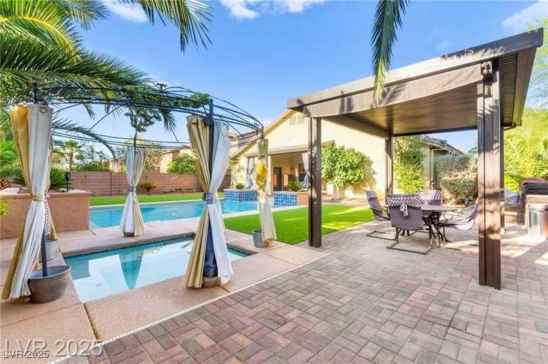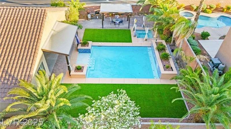 Welcome to this stunning single-story home on a spacious corner lot in the desirable gated community of Mountains Edge. This well-maintained residence features an open-concept floor plan perfect for modern living and entertaining. Step into your private backyard oasis—complete with mature trees, manicured landscaping, a sparkling pool, separate spa, shaded seating, and a fully equipped outdoor kitchen. Ideal for relaxing weekends or gatherings with friends and family. Inside, you'll find four spacious bedrooms, two and a half bathrooms, a formal living room, and a separate family room for added flexibility. The chef’s kitchen shines with stainless steel appliances and ample space to cook, dine, and entertain. Energy-saving solar panels offer long-term value and lower utility costs. This home is the perfect blend of comfort, style, and functionality—don’t miss your chance to make it yours!