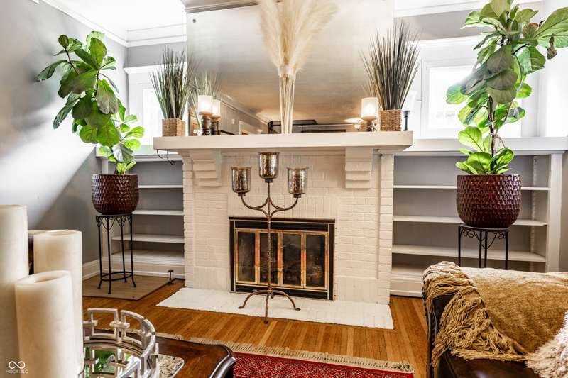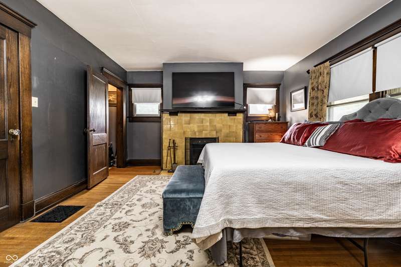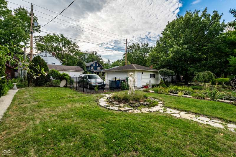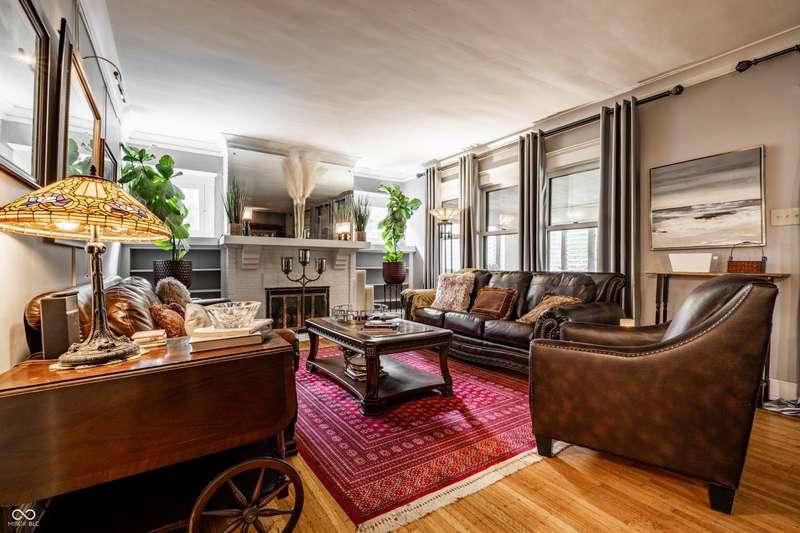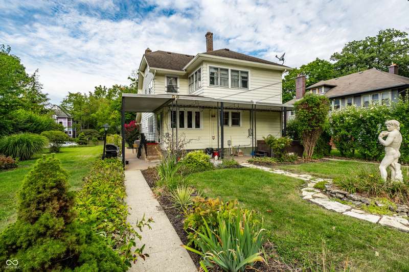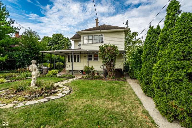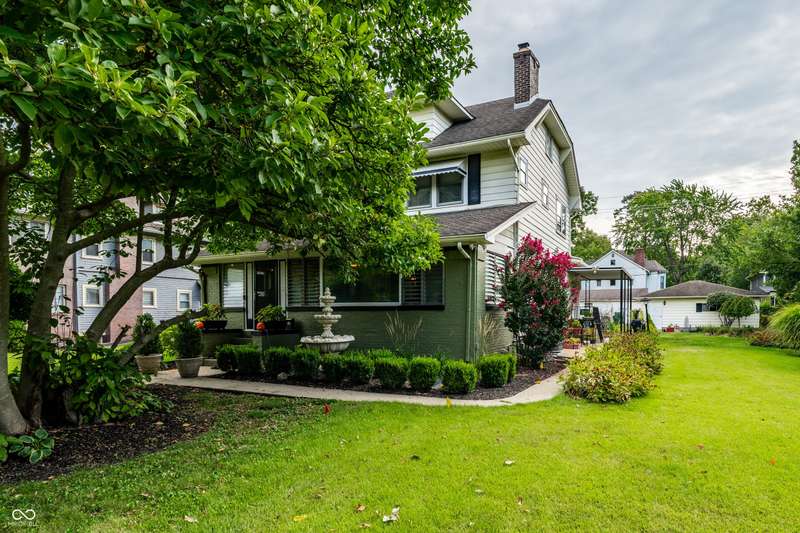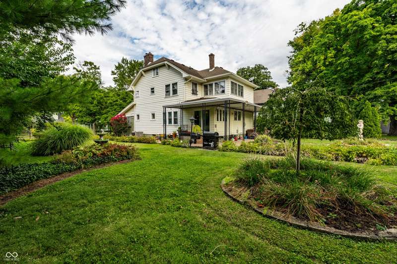 Welcome to Woodruff Place-the first platted subdivision in Indianapolis and one of the city's most beloved neighborhoods! Statuary, magnificent fountains, landscaped esplanades, and towering trees create a timeless setting less than 10 blocks from downtown. This charming residence on a rare double lot blends historic character with thoughtful updates. A glass-enclosed front porch invites you to savor morning coffee or evening wine while taking in the beauty of the neighborhood. Inside, original hardwood floors and period details set the stage. The formal living room is anchored by a striking fireplace flanked by built-in bookshelves, creating a warm, inviting centerpiece. The updated eat-in kitchen is the heart of the home, ideal for everyday living or entertaining. It flows seamlessly to a spacious covered patio overlooking the beautifully landscaped rear and side yards. The main-floor primary suite-a sought-after feature-includes a full bath and a Rookwood tile fireplace for added charm. Upstairs, you'll find three generous bedrooms and a second full bath, along with two staircases for added character and convenience. The third level offers another bedroom plus a versatile family room, studio, or creative space, along with ample storage. The lower level provides even more storage, laundry hook-ups, and a half bath. Completing this exceptional property is a two-car detached garage. As part of a designated historic district under the Indianapolis Historic Preservation Commission, this home offers not only style and space but also a place in one of the city's most treasured neighborhoods.