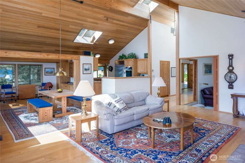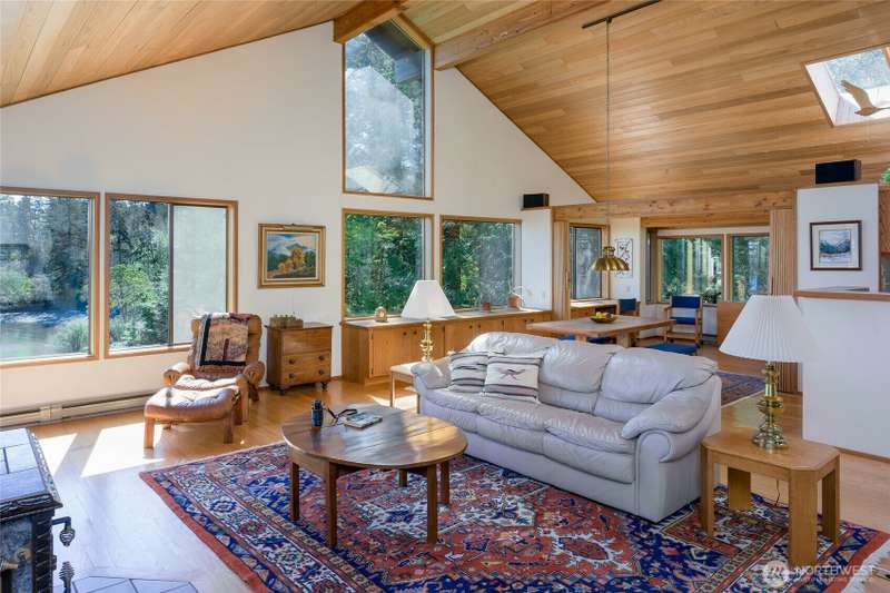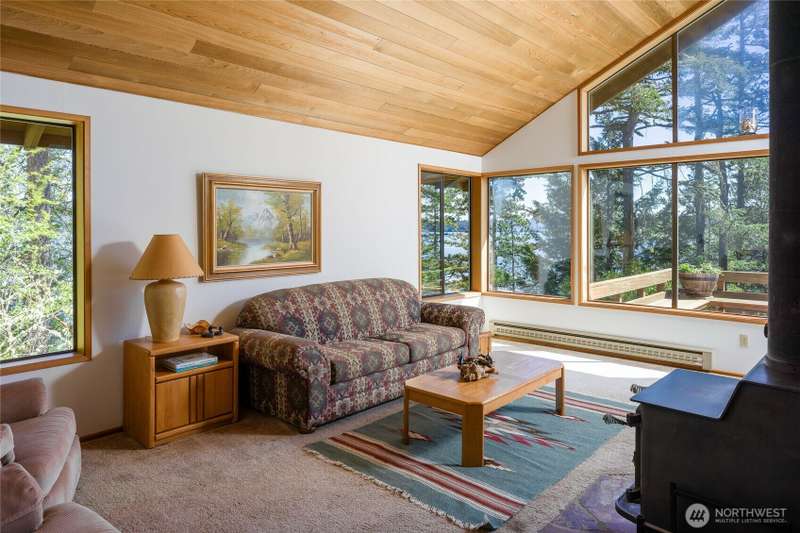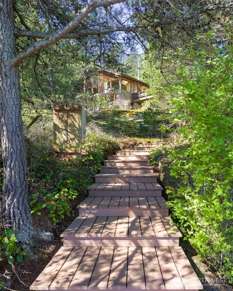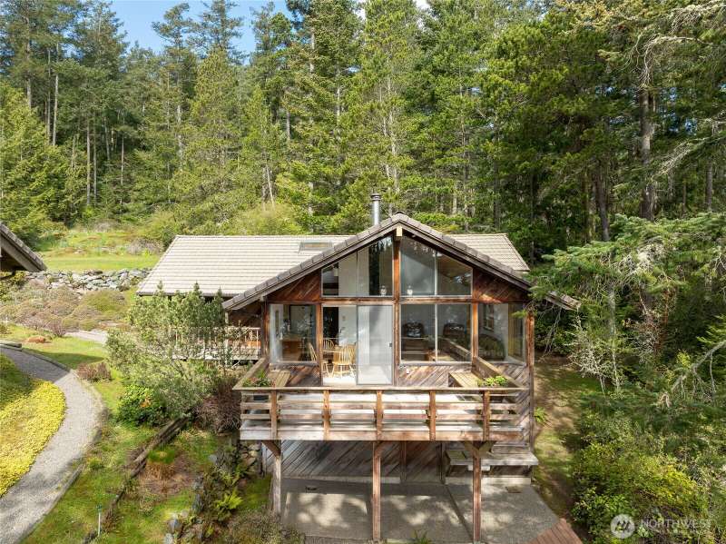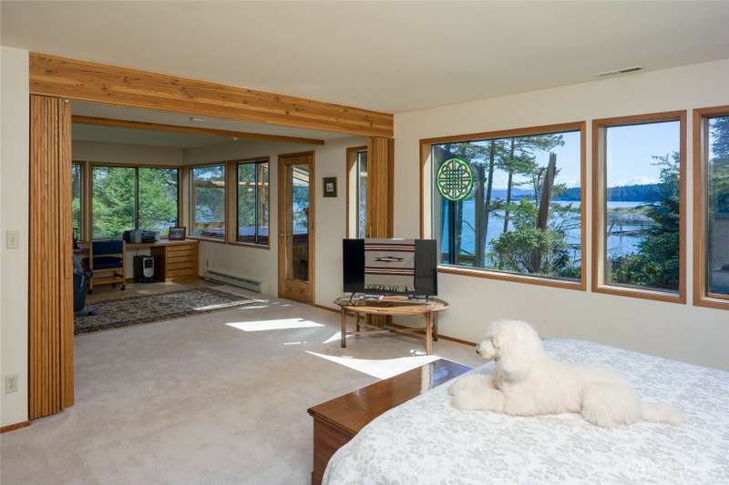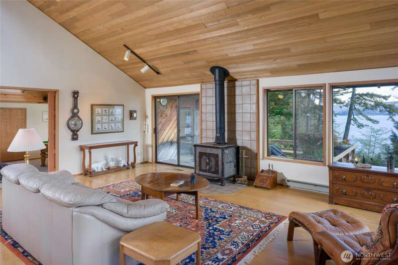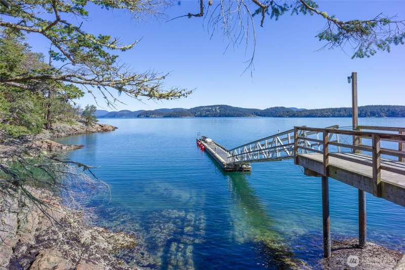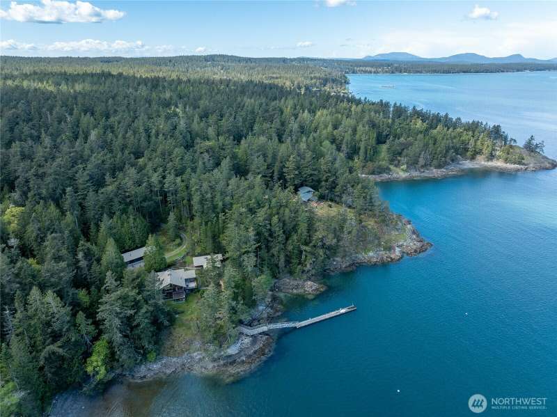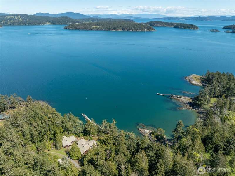 Generational Living At It's Best with 2 houses on 440+ feet of waterfront with deep water dock share & buoy. Vaulted ceilings, clear fir trim, oak floors, tons of built-ins, 2 woodstoves & flexible spaces. Downstairs spacious primary suite with office & hot tub room. Both houses have view decks with enviable panoramas to wile away an afternoon. Second home has 2 bedrooms & 2 baths. Detached 2 car garage with separate shop & wood storage. 17+ acres incl terraced waterfront, rocky outcrops, mature woods & sunny pasture. Set on 3 separate tax parcels which adds to future flexibility. Close to Lopez Hill trails.