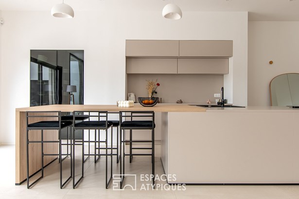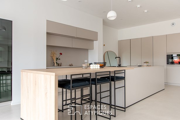 The entrance is through a fitted vestibule, which gives access to the imposing living room of more than 80 sqm. This is bathed in light, in particular thanks to its large bay windows, and consists of a lounge area as well as a fitted and equipped kitchen with its central island and its dining area.