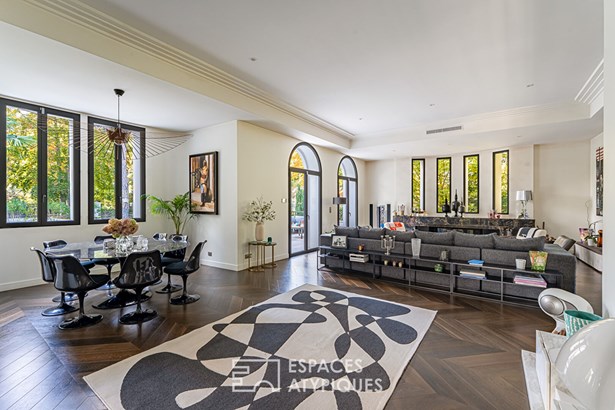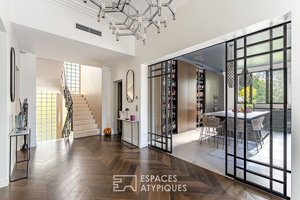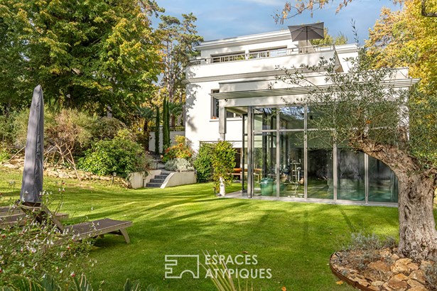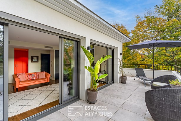 Just minutes from the center of Rueil-Malmaison, nestled in the highly sought-after Hameau de la Jonchere, a private and secure estate bordered by the Saint-Cucufa forest, this exceptional residence offers a rare living experience: that of a contemporary home where refinement blends with the serenity of nature.