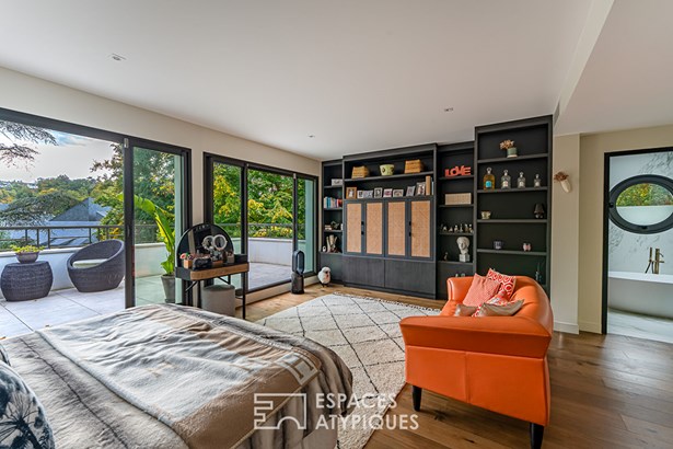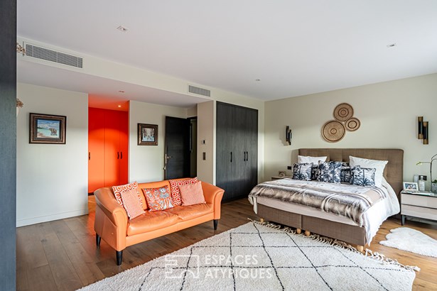 Upstairs, the master suite opens onto a private terrace, a custom-made dressing room, and a refined bathroom with a walk-in shower. Two other bedrooms, each with their own shower room or bathroom, one of which has a terrace, make up this intimate level.