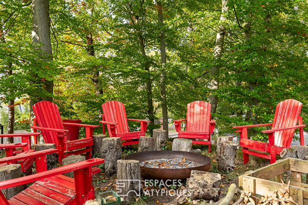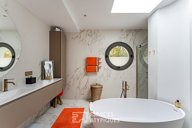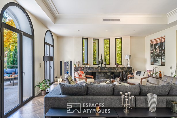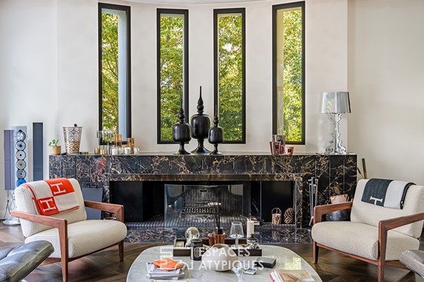 Inside, the volumes unfold gracefully. The 80 sqm reception area opens onto large bay windows that let in light and the surrounding nature. The marble fireplace is its vibrant heart, bringing family and friends together in a warm atmosphere.