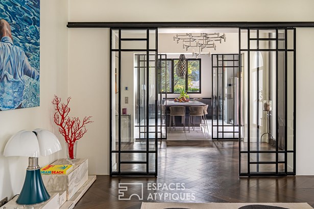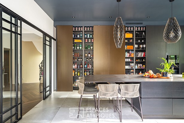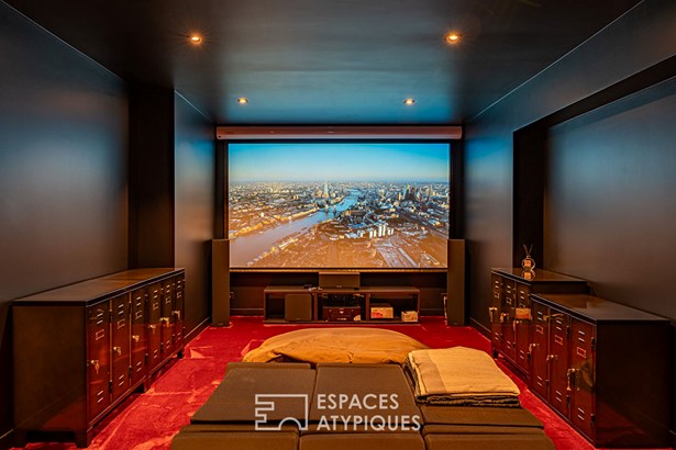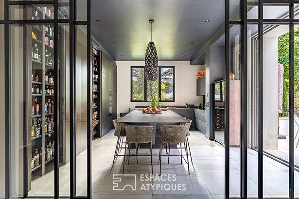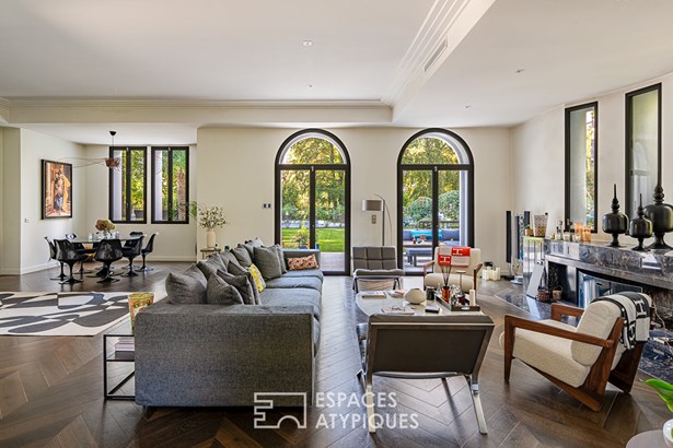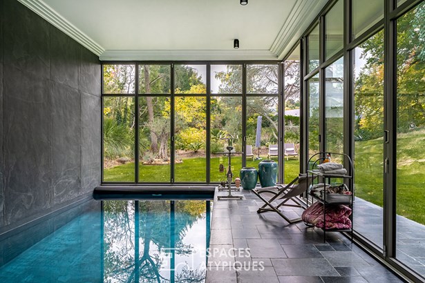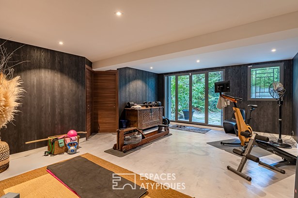 The garden level, designed for well-being and conviviality, houses a gym, a cinema room, a wellness area with sauna and hammam, a swimming pool with counter-current swimming whose large bay windows open entirely onto the garden to form a single space.