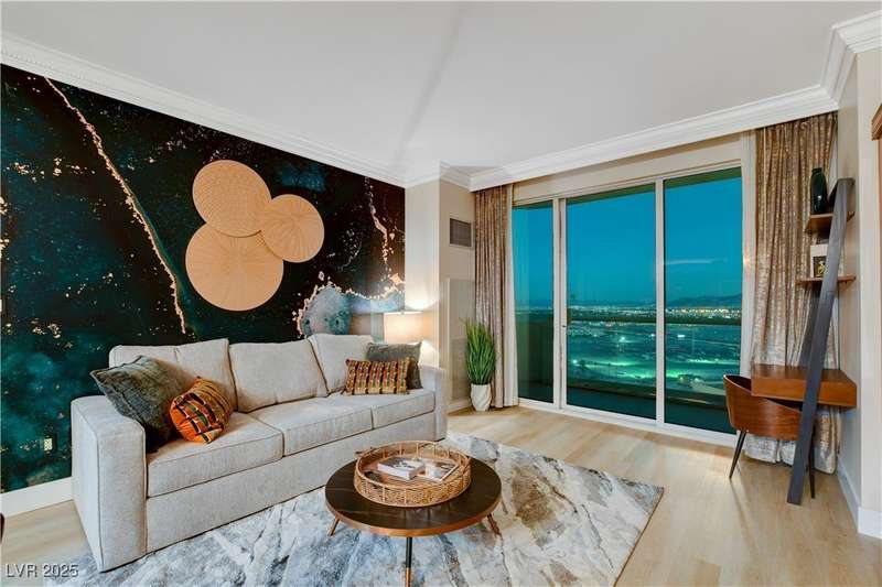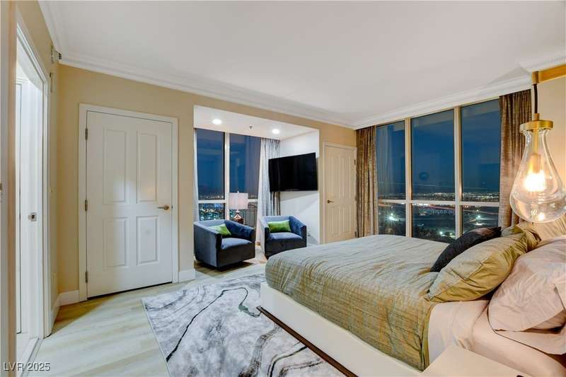 Beautifully RENOVATED 1-bedroom, 2-bathroom condo offers an unparalleled blend of luxury, comfort, and convenience in a prestigious high-rise setting. Overlooking the MGM Grand pool and partial view of MGM Grand. This unit features vinyl plank flooring, custom paint, and modern light fixtures. Offers breathtaking view of the Sphere from the secondary glass window. The ensuite bathroom boasts a luxurious spa-like experience, complete with a soaking tub, separate shower, and dual vanity sinks. INCOME PRODUCING LICENSED VACATION RENTAL. Definitely a must see!