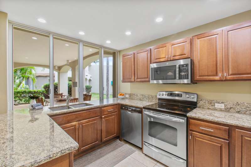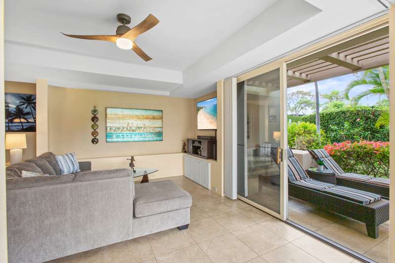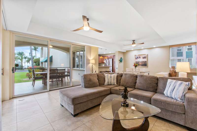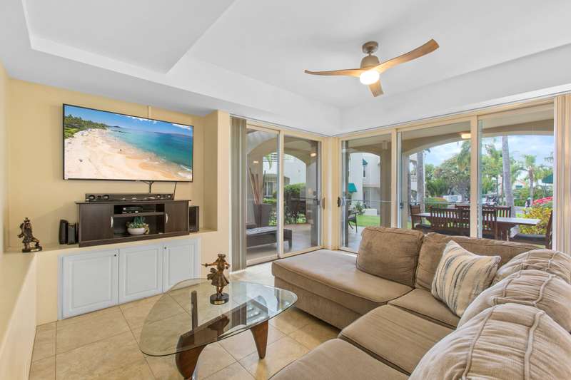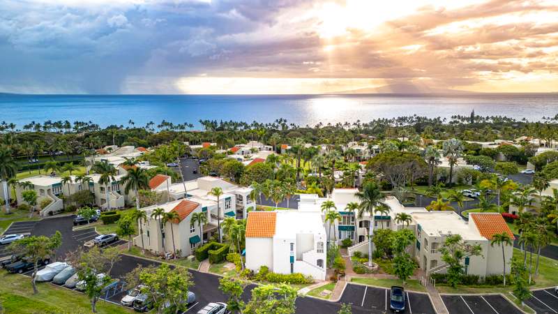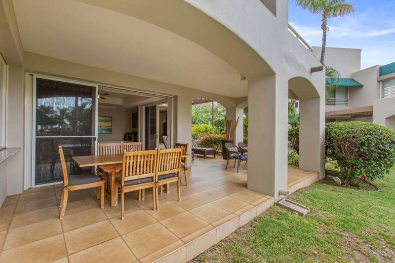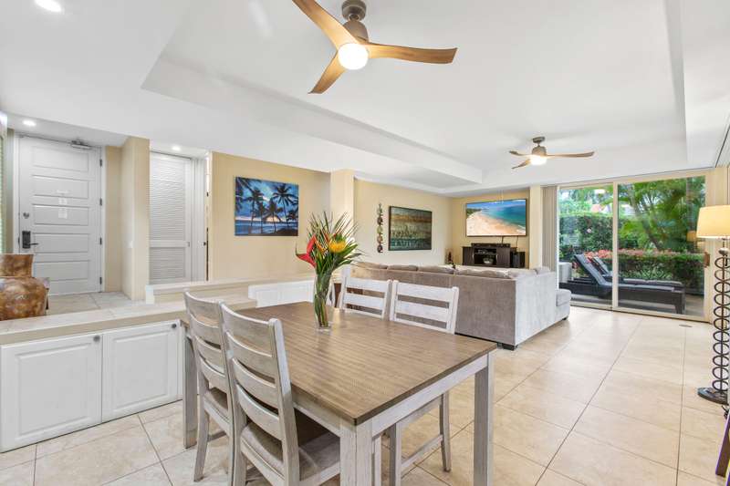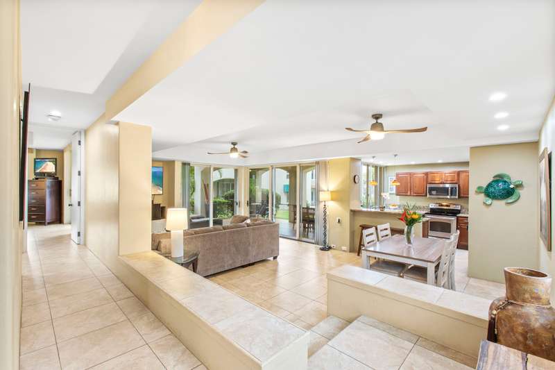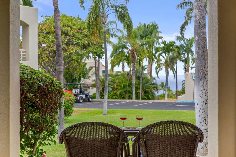 Nestled on the top row of The Palms at Wailea and tucked away from road noise, Palms 307 offers a peaceful slice of paradise—with a bit of ocean view... Whether you're looking for a vacation escape or an investment in Maui’s coveted resort community, this unit is clean, stylish, and move-in ready—offering comfort, value, and a touch of luxury. This light-filled unit welcomes you with an open floor plan and a spacious sunken living area that functions beautifully as a great room. The layout is ideal for relaxing or entertaining, with room to gather and a pullout sofa for practicality. Step out onto the private lanai and take in a peek of the ocean—just enough to remind you how close you are - and that you are living the island dream. The kitchen is well-equipped with granite counters, stainless steel appliances, and a brand-new refrigerator. The pass-through window to the lanai is perfect for serving pupus or a full island feast. The primary suite is a true retreat, featuring a king-sized bed, a new split a/c, and the attached bathroom with dual sinks, and a whirlpool tub. The guest bathroom is equally impressive, finished in travertine tile with a gorgeous walk-in shower. Surrounded by lush tropical landscaping, The Palms at Wailea is a beautifully maintained, low-density complex that's just a short stroll to the beach and world-class amenities. Spa, dining and island activities are all at your fingertips. Priced attractively compared to others in the complex, this unit is an invitation to live your Maui legacy—embrace the lifestyle, the warmth, and the aloha.