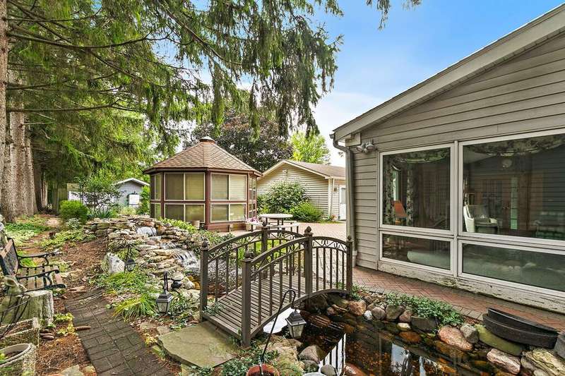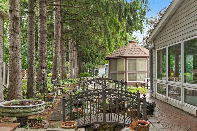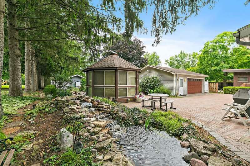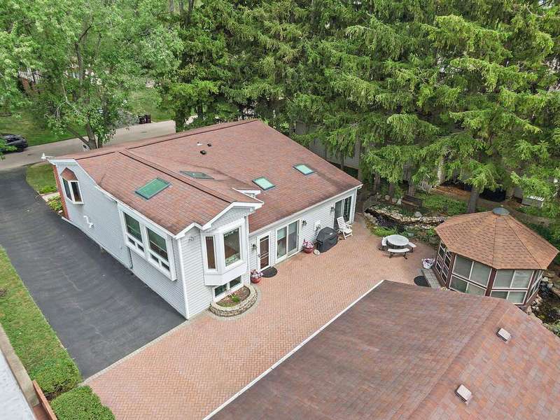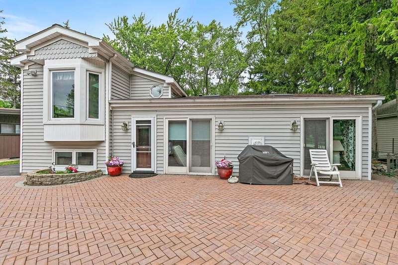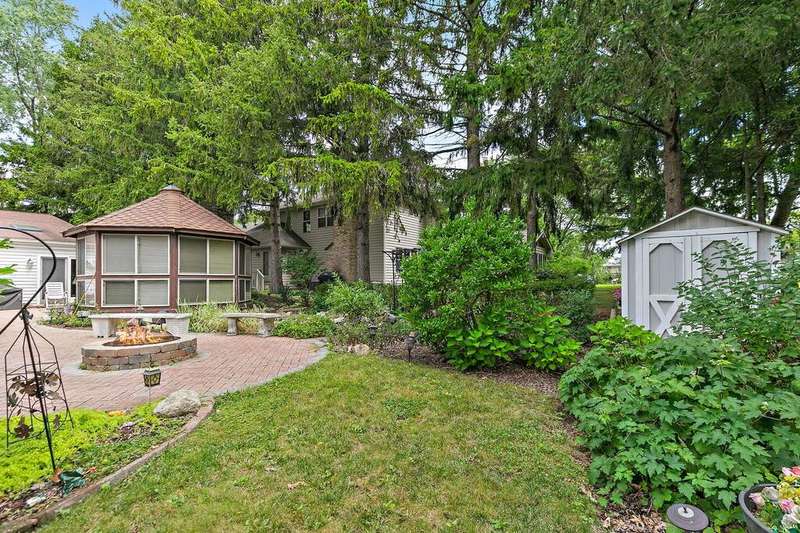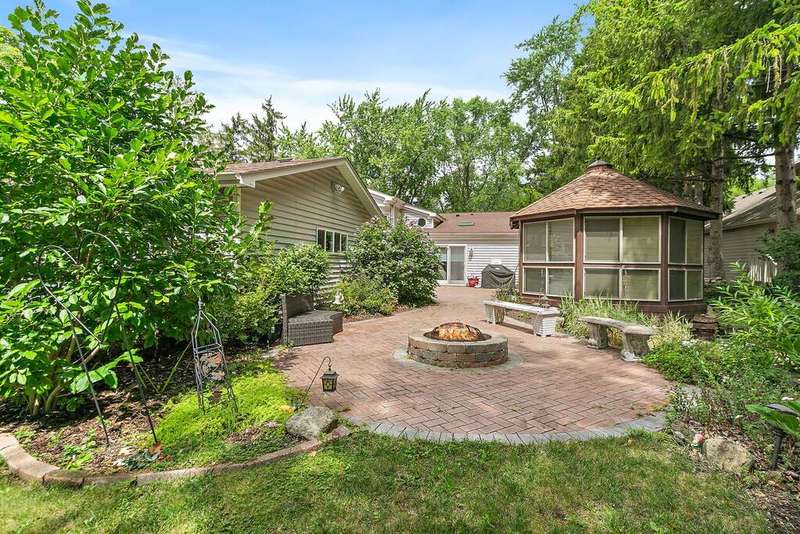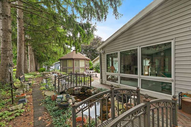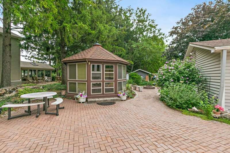 Lovingly cared for by the original owners, this home blends thoughtful updates with timeless charm in a truly beautiful neighborhood of both older and newer homes. A well-planned 1995 addition expanded the kitchen and added a bright, sunny breakfast room along with a wonderful family room featuring walls of windows overlooking the serene backyard, deck, and tranquil koi pond with a waterfall. The versatile floor plan offers four spacious bedrooms-two on the main level and two in the lower level-making it perfect for multi-generational living, teen space, in-law, and perfect for adult kids as well who want a separate space. The lower level also features a cozy gas-start fireplace in the family room, an electric fireplace in one of the bedrooms, and a beautifully updated bathroom (2015). Upstairs, the living room showcases a decorative fireplace, adding to the home's warmth and character. The updates include a new roof and all new Marvin windows in 2014, a newer air conditioner and furnace in 2021, and siding replacement in 2005. Outdoor living shines with a large brick paver patio, a welcoming fire pit, a stunning gazebo built in 2014, and vibrant, well-tended gardens. Enjoy lake and beach access, proximity to shopping and conveniences, a charming downtown area with dining options, parks, and the new Lifetime Fitness center. Highly rated District 95 schools. With its spacious layout, scenic views, and prime location, this home is a rare find.